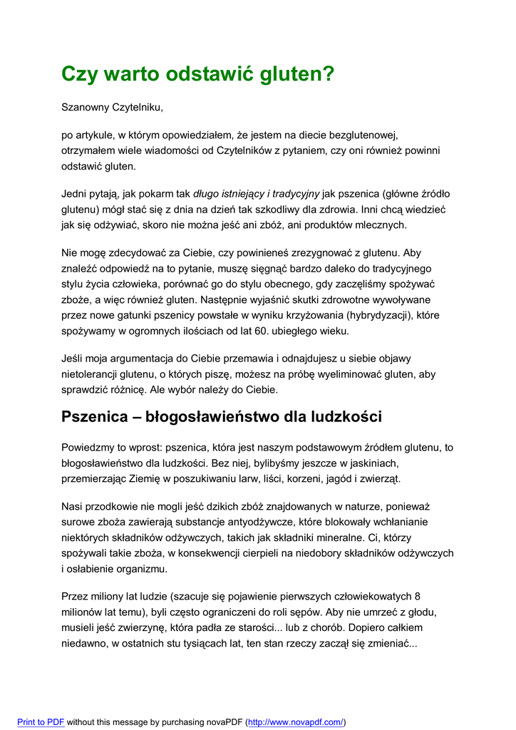 Czy warto odstawić gluten? Szanowny Czytelniku, po artykule, w którym opowiedziałem, że jestem na diecie bezglutenowej, otrzymałem wiele wiadomości od Czytelników z pytaniem, czy oni również powinni odstawić gluten. Jedni pytają, jak pokarm tak długo istniejący i tradycyjny jak pszenica (główne źródło glutenu) mógł stać się z dnia na dzień tak szkodliwy dla zdrowia. Inni chcą wiedzieć jak się odżywiać, skoro nie można jeść ani zbóż, ani produktów mlecznych. Nie mogę zdecydować za Ciebie, czy powinieneś zrezygnować z glutenu. Aby znaleźć odpowiedź na to pytanie, muszę sięgnąć bardzo daleko do tradycyjnego stylu życia człowieka, porównać go do stylu obecnego, gdy zaczęliśmy spożywać zboże, a więc również gluten. Następnie wyjaśnić skutki zdrowotne wywoływane przez nowe gatunki pszenicy powstałe w wyniku krzyżowania (hybrydyzacji), które spożywamy w ogromnych ilościach od lat 60. ubiegłego wieku. Jeśli moja argumentacja do Ciebie przemawia i odnajdujesz u siebie objawy nietolerancji glutenu, o których piszę, możesz na próbę wyeliminować gluten, aby sprawdzić różnicę. Ale wybór należy do Ciebie. Pszenica – błogosławieństwo dla ludzkości Powiedzmy to wprost: pszenica, która jest naszym podstawowym źródłem glutenu, to błogosławieństwo dla ludzkości. Bez niej, bylibyśmy jeszcze w jaskiniach, przemierzając Ziemię w poszukiwaniu larw, liści, korzeni, jagód i zwierząt. Nasi przodkowie nie mogli jeść dzikich zbóż znajdowanych w naturze, ponieważ surowe zboża zawierają substancje antyodżywcze, które blokowały wchłanianie niektórych składników odżywczych, takich jak składniki mineralne. Ci, którzy spożywali takie zboża, w konsekwencji cierpieli na niedobory składników odżywczych i osłabienie organizmu. Przez miliony lat ludzie (szacuje się pojawienie pierwszych człowiekowatych 8 milionów lat temu), byli często ograniczeni do roli sępów. Aby nie umrzeć z głodu, musieli jeść zwierzynę, która padła ze starości... lub z chorób. Dopiero całkiem niedawno, w ostatnich stu tysiącach lat, ten stan rzeczy zaczął się zmieniać... Print to PDF without this message by purchasing novaPDF (http://www.novapdf.com/) Wielkie odkrycia, które zmieniły wszystko Około 100 tys. lat temu warunki życia człowieka zaczęły się znacznie poprawiać. Z jednej strony, człowiek zaczął posługiwać się włócznią, harpunem i siecią, które umożliwiły mu (nareszcie!) jedzenie świeżego mięsa i ryb w większych ilościach. Z drugiej strony, odkrył gotowanie zbóż, co znacznie zredukowało działanie substancji antyodżywczych1. Jednakże chodziło tylko i wyłącznie o zboża rosnące w naturze. Człowiek nie umiał ich uprawiać. Dopiero 15 tys. lat temu miały miejsce pierwsze próby uprawiania pszenicy (bez wątpienia to pierwsze zboże „udomowione” przez człowieka) i... niedługo potem wstrzymane. Życie rolnicze trudniejsze niż życie wędrowne Szybko okazało się, że uprawianie żywności wiązało się z dużo większą niepewnością niż wędrowny styl życia. Jakby nie patrzeć, zasady rolnictwa nie są wcale takie proste. Tak jak mój pięcioletni synek, mimo dobrych rad od taty, próbuje właśnie „uprawiać kiełbasę” w naszym ogródku, po uprzednim włożeniu do ziemi kawałka białej kiełbaski. Całe szczęście, że nie od tego zależy przetrwanie mojego dziecka... Cóż, nasi przodkowie nieustannie byli osaczani przez wrogie plemiona: 30% naszych przodków zamordowano (dla porównania podczas wojen światowych i dyktatur socjalistycznych zginęło 3% populacji całego świata). Nawet dzisiaj jeszcze, od plemion Kung na pustyni Kalahari, w południowej Afryce, poprzez Aborygenów w Australii aż po ludy Inuitów z Arktyki, 2/3 współczesnej ludności zbieracko-łowieckiej żyje w stanie permanentnej wojny. 90% żyje w stanie wojny co najmniej raz w roku. Statystycznie jedna kobieta jest uprowadzana i gwałcona przez obce plemię trzykrotnie w swoim życiu! Wykarczowanie terenu, zaoranie, zasadzenie, a następnie zebranie plonów wymaga spokoju i bezpieczeństwa. Poza tym, nawet zakładając, że nasi przodkowie mieli ziarna i żyli w stanie pokoju, trudno im było zostać w jednym miejscu wystarczająco długo, aby ziarna wzrosły. Ich styl życia polegał na tym, że kiedy plemię przybywało w jedno miejsce, wyjadało wszystko, co znajdowało się w pobliżu. Nie było żadnej możliwości magazynowania. Jeśli ktoś coś zasadził, to w czasie, gdy nadchodziła pora zbioru, plemienia już tam dawno nie było. Print to PDF without this message by purchasing novaPDF (http://www.novapdf.com/) Dodatkowo liczba roślin uprawnych była bardzo uboga: mały orkisz, stare formy owsa i jęczmienia. Dieta pierwszych rolników była więc bardziej uboga niż dieta Nomadów, a ich zdrowie dużo gorsze. Rolnictwo szkodliwe dla zdrowia Wraz ze spożywaniem uprawnych zbóż pojawiły się liczne, nieznane dotąd choroby (np. osteoporoza, cukrzyca), które wynikały z niedoborów składników odżywczych w pożywieniu. Zboża są bardzo kaloryczne, ponieważ zawierają skrobię, która w kontakcie ze śliną i enzymami trawiennymi przekształca się w glukozę. Po ich spożyciu następuje gwałtowny wzrost poziomu cukru we krwi. Kiedy ten wysoki poziom cukru dotrze do mózgu, pobudza te same obszary przyjemności i uzależnienia co ... narkotyki. To wyjaśnia miejsce, jakie zajęły zboża i produkty zbożowe w naszym współczesnym odżywianiu. Na dłuższą metę skoki poziomu cukru są dla organizmu szkodliwe: przyspieszają procesy starzenia się całego organizmu i sprzyjają powstawaniu cukrzycy. Co więcej, w porównaniu do warzyw i owoców, nasion czy korzeni, zboża są ubogie w witaminy i składniki mineralne. Są to „puste” kalorie. Sytuacja zdrowotna ludności rolniczej pogorszyła się jeszcze bardziej wraz z rozwojem hodowli zwierząt, któr