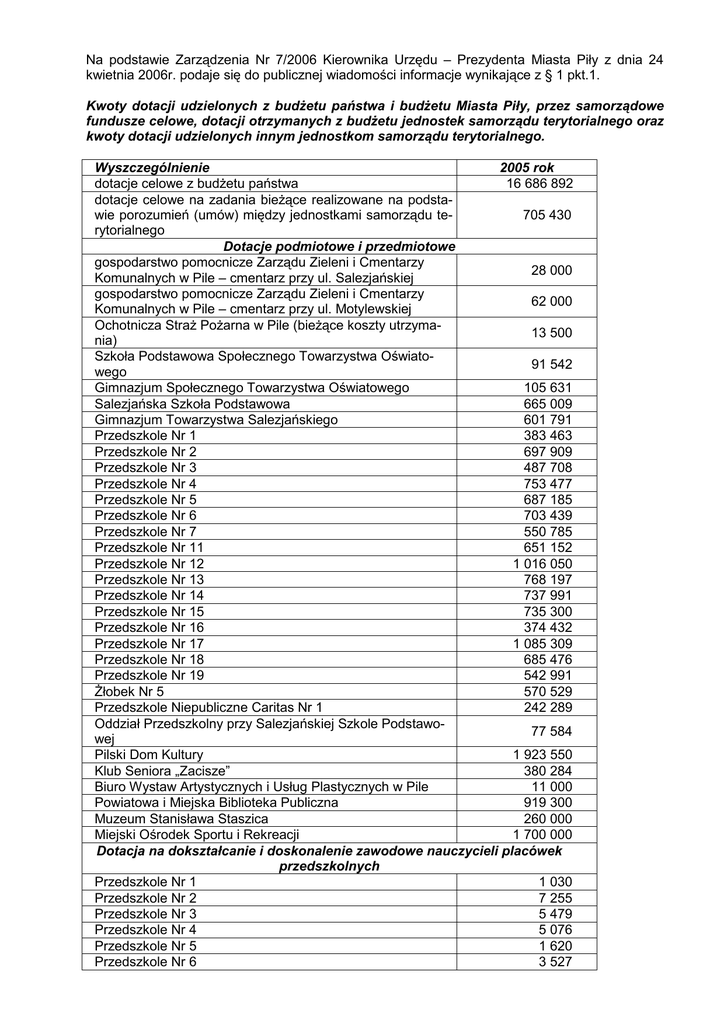 Na podstawie Zarządzenia Nr 7/2006 Kierownika Urzędu – Prezydenta Miasta Piły z dnia 24 kwietnia 2006r. podaje się do publicznej wiadomości informacje wynikające z § 1 pkt.1. Kwoty dotacji udzielonych z budŜetu państwa i budŜetu Miasta Piły, przez samorządowe fundusze celowe, dotacji otrzymanych z budŜetu jednostek samorządu terytorialnego oraz kwoty dotacji udzielonych innym jednostkom samorządu terytorialnego. Wyszczególnienie 2005 rok dotacje celowe z budŜetu państwa 16 686 892 dotacje celowe na zadania bieŜące realizowane na podstawie porozumień (umów) między jednostkami samorządu te705 430 rytorialnego Dotacje podmiotowe i przedmiotowe gospodarstwo pomocnicze Zarządu Zieleni i Cmentarzy 28 000 Komunalnych w Pile – cmentarz przy ul. Salezjańskiej gospodarstwo pomocnicze Zarządu Zieleni i Cmentarzy 62 000 Komunalnych w Pile – cmentarz przy ul. Motylewskiej Ochotnicza StraŜ PoŜarna w Pile (bieŜące koszty utrzyma13 500 nia) Szkoła Podstawowa Społecznego Towarzystwa Oświato91 542 wego Gimnazjum Społecznego Towarzystwa Oświatowego 105 631 Salezjańska Szkoła Podstawowa 665 009 Gimnazjum Towarzystwa Salezjańskiego 601 791 Przedszkole Nr 1 383 463 Przedszkole Nr 2 697 909 Przedszkole Nr 3 487 708 Przedszkole Nr 4 753 477 Przedszkole Nr 5 687 185 Przedszkole Nr 6 703 439 Przedszkole Nr 7 550 785 Przedszkole Nr 11 651 152 Przedszkole Nr 12 1 016 050 Przedszkole Nr 13 768 197 Przedszkole Nr 14 737 991 Przedszkole Nr 15 735 300 Przedszkole Nr 16 374 432 Przedszkole Nr 17 1 085 309 Przedszkole Nr 18 685 476 Przedszkole Nr 19 542 991 śłobek Nr 5 570 529 Przedszkole Niepubliczne Caritas Nr 1 242 289 Oddział Przedszkolny przy Salezjańskiej Szkole Podstawo77 584 wej Pilski Dom Kultury 1 923 550 Klub Seniora „Zacisze” 380 284 Biuro Wystaw Artystycznych i Usług Plastycznych w Pile 11 000 Powiatowa i Miejska Biblioteka Publiczna 919 300 Muzeum Stanisława Staszica 260 000 Miejski Ośrodek Sportu i Rekreacji 1 700 000 Dotacja na dokształcanie i doskonalenie zawodowe nauczycieli placówek przedszkolnych Przedszkole Nr 1 1 030 Przedszkole Nr 2 7 255 Przedszkole Nr 3 5 479 Przedszkole Nr 4 5 076 Przedszkole Nr 5 1 620 Przedszkole Nr 6 3 527 Wyszczególnienie 2005 rok Przedszkole Nr 7 4 490 Przedszkole Nr 11 3 985 Przedszkole Nr 12 8 945 Przedszkole Nr 13 1 810 Przedszkole Nr 14 6 754 Przedszkole Nr 15 6 445 Przedszkole Nr 16 3 265 Przedszkole Nr 17 4 220 Przedszkole Nr 18 3 989 Przedszkole Nr 19 3 569 dotacja dla jednostek organizacyjnych spoza sektora finansów publicznych na realizację zadań Gminy z zakresu pro133 500 mocji miasta Dotacje dla jednostek organizacyjnych spoza sektora finansów publicznych na realizację Gminnego Programu Profilaktyki Pilskie Stowarzyszenie Klubu Abstynentów „Kotwica” 15 000 Stowarzyszenie Pomocy Humanitarnej w Pile 15 000 Stowarzyszenie Monar Wielkopolskie Centrum Pomocy 50 000 Bliźniemu „Markot” w Pile Dom Pomocy Społecznej dla dzieci i Dorosłych im. bł. O.Pio 20 000 Caritas w Pile Centrum Charytatywno-Opiekuńcze p.w. M.B. z Lourdes – 20 000 Caritas w Pile Dotacje dla jednostek organizacyjnych spoza sektora finansów publicznych na zadania z zakresu pomocy społecznej Dom Pomocy Społecznej dla dzieci i Dorosłych im. bł. O.Pio 70 000 Caritas w Pile Stowarzyszenie Monar Wielkopolskie Centrum Pomocy 78 000 Bliźniemu „Markot” w Pile ZHP Chorągiew Wielkopolska, Komenda Hufca w Pile 50 000 Związek Stowarzyszeń Pilski Bank śywności w Pile 8 000 Stowarzyszenie Pomocy Humanitarnej w Pile 3 400 Dotacje dla jednostek organizacyjnych spoza sektora finansów publicznych na realizację zadań z zakresu kultury Fundacja Literacka im. Agnieszki Bartol 3 000 ZHP Chorągiew Wielkopolska, Komenda Hufca w Pile 7 000 Polski Związek Emerytów, Rencistów i Inwalidów, Zarząd 4 000 Okręgowy w Pile Stowarzyszenie Inicjatyw Społecznych „Effata” 3 000 Dotacje dla jednostek organizacyjnych spoza sektora finansów publicznych na realizację zadań z zakresu kultury fizycznej i sportu Pilskie Towarzystwo Piłki Siatkowej „Nafta-Piła” 54 500 Volley Ball Klub Sportowy „Joker” w Pile 54 500 Klub Sportowy „Gwda” w Pile 61 000 Klub Sportowy „Gwardia” w Pile 56 000 Miejski Klub Sportowy 1999 Piła 20 000 Wojskowy Klub Sportowy „Sokół” w Pile 15 000 Strzelecki lub Sportowy „Inter-Continental” w Pile 16 000 Uczniowski Klub Sportowy „Iskra” w Pile 10 000 Uczniowski Klub Sportowy „Diament” w Pile 4 000 Nadnotecki Szkolny Związek Sportowy w Pile 10 000 ZHP Chorągiew Wielkopolska, Komenda Hufca w Pile 4 000 Pilskie Towarzystwo Krzewienia Kultury Fizycznej 31 000 Oddział Polskiego Towarzystwa Turystyczno2 000 Krajoznawczego w Pile Polskie Towarzystwo Społeczno-Sportowe „Sprawni razem” 2 000 Oddział Terenowy w Pile Wyszczególnienie 2005 rok Stowarzyszenie Biegów Ulicznych w Pile 21 000 Klub Karate „Natan” w Pile 1 000 Pilski Klub Amazonek w Pile 1 000 Klub śeglarski „Kliwer” w Pile 1 000 Uczniowski Klub śeglarski „Wodniak” w Pile 3 000 Pilski Klub śuŜlowy „Polonia” 19 000 Uczniowski Klub Sportowy „6” 5 000 Dotacje na inwestycje i zakupy inwestycyjne Państwowa WyŜsza Szkoła Zawodowa w Pile im. St. Sta370 000 szica Ochotnicza StraŜ PoŜarna w Pile 32 000 Przedszkole Nr 3 80 000 Przedszkole Nr 14 8 400 Pilski Dom Kultury 30 050 Powiatowa i Miejska Biblioteka Publiczna 10 000 Miejski Ośrodek Sportu i Rekreacji 456 620 Komenda Powiatowa Państwowej StraŜy PoŜarnej w Pile 20 000 (dotacja dla samorządu powiatu pilskiego) Dotacje z Gminnego Funduszu Ochrony Środowiska i Gospodarki Wodnej Miejski Zakład Oczyszczania „Wysypisko” 40 000 Powiatowa i Miejska Biblioteka Publiczna 10 000 RAZEM 37 904 624 Wykonanie budŜetu Miasta Piły za 2005 rok INFORMACJA O WYKONANIU BUDśETU MIASTA PIŁY ZA 2005 ROK Wyszczególnienie Plan Wykonanie Wskaźnik wykonania DOCHODY: 133 516 122 134 061 172 100,41% WYDATKI: 133 414 922 130 528 114 97,84% 111 509 351 109 038 