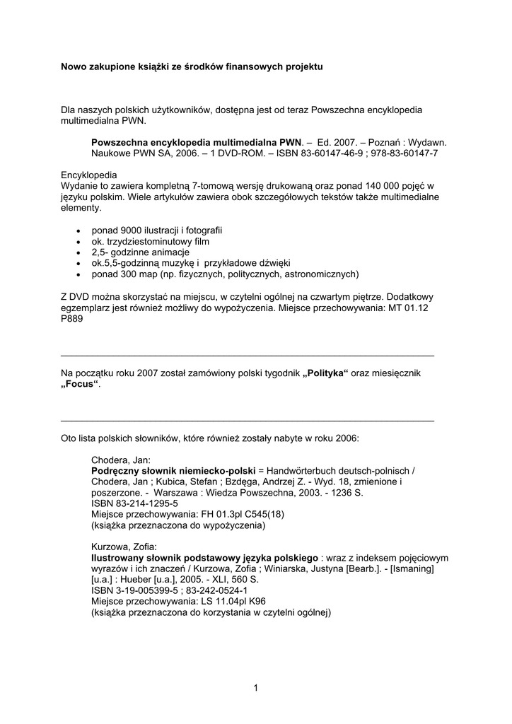 Nowo zakupione książki ze środków finansowych projektu Dla naszych polskich użytkowników, dostępna jest od teraz Powszechna encyklopedia multimedialna PWN. Powszechna encyklopedia multimedialna PWN. – Ed. 2007. – Poznań : Wydawn. Naukowe PWN SA, 2006. – 1 DVD-ROM. – ISBN 83-60147-46-9 ; 978-83-60147-7 Encyklopedia Wydanie to zawiera kompletną 7-tomową wersję drukowaną oraz ponad 140 000 pojęć w języku polskim. Wiele artykułów zawiera obok szczegółowych tekstów także multimedialne elementy. • • • • • ponad 9000 ilustracji i fotografii ok. trzydziestominutowy film 2,5- godzinne animacje ok.5,5-godzinną muzykę i przykładowe dźwięki ponad 300 map (np. fizycznych, politycznych, astronomicznych) Z DVD można skorzystać na miejscu, w czytelni ogólnej na czwartym piętrze. Dodatkowy egzemplarz jest również możliwy do wypożyczenia. Miejsce przechowywania: MT 01.12 P889 _______________________________________________________________________ Na początku roku 2007 został zamówiony polski tygodnik „Polityka“ oraz miesięcznik „Focus“. _______________________________________________________________________ Oto lista polskich słowników, które również zostały nabyte w roku 2006: Chodera, Jan: Podręczny słownik niemiecko-polski = Handwörterbuch deutsch-polnisch / Chodera, Jan ; Kubica, Stefan ; Bzdęga, Andrzej Z. - Wyd. 18, zmienione i poszerzone. - Warszawa : Wiedza Powszechna, 2003. - 1236 S. ISBN 83-214-1295-5 Miejsce przechowywania: FH 01.3pl C545(18) (książka przeznaczona do wypożyczenia) Kurzowa, Zofia: Ilustrowany słownik podstawowy języka polskiego : wraz z indeksem pojęciowym wyrazów i ich znaczeń / Kurzowa, Zofia ; Winiarska, Justyna [Bearb.]. - [Ismaning] [u.a.] : Hueber [u.a.], 2005. - XLI, 560 S. ISBN 3-19-005399-5 ; 83-242-0524-1 Miejsce przechowywania: LS 11.04pl K96 (książka przeznaczona do korzystania w czytelni ogólnej) 1 Medak, Stanisław: Słownik form koniugacyjnych czasowników polskich / Stanisław Medak. - Wyd. 1. - Kraków : Towarzystwo Autorów i Wydawców Prac Naukowych Universitas, 2004. - 363 S. – (Język polski dla cudzoziemców ; 17) ISBN 3-19-005398-7 ; 83-242-0226-9 Miejsce przechowywania: FH 11.04pl M488 (książka przeznaczona do wypożyczenia) Medak, Stanisław: Słownik odmiany rzeczowników polskich / Stanisław Medak. – Wyd. 1. Kraków : Universitas , 2003. - 321 S. – (Język polski dla cudzoziemców ; 16) ISBN 3-19-005397-9 ; 83-7052-533-4 Miejsce przechowywania: FH 11.04pl M488 (książka przeznaczona do wypożyczenia) Seretny, Anna: A co to takiego? : obrazkowy słownik języka polskiego ; poziom progowy / Anna Seretny. Z ilustracjami Andrzeja Piatkowskiego. Kraków : Universitas , 2003. - 252 S. (Język polski dla cudzoziemców ; 13) ISBN 3-19-005392-8 ; 83-7052-575-X Miejsce przechowywania: FH 11.04pl S483 (książka przeznaczona do wypożyczenia) _________________________________________________________________________ Poza tym na stanie biblioteki, przybyło również książek do nauki języka polskiego: Bartnicka, Barbara: Grammatik des Polnischen / Bartnicka, Barbara. – München : Sagner, 2004. – XIV, 620 S. – (Slavolinguistica ; 5) ISBN 3-87690-846-9 ; 3-87690-845-0 Miejsce przechowywania: FH 11.04pl B291 (książka przeznaczona do wypożyczenia) Damerau, Norbert: Polnische Grammatik / Damerau, Norbert. – 2., unveränd. Aufl. – Berlin [u.a.] : de Gruyter, 1992. – 139 S. – (Sammlung Göschen ; 2808) ISBN 3-11-006211-9 ; 3-11-013819-0 Miejsce przechowywania: FH 11.04pl D157(2) (książka przeznaczona do wypożyczenia) Majewska-Meyers, Malgorzata: Langenscheidt praktischer Sprachlehrgang Polnisch : ein Standardkurs für Selbstlerner ; systematisch zum Niveau B 1 der europäischen Sprachenzertifikate. – Berlin [u.a.] : Langenscheidt. – Langenscheidts praktische Lehrbücher) ISBN 3-468-80375-3 ; 978-468-80375-8. Dialoge : Lektion 1 – 20. – 2006. – 2 Audio-CDs Hör- und Sprechtraining : Lektion 1 – 20. – 2006. - 2 Audio-CDs Begleitheft. 2006. – 32 S. Lehrbuch. 2006. – 320 S. – ISBN 3-468-26263-9 ; 978-468-26263-0 Miejsce przechowywania: FH / LBS 11.04pl L664m (książka przeznaczona do wypożyczenia) 2 Majewska-Meyers, Malgorzata: Langenscheidt praktisches Lehrbuch Polnisch / Majewska-Meyers, Malgorzata ; Döring, Sven. – Berlin [u.a.] : Langenscheidt, 2006. – 320 S. ISBN 3-468-26263-9 ; 978-3-468-26263-0 Miejsce przechowywania: FH 11.04pl M233 (książka przeznaczona do wypożyczenia) Nosberg, Hedwig: Einstieg Polnisch für Kurzentschlossene / Nosberg, Hedwig ; Öhler, Thomas. – 2., aktualisierte Aufl. – Ismaning : Hueber, 2005. – 172 S. ; 2 CDs. ISBN 3-19-005348-0 ; 3-19-015348-7 Miejsce przechowywania: LBS 11.04pl N897(2) (książka przeznaczona do wypożyczenia pracownikom oraz studentom BTU i FHL) Polnisch ohne Mühe : Lehrbuch + CD-ROM + 4 Audio-CDs. – Nörvenich : Assimil Multimedia plus. ISBN 3-89625-453-7 Audio-CDs. – 1999. – 4 CDs Buch. - 2004. – VIII, 480 S. – ISBN 3-89625-003-5 CD-ROM. – 2005. – 1 CD-ROM Miejsce przechowywania: Magazyn (książka przeznaczona do wypożyczenia) Pyzik, Józef: Iść czy jechać? : ćwiczenia gramatyczne z języka polskiego; ćwiczenia gramatyczno-semantyczne z czasownikami ruchu; poziom średni ogólny / Józef Pyzik. - [Ismaning] [u.a.] : Hueber [u.a.], 2003. - 229 S. – (Język polski dla cudzoziemców ; 10) ISBN 3-19-005393-6 ; 83-242-0170-X Miejsce przechowywania: FH 11.04pl P999 (książka przeznaczona do wypożyczenia) Szelc-Mays, Magdalena: Coś wam powiem ... : ćwiczenia komunikacyjne dla grup średnich; [level: intermediate] / Magdalena Szelc-Mays. - Wyd. 2. - Kraków : Universitas , 2002. - 277 S. ; 2 Audio-CD : Ill. Miejsce przechowywania: FH / LBS / LS 11.04pl S997 (książka przeznaczona do wypożyczenia/ 1x czytelnia ogólna) Szelc-Mays, Magdalena: Nowe słowa - stare rzeczy : podręcznik do nauczania słownictwa języka polskiego ; poziomy: podstawowy i śre