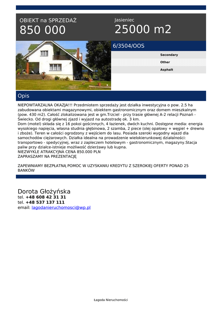 OBIEKT na SPRZEDAŻ 850 000 Jasieniec 25000 m2 6/3504/OOS Secondary Other Asphalt Opis NIEPOWTARZALNA OKAZJA!!! Przedmiotem sprzedaży jest działka inwestycyjna o pow. 2.5 ha zabudowana obiektami magazynowymi, obiektem gastronomicznym oraz domem mieszkalnym (pow. 430 m2). Całość zlokalizowana jest w gm.Trzciel - przy trasie głównej A-2 relacji Poznań Świecko. Od drogi głównej zjazd i wyjazd na autostradę ok. 3 km. Dom (motel) składa się z 16 pokoi gościnnych, 4 łazienek, dwóch kuchni. Dostępne media: energia wysokiego napięcia, własna studnia głębinowa, 2 szamba, 2 piece (olej opałowy + węgiel + drewno i zboże). Teren w całości ogrodzony z wejściem do lasu. Posiada szeroki wygodny wjazd dla samochodów ciężarowych. Działka idealna na prowadzenie wielokierunkowej działalności: transportowo - spedycyjnej, wraz z zapleczem hotelowym - gastronomicznym, magazyny.Stacja paliw przy działce-istnieje możliwość dzierżawy lub kupna. NIEZWYKLE ATRAKCYJNA CENA 850.000 PLN ZAPRASZAMY NA PREZENTACJĘ ZAPEWNIAMY BEZPŁATNĄ POMOC W UZYSKANIU KREDYTU Z SZEROKIEJ OFERTY PONAD 25 BANKÓW Dorota Głożyńska tel. +48 608 42 31 31 tel. +48 537 137 111 email: [email protected] Łagoda Nieruchomości Powered by TCPDF (www.tcpdf.org)