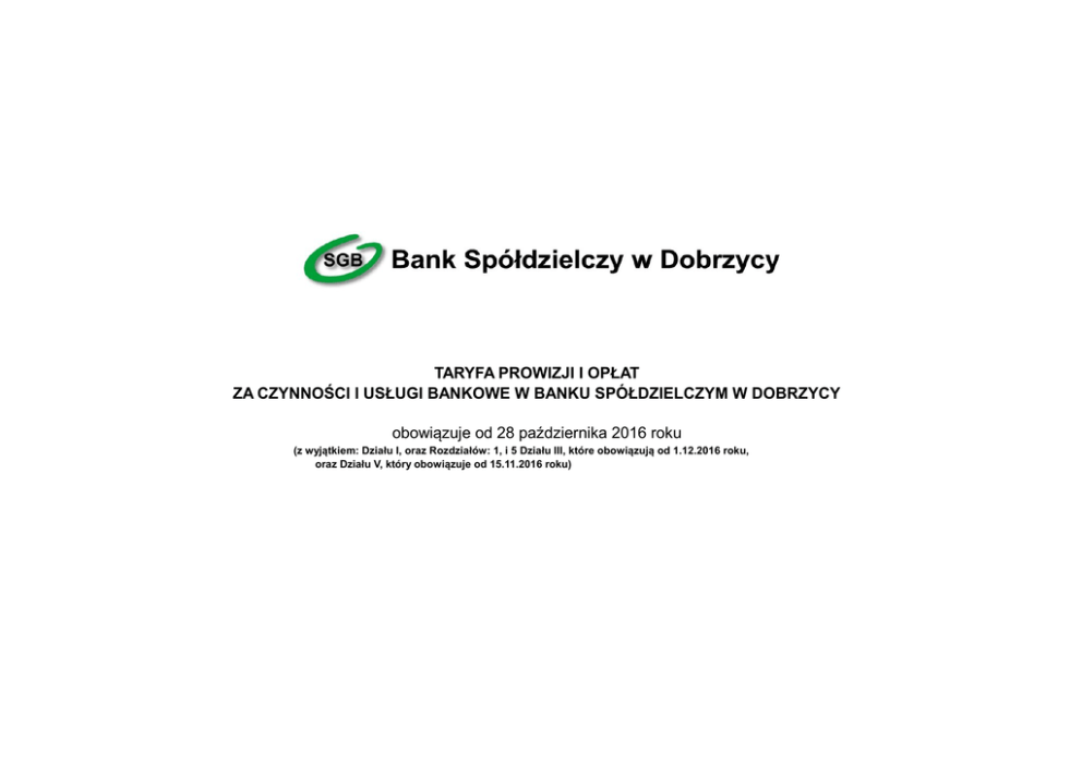 TARYFA PROWIZJI I OPŁAT ZA CZYNNOŚCI I USŁUGI BANKOWE W BANKU SPÓŁDZIELCZYM W DOBRZYCY obowiązuje od 28 października 2016 roku (z wyjątkiem: Działu I, oraz Rozdziałów: 1, i 5 Działu III, które obowiązują od 1.12.2016 roku, oraz Działu V, który obowiązuje od 15.11.2016 roku) Taryfa prowizji i opłat SPIS TREŚCI DZIAŁ I. POSTANOWIENIA OGÓLNE DZIAŁ II. USŁUGI DLA KLIENTÓW INDYWIDUALNYCH Rozdział 1. Obsługa rachunków oszczędnościowo-rozliczeniowych (ROR) Rozdział 2. Rachunki oszczędnościowe Rozdział 3. Rachunki terminowych lokat oszczędnościowych Rozdział 4. Usługi bankowości elektronicznej Rozdział 5. Karty płatnicze Rozdział 6. Kredyty i pożyczki DZIAŁ III. USŁUGI DLA KLIENTÓW INSTYTUCJONALNYCH Rozdział 1. Obsługa rachunków rozliczeniowych Rozdział 1a. Rachunki rozliczeniowe Rozdział 1b. Rachunki rozliczeniowe – rolnicy Rozdział 2. Rachunki lokat terminowych Rozdział 3. Usługi bankowości elektronicznej Rozdział 4. Karty płatnicze Rozdział 5. Kredyty i pożyczki Rozdział 6. Gwarancje, poręczenia, regwarancje, awale Dział IV. POZOSTAŁE OPŁATY Rozdział 1. Wpłaty i wypłaty gotówkowe Rozdział 2. Przechowywanie przedmiotów i papierów wartościowych Rozdział 3. Inne czynności i usługi bankowe DZIAŁ V. WALUTY WYMIENIALNE 3 4 4 6 7 8 9 12 13 13 19 20 21 24 25 26 26 26 27 28 2 Taryfa prowizji i opłat DZIAŁ I. POSTANOWIENIA OGÓLNE 1. Bank Spółdzielczy w Dobrzycy pobiera prowizje i opłaty za czynności i usługi bankowe dla klientów indywidualnych oraz instytucjonalnych zgodnie z niniejszą "Taryfą prowizji i opłat za czynności i usługi bankowe świadczone w walucie krajowej oraz w walutach wymienialnych - Klienci Banku Spółdzielczego w Dobrzycy, zwaną dalej taryfą. 2. Pojęcia stosowane w taryfie oznaczają: 1) elektroniczny kanał dostępu - sposób komunikacji posiadacza rachunku z Bankiem Spółdzielczym w Dobrzycy lub Banku Spółdzielczego w Dobrzycy z posiadaczem na odległość, za pośrednictwem sieci teleinformatycznej lub urządzeń elektronicznych, obejmujący w szczególności serwis internetowy (kanał WWW), i Serwis SMS, udostępniany na podstawie odrębnej umowy, 2) pakiet taryfowy - zdefiniowane w taryfie opłaty i prowizje dla poszczególnych grup klientów, 3) SGB (Spółdzielcza Grupa Bankowa) - zrzeszenie, które tworzą SGB-Bank S.A. oraz banki spółdzielcze, które zawarły z nim umowy zrzeszenia, 4) środek identyfikacji elektronicznej - zabezpieczenie, przy użyciu którego Bank Spółdzielczy w Dobrzycy uniemożliwia dostęp do systemu osobom nieuprawnionym, w szczególności token, karta haseł jednorazowych TAN*, hasło SMS*, telekod*, karta chipowa, PIN do karty chipowej. 3. Prowizje i opłaty ustalane są w złotych. 4. Kwoty prowizji podlegają zaokrągleniu do pełnych groszy, na następujących zasadach: kwoty mniejsze niż 0,5 grosza pomija się, a kwoty od 0,5 grosza włącznie zaokrągla się do pełnego grosza w górę. 5. Prowizje i opłaty podane są w stawkach brutto chyba, że z opisu danej prowizji lub opłaty wynika co innego. 6. Wszelkie prowizje i opłaty bankowe pokrywa zleceniodawca operacji bankowej, o ile strony nie ustaliły inaczej. 7. Prowizje i opłaty pobierane są poprzez obciążenie rachunku na podstawie udzielonej przez klienta dyspozycji lub poprzez przyjęcie wpłaty gotówkowej albo bezgotówkowej. 8. Prowizje i opłaty za czynności i usługi bankowe księgowane są w ciężar rachunku, którego dotyczą; w uzasadnionych przypadkach dopuszcza się zaksięgowanie prowizji/opłaty w ciężar innego rachunku klienta, zgodnie z dyspozycją klienta. 9. Prowizje i opłaty pobierane są zgodnie z trybem określonym w poszczególnych rozdziałach: 1) niezwłocznie, w dniu złożenia albo wykonania dyspozycji, 2) cyklicznie, 3) w innych terminach wskazanych w taryfie lub umowach zawartych pomiędzy klientem a Bankiem Spółdzielczym w Dobrzycy. 10. Opłaty cykliczne, o których mowa w ust. 9 pkt 2, pobierane są w następujących terminach: 1) 3-go dnia roboczego każdego miesiąca - w przypadku opłat za użytkowanie kart, 2) 25 dnia każdego miesiąca - w przypadku opłat za prowadzenie rachunków i użytkowanie tokenów, 3) w dniu miesiąca odpowiadającym dniowi pierwszego pobrania danej opłaty - w przypadku pozostałych opłat, z zastrzeżeniem, że opłaty miesięczne nie są pobierane w miesiącu rozpoczęcia korzystania z usługi świadczonej przez Bank Spółdzielczy w Dobrzycy, a w przypadku klientów indywidualnych również w miesiącu zakończenia. 11. Opłaty roczne pobrane z góry od klientów indywidualnych są zwracane w części za niewykorzystany okres, jeżeli klient zrezygnował z usługi przed upływem roku od pobrania opłaty. 12. Zarząd Banku może podjąć decyzję o zastosowaniu niższych stawek opłat i prowizji w stosunku do: 1) Kluczowych klientów – na zasadach określonych w Instrukcji ustalania indywidualnych warunków współpracy z kluczowymi klientami Banku Spółdzielczego w Dobrzycy. 2) Organizacji społecznych, stowarzyszeń, fundacji itp.., nie prowadzących działalności gospodarczej – w zakresie: a) odstąpienia od pobierania prowizji i opłat, b) zmniejszenia wysokości prowizji i opłat. 13. Zarząd Banku może zawierać z instytucjami lub podmiotami umowy o wykonanie operacji zleconych przez te instytucje lub podmioty oraz pobierać na wniosek klienta prowizje i opłaty w wysokościach i na zasadach uzgodnionych wzajemnie w tych umowach. 14. Dla klientów indywidualnych prowadzone są następujące rachunki oszczędnościowo - rozliczeniowe, z zastrzeżeniem: 1) „Junior” - przeznaczony dla klientów indywidualnych do 18 roku życia, 2) „Młodzieżowe” - przeznaczony dla klientów indywidualnych do 30 roku życia (od miesiąca następującego po ukończeniu przez klienta 30 lat rachunek ulega przekształceniu na rachunek standard), 3) „Standard” - przeznaczony dla pozostałych klientów, niż wskaza