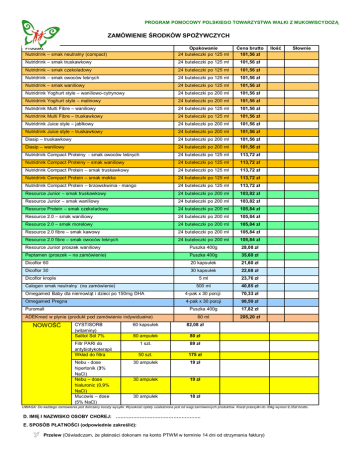 PROGRAM POMOCOWY POLSKIEGO TOWARZYSTWA WALKI Z MUKOWISCYDOZĄ ZAMÓWIENIE ŚRODKÓW SPOŻYWCZYCH Produkt Nutridrink – smak neutralny (compact) Opakowanie 24 buteleczki po 125 ml Cena brutto 101,56 zł Nutridrink – smak truskawkowy 24 buteleczki po 125 ml 101,56 zł Nutridrink – smak czekoladowy 24 buteleczki po 125 ml 101,56 zł Nutridrink – smak owoców leśnych 24 buteleczki po 125 ml 101,56 zł Nutridrink – smak waniliowy 24 buteleczki po 125 ml 101,56 zł Nutridrink Yoghurt style – waniliowo-cytrynowy 24 buteleczki po 200 ml 101,56 zł Nutridrink Yoghurt style – malinowy 24 buteleczki po 200 ml 101,56 zł Nutridrink Multi Fibre – waniliowy 24 buteleczki po 125 ml 101,56 zł Nutridrink Multi Fibre – truskawkowy 24 buteleczki po 125 ml 101,56 zł Nutridrink Juice style – jabłkowy 24 buteleczki po 200 ml 101,56 zł Nutridrink Juice style – truskawkowy 24 buteleczki po 200 ml 101,56 zł Diasip – truskawkowy 24 buteleczki po 200 ml 101,56 zł Diasip – waniliowy 24 buteleczki po 200 ml 101,56 zł Nutridrink Compact Proteiny - smak owoców leśnych 24 buteleczki po 125 ml 113,72 zł Nutridrink Compact Proteiny – smak waniliowy 24 buteleczki po 125 ml 113,72 zł Nutridrink Compact Protein – smak truskawkowy 24 buteleczki po 125 ml 113,72 zł Nutridrink Compact Protein – smak mokka 24 buteleczki po 125 ml 113,72 zł Nutridrink Compact Protein – brzowskwinia - mango 24 buteleczki po 125 ml 113,72 zł Resource Junior – smak truskawkowy 24 buteleczki po 200 ml 103,82 zł Resource Junior – smak waniliowy 24 buteleczki po 200 ml 103,82 zł Resource Protein – smak czekoladowy 24 buteleczki po 200 ml 105,84 zł Resource 2.0 – smak waniliowy 24 buteleczki po 200 ml 105,84 zł Resource 2.0 – smak morelowy 24 buteleczki po 200 ml 105,84 zł Resource 2.0 fibre – smak kawowy 24 buteleczki po 200 ml 105,84 zł Resource 2.0 fibre – smak owoców leśnych 24 buteleczki po 200 ml 105,84 zł Resource Junior proszek waniliowy Puszka 400g 28,08 zł Peptamen (proszek – na zamówienie) Puszka 400g 35,60 zł Dicoflor 60 20 kapsułek 21,60 zł Dicoflor 30 30 kapsułek 22,68 zł Dicoflor krople 5 ml 23,76 zł 500 ml 40,85 zł Omegamed Baby dla niemowląt i dzieci po 150mg DHA 4-pak x 30 porcji 70,33 zł Omegamed Pregna 4-pak x 30 porcji 98,50 zł Calogen smak neutralny (na zamówienie) Puromalt ADEKmed w płynie (produkt pod zamówienie indywidualne) NOWOŚĆ CYSTISORB (witaminy) Salitol Sól 7% 17,82 zł 60 ml 205,20 zł 60 kapsułek 82,08 zł 60 ampułek 80 zł 1 szt. 89 zł Filtr PARI do antybiotykoterapii Wkład do filtra Nebu - dose hipertonik (3% NaCl) Nebu – dose hialuronic (0,9% NaCl) Mucowis – dose (5% NaCl) Puszka 400g 50 szt. 175 zł 30 ampułek 19 zł 30 ampułek 19 zł 30 ampułek 18 zł Ilość Słownie UWAGA: Do każdego zamówienia jest doliczany koszty wysyłki. Wysokość opłaty uzależniona jest od wagi zamówionych produktów. Koszt przesyłki do 30kg wynosi 9,35zł brutto. D. IMIĘ I NAZWISKO OSOBY CHOREJ: …………………………………………….. E. SPOSÓB PŁATNOŚCI (odpowiednie zakreślić): Przelew (Oświadczam, że płatności dokonam na konto PTWM w terminie 14 dni od otrzymania faktury) gotówka subkonto /subkonto1% /wsparcie F. DANE DO FAKTURY: G. DANE DO WYSYŁKI: (Jeżeli inne niż w punkcie F): Imię i nazwisko: ……………….……………………... Imię i nazwisko: ……………….……………..……… Ulica i numer domu: ……………….……………….......... Ulica i numer domu: ……………….…………………..… Kod pocztowy i miejscowość: ………….……………………… Kod pocztowy i miejscowość: ……………….……………….. Numer telefonu: Numer telefonu: ………………..…………………….. ……………….………………………........................ Data i miejscowość ……………….…………………….. ……………….………………………............ Podpis