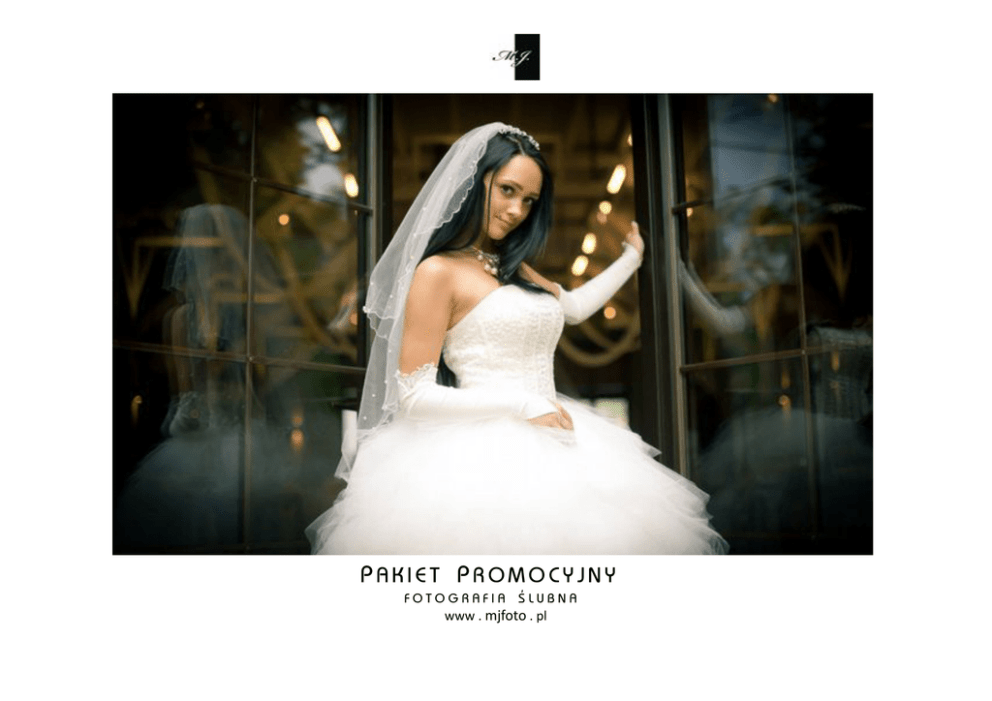 PAKIET PROMOCYJNY FOTOGRAFIA ŚLUBNA www . mjfoto . pl Pakiet promocyjny Cena 990 Zawiera wszystko to co niezbędne i najlepsze w fotografii ślubnej. Pakiet opracowany na podstawie własnego wieloletniego doświadczenia. Zawartość została skonsultowana z kilkunastoma parami młodymi. Zawartość Reportaż z ceremonii ślubnej Reportaż z przyjęcia weselnego oraz plener łącznie ok. 4 godziny Doświadczenie i wyposażenie fotografa Posiadam wieloletnie doświadczenie i umiejętności niezbędne w fotografii ślubnej. Do fotografowania używam najwyższej klasy obiektów stałoogniskowych firmy Canon 24l. 35L, 100L, 135L oraz 24-70L, 70-200L. Ceremonia ślubna Wielomiesięczne przygotowania i dużo emocji, a wszystko dla tej właśnie chwili. Ceremonia ślubna, czyli punkt kulminacyjny całego dnia Reportaż rozpoczynam ok. 30 - 40 minut przed uroczystością. W Waszym zestawie zdjęć który otrzymacie znają się wszystkie najważniejsze wydarzenie ujęte w niecodzienny sposób oraz zdjęcia z rodziną i znajomymi. Na zakończenie tego etapu wykonuje zdjęcie grupowe. Przyjęcie weselne Emocje związane z podpisaniem aktu małżeństw już za nami czas na dobrą zabawę. Zdjęcia w ruchu, przy dynamicznym oświetleniu czy też jego braku mogą być świetną pamiątką z doskonałej zabawy. W trakcie przyjęcia jestem zawsze na miejscu, więc zdjęć z toastów, wspólnych śpiewów i tańców nie zabraknie. W pakiecie promocyjnym jestem z Wami nie więcej niż cztery godziny, łącznie z plenerem. Sesja portretowa Goście się bawią a my robimy zdjęcia. To około 40 - 60 minutowa sesja zdjęciowa pokazująca Was w najlepszych ujęciach. O mnie Nazywam się Marian Jędryszczyk od wielu lat z pasją i zaangażowaniem realizuję się w fotografii ślubnej. Moje reportaże zawierają wszystkie najważniejsze wydarzenia z dnia ślubu umiejętnie połączone z sesją portretową. Fotografia ślubna jest dla mnie dyskretną rejestracją czułych spojrzeń, gestów, namiętnego dotyku, pocałunku, przytulania. Poprzez fotografię ślubną pokazuj takie emocje jak miłość, radość, bliskość, wsparcie, życzliwość, wzruszenie... Efektem mojej pracy jest wyjątkowa bezcenna pamiątka zdjęcia ślubne na całe życie. Kontakt Jestem do Waszej dyspozycji w kontakcie mailowym [email protected] lub telefonicznym 507 - 705 - 105 Efekt końcowy 500 fotografii w formie cyfrowej na płytach dvd. • 50 fotografii specjalnie wyselekcjonowanych i podanych autorskiej obróbce w zakresie zwartości, luminancji, kolorów itp. na płycie dvd • Gratis na życzenie - mini galeria na blogu. • Inne Pakiet zawiera koszty dojazdów łącznie do 50 km. • Istnieje możliwość wykonania albumu ślubnego, sesji plenerowej w innym dniu. • Oferta może być uzupełniona o wydruki, pokazy zdjęć itp. • Cena promocyjna to 990 zł.