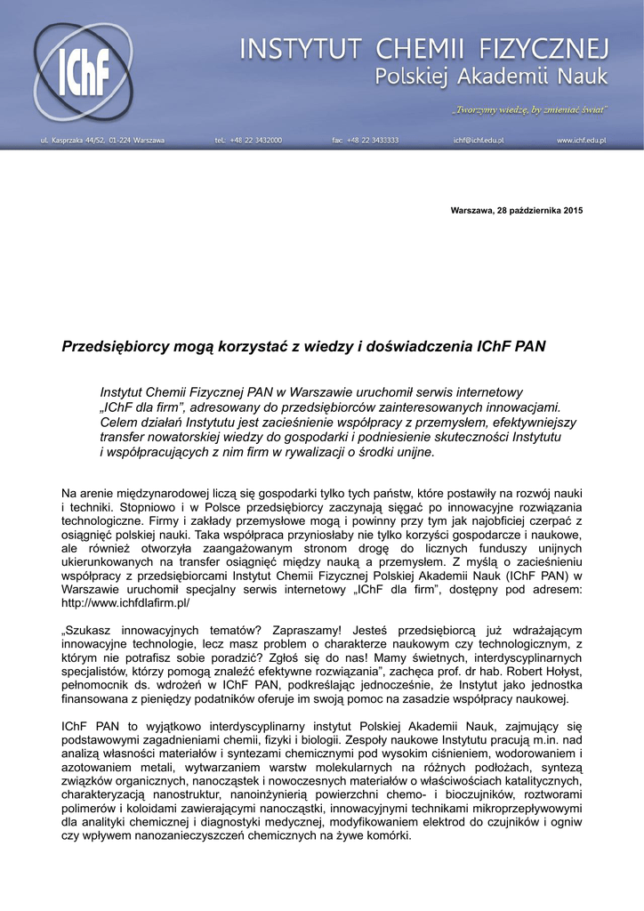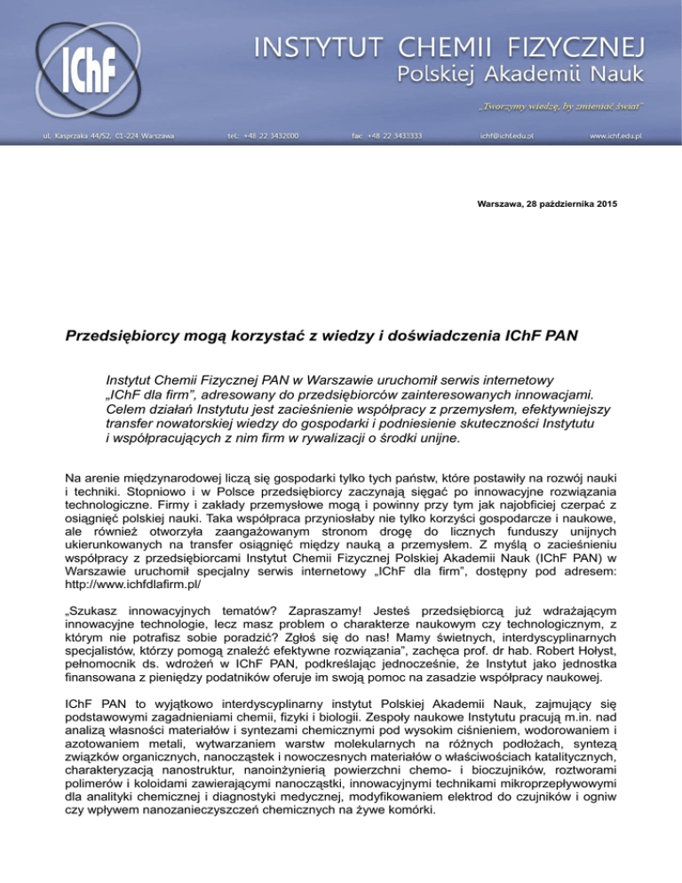 Warszawa, 28 października 2015 Przedsiębiorcy mogą korzystać z wiedzy i doświadczenia IChF PAN Instytut Chemii Fizycznej PAN w Warszawie uruchomił serwis internetowy „IChF dla firm”, adresowany do przedsiębiorców zainteresowanych innowacjami. Celem działań Instytutu jest zacieśnienie współpracy z przemysłem, efektywniejszy transfer nowatorskiej wiedzy do gospodarki i podniesienie skuteczności Instytutu i współpracujących z nim firm w rywalizacji o środki unijne. Na arenie międzynarodowej liczą się gospodarki tylko tych państw, które postawiły na rozwój nauki i techniki. Stopniowo i w Polsce przedsiębiorcy zaczynają sięgać po innowacyjne rozwiązania technologiczne. Firmy i zakłady przemysłowe mogą i powinny przy tym jak najobficiej czerpać z osiągnięć polskiej nauki. Taka współpraca przyniosłaby nie tylko korzyści gospodarcze i naukowe, ale również otworzyła zaangażowanym stronom drogę do licznych funduszy unijnych ukierunkowanych na transfer osiągnięć między nauką a przemysłem. Z myślą o zacieśnieniu współpracy z przedsiębiorcami Instytut Chemii Fizycznej Polskiej Akademii Nauk (IChF PAN) w Warszawie uruchomił specjalny serwis internetowy „IChF dla firm”, dostępny pod adresem: http://www.ichfdlafirm.pl/ „Szukasz innowacyjnych tematów? Zapraszamy! Jesteś przedsiębiorcą już wdrażającym innowacyjne technologie, lecz masz problem o charakterze naukowym czy technologicznym, z którym nie potrafisz sobie poradzić? Zgłoś się do nas! Mamy świetnych, interdyscyplinarnych specjalistów, którzy pomogą znaleźć efektywne rozwiązania”, zachęca prof. dr hab. Robert Hołyst, pełnomocnik ds. wdrożeń w IChF PAN, podkreślając jednocześnie, że Instytut jako jednostka finansowana z pieniędzy podatników oferuje im swoją pomoc na zasadzie współpracy naukowej. IChF PAN to wyjątkowo interdyscyplinarny instytut Polskiej Akademii Nauk, zajmujący się podstawowymi zagadnieniami chemii, fizyki i biologii. Zespoły naukowe Instytutu pracują m.in. nad analizą własności materiałów i syntezami chemicznymi pod wysokim ciśnieniem, wodorowaniem i azotowaniem metali, wytwarzaniem warstw molekularnych na różnych podłożach, syntezą związków organicznych, nanocząstek i nowoczesnych materiałów o właściwościach katalitycznych, charakteryzacją nanostruktur, nanoinżynierią powierzchni chemo- i bioczujników, roztworami polimerów i koloidami zawierającymi nanocząstki, innowacyjnymi technikami mikroprzepływowymi dla analityki chemicznej i diagnostyki medycznej, modyfikowaniem elektrod do czujników i ogniw czy wpływem nanozanieczyszczeń chemicznych na żywe komórki. Do ważnych tematów naukowych podejmowanych w IChF PAN należą badania nad rolą wodoru elektrolitycznego w procesach korozji, wytwarzaniem i magazynowaniem wodoru jako nośnika energii, katalityczną syntezą prekursorów witamin i substancji zapachowych, oczyszczaniem wody ze związków chloroorganicznych, dyfuzją i reakcjami chemicznymi w zatłoczonym środowisku, badaniami teoretycznymi ścieżek reakcji chemicznych oraz syntezą feromonów, atraktantów i repelentów dla owadów-szkodników. Opracowywane w Instytucie nanometryczne katalizatory pozwalają oczyszczać wodę z wykorzystaniem promieniowania słonecznego i wytwarzać z odpadów organicznych półprodukty dla przemysłu farmaceutycznego i spożywczego. Aparatura pomiarowa dostępna w Instytucie umożliwia analizę struktury cząsteczek i czystości związków chemicznych, wykrywa ich odmiany polimorficzne, pozwala określać stopień usieciowienia polimerów. Instytutowe laboratorium badania procesów zachodzących w kilku warstwach atomowych przy powierzchni ciał stałych należy do najnowocześniejszych w Europie. Sprzęt IChF PAN umożliwia także rentgenowską analizę strukturalną związków organicznych, nieorganicznych i metaloorganicznych w różnych temperaturach, rozbudowaną analizę spektroskopową z użyciem wielu technik, w tym tak nowatorskich jak SERS, oraz charakteryzowanie powierzchni materiałów za pomocą skaningowej mikroskopii elektronowej i sił atomowych. Zainteresowani przedsiębiorcy i naukowcy mogą w IChF PAN identyfikować i oznaczać związki organiczne w złożonych matrycach, ustalać stopień zanieczyszczenia wody, określać właściwości powierzchni i strukturę materiałów porowatych, badać skład fazowy i zmiany struktury materiałów dla przemysłu farmaceutycznego czy analizować małe ilości substancji pojawiających się podczas awarii urządzeń elektrycznych dużej mocy. Specjaliści zajmujący się mikrobiologią kosmetyczną i kliniczną mogą wykrywać i identyfikować bakterie (w tym chorobotwórcze) i patogeny. Rozwijane w Instytucie ultraszybkie techniki laserowe nadają się do wykorzystania w mikroobróbce powierzchni oraz do różnorodnych badań, m.in. nad zmianami konformacyjnymi w polimerach i strukturą wody w reakcjach enzymatycznych, jak również nad analizą barwników, pigmentów malarskich i spoiw oraz detekcją markerów chorób nowotworowych. „W ramach współpracy z przedsiębiorcami jesteśmy w stanie przeprowadzić kompetentne pomiary i analizy dotyczące szerokiej gamy procesów fizycznych, chemicznych, a nawet biologicznych o znaczeniu praktycznym dla wielu gałęzi gospodarki, w tym przemysłu kosmetycznoperfumeryjnego, farmaceutycznego, bioinżynierii, fotoelektroniki czy różnego rodzaju nanotechnologii. Wystarczy się z nami skontaktować”, mówi prof. Hołyst. IChF PAN ma bogate doświadczenia we współpracy z przemysłem. Wśród dotychczasowych partnerów Instytutu znajdują się największe koncerny, takie jak południowokoreański Samsung, japoński Mitsui Chemicals czy brytyjsko-holenderski Unilever. Jednak doświadczenia Instytutu nie ograniczają się wyłącznie do współpracy z ogólnoświatowymi gigantami. Działający przy Instytucie Zakład Doświadczalny CHEMIPAN od wiel