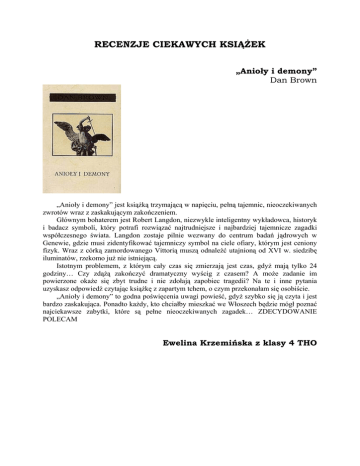 RECENZJE CIEKAWYCH KSIĄŻEK „Anioły i demony” Dan Brown „Anioły i demony” jest książką trzymającą w napięciu, pełną tajemnic, nieoczekiwanych zwrotów wraz z zaskakującym zakończeniem. Głównym bohaterem jest Robert Langdon, niezwykle inteligentny wykładowca, historyk i badacz symboli, który potrafi rozwiązać najtrudniejsze i najbardziej tajemnicze zagadki współczesnego świata. Langdon zostaje pilnie wezwany do centrum badań jądrowych w Genewie, gdzie musi zidentyfikować tajemniczy symbol na ciele ofiary, którym jest ceniony fizyk. Wraz z córką zamordowanego Vittorią muszą odnaleźć utajnioną od XVI w. siedzibę iluminatów, rzekomo już nie istniejącą. Istotnym problemem, z którym cały czas się zmierzają jest czas, gdyż mają tylko 24 godziny… Czy zdążą zakończyć dramatyczny wyścig z czasem? A może zadanie im powierzone okaże się zbyt trudne i nie zdołają zapobiec tragedii? Na te i inne pytania uzyskasz odpowiedź czytając książkę z zapartym tchem, o czym przekonałam się osobiście. „Anioły i demony” to godna poświęcenia uwagi powieść, gdyż szybko się ją czyta i jest bardzo zaskakująca. Ponadto każdy, kto chciałby mieszkać we Włoszech będzie mógł poznać najciekawsze zabytki, które są pełne nieoczekiwanych zagadek… ZDECYDOWANIE POLECAM Ewelina Krzemińska z klasy 4 THO