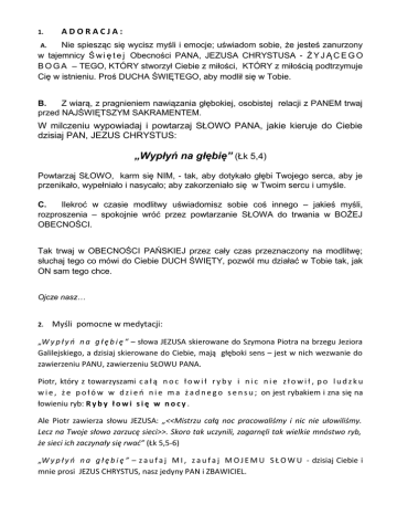 1. ADORACJA: Nie spiesząc się wycisz myśli i emocje; uświadom sobie, że jesteś zanurzony w tajemnicy Ś w i ę t e j Obecności PANA, JEZUSA CHRYSTUSA - Ż Y J Ą C E G O B O G A – TEGO, KTÓRY stworzył Ciebie z miłości, KTÓRY z miłością podtrzymuje Cię w istnieniu. Proś DUCHA ŚWIĘTEGO, aby modlił się w Tobie. A. B. Z wiarą, z pragnieniem nawiązania głębokiej, osobistej relacji z PANEM trwaj przed NAJŚWIĘTSZYM SAKRAMENTEM. W milczeniu wypowiadaj i powtarzaj SŁOWO PANA, jakie kieruje do Ciebie dzisiaj PAN, JEZUS CHRYSTUS: „Wypłyń na głębię” (Łk 5,4) Powtarzaj SŁOWO, karm się NIM, - tak, aby dotykało głębi Twojego serca, aby je przenikało, wypełniało i nasycało; aby zakorzeniało się w Twoim sercu i umyśle. C. Ilekroć w czasie modlitwy uświadomisz sobie coś innego – jakieś myśli, rozproszenia – spokojnie wróć przez powtarzanie SŁOWA do trwania w BOŻEJ OBECNOŚCI. Tak trwaj w OBECNOŚCI PAŃSKIEJ przez cały czas przeznaczony na modlitwę; słuchaj tego co mówi do Ciebie DUCH ŚWIĘTY, pozwól mu działać w Tobie tak, jak ON sam tego chce. Ojcze nasz… 2. Myśli pomocne w medytacji: „W y p ł y ń n a g ł ę b i ę ” – słowa JEZUSA skierowane do Szymona Piotra na brzegu Jeziora Galilejskiego, a dzisiaj skierowane do Ciebie, mają głęboki sens – jest w nich wezwanie do zawierzeniu PANU, zawierzeniu SŁOWU PANA. Piotr, który z towarzyszami c a ł ą n o c ł o w i ł r y b y i n i c n i e z ł o w i ł , p o l u d z k u w i e , ż e p o ł ó w w d z i e ń n i e m a ż a d n e g o s e n s u ; on jest rybakiem i zna się na łowieniu ryb: R y b y ł o w i s i ę w n o c y . Ale Piotr zawierza słowu JEZUSA: „<<Mistrzu całą noc pracowaliśmy i nic nie ułowiliśmy. Lecz na Twoje słowo zarzucę sieci>>. Skoro tak uczynili, zagarnęli tak wielkie mnóstwo ryb, że sieci ich zaczynały się rwać” (Łk 5,5-6) „W y p ł y ń n a g ł ę b i ę ” – z a u f a j M I , z a u f a j M O J E M U S Ł O W U - dzisiaj Ciebie i mnie prosi JEZUS CHRYSTUS, nasz jedyny PAN i ZBAWICIEL. „W y p ł y ń n a g ł ę b i ę ” – wypłyń d z i s i a j na głębiny swej duszy i tu spotkaj się ze MNĄ. J A J E S T E M – T R Ó J J E D Y N Y B Ó G - w najgłębszej głębi Twojego jestestwa i tu na Ciebie oczekuję. Jestem spragniony spotkania z Tobą – właśnie z Tobą. Uświadom to sobie i wyryj tę prawdę w swoim sercu i swojej pamięci: skutkiem chrztu świętego jest przywrócenie człowiekowi synostwa Bożego i uczestnictwo w życiu OSÓB TRÓJCY PRZENAJŚWIĘTSZEJ (por. KKK 1265). Ł a s k a u ś w i ę c a j ą c a jest w teologii rozumiana jako samoudzielanie się TRÓJOSOBOWEGO BOGA człowiekowi; w człowieku zamieszkuje BÓG w TRÓJCY JEDYNY. T R Ó J J E D Y N Y B Ó G jest tą O B E C N O Ś C I Ą , która podtrzymuje Twoje życie, Twoje istnienie. Święty Paweł w Dziejach Apostolskich mówi: „W Nim bowiem żyjemy, poruszamy się i jesteśmy” (Dz 17,28a). W mojej duszy jest obecny TRÓJJEDYNY BÓG: OJCIEC, SYN BOŻY i DUCH ŚWIĘTY, ale ja mogę żyć jakby na powierzchni, nie wchodząc w jej głębiny; bez głębokiego życia wewnętrznego do jakiego zaprasza mnie BÓG. „W y p ł y ń n a g ł ę b i ę ”- zaufaj SŁOWU PANA. W y p ł y ń n a g ł ę b i ę s w o j e j d u s z y . Proś DUCHA ŚWIĘTEGO aby Cię tam prowadził, aby uzdalniał Cię do wchodzenia w jej głębiny, aby prowadził Cię do spotkania z JEZUSEM, do spotkania z OJCEM. Proś często DUCHA ŚWIĘTEGO o łaskę modlitwy sercem. Znajdź czas na modlitwę. Znajdź c z a s i c i s z ę aby z PANEM przebywać, aby na nowo kontemplować JEGO SŁOWO, JEGO OSOBĘ. C z a s , aby z PANEM w szczerości serca rozmawiać; aby w ciszy wsłuchiwać się co mówi do Ciebie PAN, aby rozważać w jaki sposób ON chce Cię poprowadzić poprzez codzienność Twojego życia - według JEGO BOŻEGO planu. Pozwól się prowadzić. Nie myśl, nie mów: tyle się natrudziłem - ale nic nie osiągnąłem, jestem już za stary, niczego nie potrafię……; albo ja osiągnąłem wszystko, więcej już nie można. Miłujący Cię BÓG chce dla Ciebie pełnię szczęścia, życia w obfitości (J 10,10). Tylko BÓG wie, czym jest to, czego Ty najbardziej potrzebujesz, gdyż to ON, każdego z nas stworzył, wie jacy naprawdę jesteśmy, zna nas bardziej niż my siebie znamy. I ON, tylko ON może Ci dać życie w obfitości: „Dla BOGA bowiem nie ma nic niemożliwego” (Łk 1,37). Wypłyń dzisiaj na głębię, wypływaj na głębię jutro i pojutrze. Nie lękaj się. Na nowo otwieraj drzwi CHRYSTUSOWI – ON „nie złamie trzciny nadłamanej, nie zgasi ledwo tlejącego knotka” (Iz 42,3). C o d z i e n n i e , n a n o w o otwieraj PANU drzwi swojej duszy, zapraszaj GO, p r z e b y w a j z N I M , p o z w ó l a b y p r o w a d z i ł i kształtował według swojej woli.