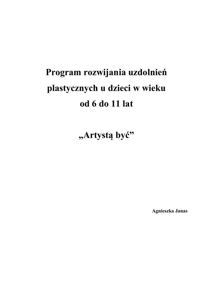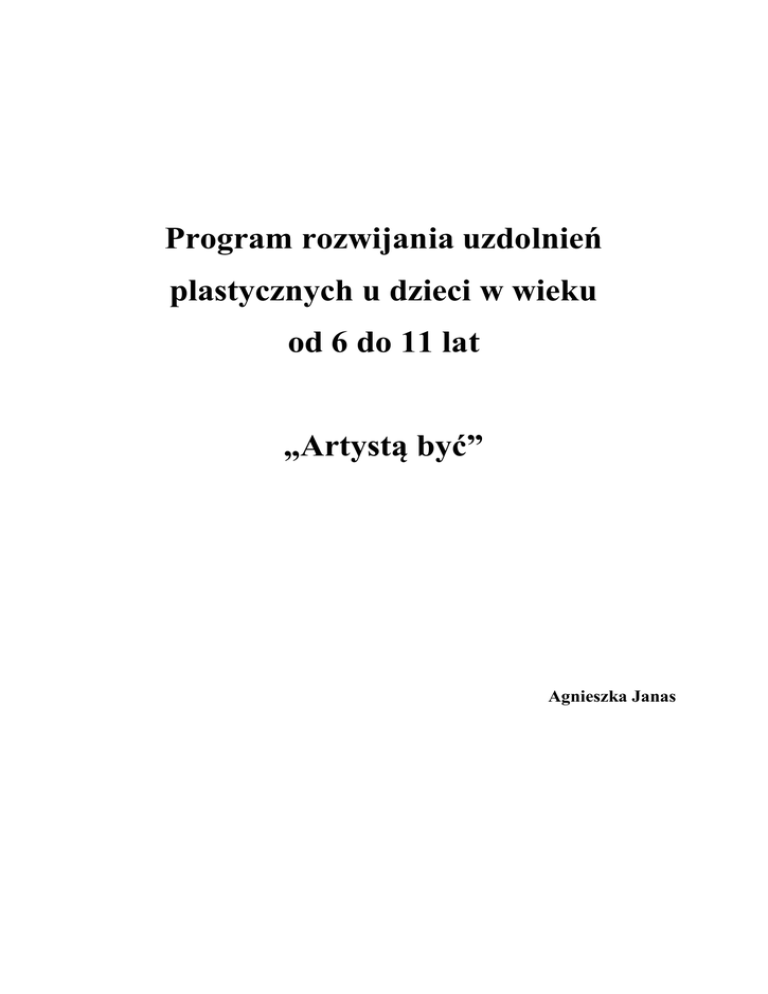 Program rozwijania uzdolnień plastycznych u dzieci w wieku od 6 do 11 lat „Artystą być” Agnieszka Janas Spis treści: 1.Wprowadzenie 2. Cele programu 3. Metody i formy pracy 4. Treści 5. Osiągnięcia uczniów 6. Ewaluacja 1. Wprowadzenie Każde dziecko przychodzi na świat z pewnym potencjałem uzdolnień. To od nas zależy, ile zrobimy by „oszlifować ten diament” i wyciągnąć z niego to, co najlepsze. Indywidualne różnice między dziećmi sprawiają, że jedni uczą się szybciej nowych rzeczy inni wolniej. Współczesna szkoła rozwijająca zainteresowania oraz doskonaląca zdolności nie powinna ograniczać, ale stymulować rozwój emocjonalny, poznawczy i społeczny dzieci. Szczególna rola przypada nauczycielowi, który staje się promotorem dla ucznia. To jego zadaniem jest kształtowanie dziecka obdarzonego wyjątkowymi zdolnościami. Nauczyciel powinien dziecko lepiej poznać, zrozumieć i odpowiednio nim pokierować. Program skierowany będzie dla dzieci w przedziale wiekowym 6 11 lat. Będą to dzieci na różnych poziomach etapu edukacyjnego, stąd ważne jest by odpowiednio dostosować pracę z nimi. Zajęcia będą odbywały się 3 razy w miesiącu na terenie szkoły lub w innych placówkach. Odkrywanie mocnych stron dziecka, rozwijanie ich uzdolnień ma zmierzać w przyszłości do promocji talentów uczniów naszej szkoły. 2. Cele programu - doskonalenie wiadomości o różnych materiałach plastycznych i poznawanie różnych technik plastycznych, - budzenie wrażliwości estetycznej i umiejętności dostrzegania piękna w wytworach kultury, - usprawnianie manualne, - ćwiczenie kreatywnego myślenia celem rozbudzania ekspresji twórczej ucznia, - wyrabianie umiejętności wyrażania swoich myśli i uczuć w formie prac plastycznych, - kształtowanie współpracy w grupie wzajemnej pomocy i czerpania z tego radości, - współpraca z różnymi placówkami na terenie miasta udział w oferowanych zajęciach plastycznych, wystawach itd. - zapewnienie atmosfery ciepła i życzliwości, a przede wszystkim budowanie w uczniach wiary we własne możliwości, - promowanie dorobku twórczego dzieci na stronie internetowej szkoły, gablotach szkolnych, zachęcanie do udziału w konkursach plastycznych itd. 3. Metody i formy pracy Metody pracy: - metody oparte na działaniu ( zajęcia praktyczne- malowanie, rysowanie, grafika, lepienie, konstruowanie, rzeźbienie, wyklejanie itd.), różnorodne ćwiczenia na rozbudzenie ekspresji twórczej, - metody oparte na obserwacji ( pokaz obrazów, zdjęć, prac plastycznych), wyjścia do muzeów na wystawy, - metody oparte na słowie (pogadanka, dyskusja, opis) Formy pracy: - indywidualna lub grupowa 4. Treści Tematyka zajęć będzie zgodna z porami roku i tematycznymi świętami i uroczystościami. Uczniowie będą otrzymywali zadania dostosowywane do ich wieku. Sami wybiorą te tematy, które ich zafascynują. Jesień - Jesienna zakładka do książki- papier kolorowy, klej, kredki, - Jesienne krajobrazy- farby plakatowe, - Jesienne bukiety- suszone liście, klej, - Zwierzęta i ludziki- łączenie kasztanów i żołędzi patyczkami, - Warzywne obrazki- papier kolorowy, klej, - Owoce- martwa natury- kulki bibuły, - Jesienne ludziki- plastelina, kamień, - Kolorowe jeżyki- orzechy, papier kolorowy, Zima - Moja choinka – szablony choinki przyozdobione własnymi kompozycjami, - Ozdoby choinkowe- oklejanie różnymi materiałami, koronkami, złotkiem itp. - Krajobrazy zimowe- pastele - Zimą jest pięknie- wydzieranka, - Lubimy zimę- rysowanie kredkami świecowymi na czarnym papierze, - Płatki śniegu- wycinanie z białego papieru płatków i naklejanie na czarny papier, - Zimowe anioły- wzory przyozdabiane dowolnie Wiosna - Wiosenne kwiaty- bibułą, patyki, - Na wiosennej łące- farby akwarelowe, - Ulubione zwierzątko- brystol, bibuła, klej, - Warzywa wiosenne- wzory przyozdabiane dowolne, - Koszyczek wielkanocny- przyozdabianie dowolne, krepa, klej, gałązki - Palma wielkanocna- przyozdabianie dowolne, krepa, klej, gałązki - Ozdobne witraże na okna- bibuła, papier kolorowy, klej - Kolorowe pisanki- przyozdabianie dowolne Lato - Moje zabawy wakacyjne- pastele, - Moja okolica- wydzieranka z kolorowych czasopism, - Latem jest pięknie- kredki, piasek morski 5. Osiągnięcia uczniów - uczniowie poznają różne techniki plastyczne, - przenoszą zdobytą wiedzę i umiejętności na inne dziedziny nauki i życia codziennego, - doskonalą umiejętności manualne, - wyrabiają nawyk dbałości o estetykę wykonanych prac, - uczą się eksponowania własnych prac i prac wykonanych przez inne osoby, - zapoznają się z podstawowymi regułami i zasadami obowiązującymi przy wykonaniu prac, - poznają bogactwo materiałów plastycznych i uczą się je racjonalnie wykorzystywać, - rozwijają wyobraźnię i logiczne myślenie. 6. Ewaluacja Formą ewaluacji tego programu będą: - prace dzieci, w których odkryć będzie można ich ogromne zaangażowanie, - nagradzanie oryginalności, kreatywności, samodzielności poprzez promowanie prac plastycznych małych artystów w gablotach szkolnych, stronie internetowej szkoły, - poziom zadowolenia dzieci z własnych dokonań i umiejętności wykorzystywanych w procesie tworzenia i poziom zadowolenia ich rodziców ( ankieta), - wiara we własne możliwości, która przejawiać się będzie poprzez spontaniczne podejmowanie nowych zadań, - wystawa prac dzieci, zaproszenie rodziców, promowanie dokonań na stronie szkoły.