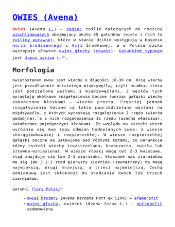 OWIES (Avena) Owies (Avena L.) – rodzaj roślin należących do rodziny wiechlinowatych obejmujący około 35 gatunków (wiele z nich to rośliny uprawne), które w stanie dzikim występują w basenie morza Śródziemnego i Azji Środkowej, a w Polsce dziko występuje głównie owies głuchy (chwast). Gatunkiem typowym jest Avena sativa L.[2]. Morfologia Kwiatostanem owsa jest wiecha o długości 10-30 cm. Osią wiechy jest przedłużenie ostatniego międzywęźla, czyli osadka, która jest podzielona węzłami i międzywęźlami. Z węzłów tych wyrastają okółkowo rozgałęzienia boczne tworząc gałązki wiechy zakończone kłoskami – wiecha prosta. Częściej jednak rozgałęzienia boczne są także poprzedzielane węzłami na międzywęźla, z których wyrastają rozgałęzienia I rzędu (wiecha podwójna), a z nich rozgałęzienia II rzędu (wiecha właściwa), zakończone pojedynczymi kłoskami. Ze względu na kształt wiech wyróżnia się dwa typy odmian hodowlanych owsa: o wiesze chorągiewkowatej i rozpierzchłej. W wiesze rozpierzchłej gałązki boczne są ustawione pod różnymi kątami, co warunkuje różny kształt wiechy (rozstrzelona, krzaczasta, zwisła lub sztywna-wzniesiona). W wiesze kłoski mogą być 2-3 kwiatowe, stąd znajduję się tam 2-3 ziarniaki. Stosunek mas ziarniaków ma się jak 3:2:1 stąd pierwszy ziarniak (zewnętrzny) ma masę największą, drugi mniejszą, a trzeci najmniejszą. Cechą odmianową jest skłonność do osadzania dwóch lub trzech ziarniaków. Gatunki flory Polski[5] owies brodaty (Avena barbata Pott ex Link) – efemerofit owies głuchy, owiesek (Avena fatua L.) – antropofit zadomowiony owies jednostronny (Avena orientalis Schreb.) – gatunek uprawiany owies krótki (Avena brevis Roth) – efemerofit owies nagi (Avena nuda L. em. Mansf.) – efemerofit owies płonny (Avena sterilis L.) – efemerofit owies pośredni (Avena × vilis Wallr., syn. Avena x hybrida Peterm.) – antropofit zadomowiony owies szorstki, o. owsik (Avena strigosa Schreb.) – antropofit zadomowiony owies zwyczajny (Avena sativa L.) – gatunek uprawiany Zastosowanie Większość w rodzaju Avena stanowią gatunki dzikie i chwasty. Rośliną uprawną jest przede wszystkim Avena sativa (ok. 90% upraw na świecie), a pozostałymi uprawnymi są: A. strigosa, A. abyssinica, A. bizantina i A. fatua. Wyprodukowane w Polsce ziarno owsa w 80% przeznacza się na paszę, w 15% na materiał siewny, resztę na cele konsumpcyjne. Jednak coraz bardziej poznawane są właściwości chemiczne owsa i znajduje się dla niego coraz bardziej różnorodne zastosowanie: w dietetyce, w lecznictwie, w przemyśle farmaceutycznym, kosmetycznym i chemicznym. Uprawa – Rozprzestrzenienie upraw Na świecie uprawia się owies na ok. 17,9 mln ha, co stanowi 3% areału zajętego przez zboża. Średni plon z ha wynosi ok. 2 ton. Najwyższe plony z 1 ha uzyskuje się w Irlandii (6t), Holandii (5,8t) i Anglii (5,5t). W Polsce uzyskuje się średnio plony rzędu 2,53 t/ha. Przed wojną powierzchnia upraw owsa w Polsce wynosiła ok.1 mln ha, jednak w miarę rozwoju mechanizacji, gdy systematycznie zmniejszało się pogłowie koni, zmniejszał się też jego udział w strukturze zasiewów zbóż i teraz zajmuje ok. 6% (550 tys ha). Większość upraw tego zboża zlokalizowane jest na półkuli północnej, pomiędzy 35 a 50 stopniem szerokości geograficznej. Zasięg uprawy owsa w krajach Europy Zachodniej dochodzi do północnych fiordów norweskich, a na południu do ujścia rzek francuskich, wpadających do Zatoki Baskijskiej. Roślina ta uprawiana jest również w Azji, Ameryce Północnej i Południowej, Australii i Nowej Zelandii. W górskich terenach uprawy sięgają wysokości 1000 m n.p.m., a powyżej 700 m n.p.m. jest jedynym uprawianym zbożem. Warunki klimatyczne Polski umożliwiają uprawę owsa na terenie całego kraju. Znaczenie jednak tego gatunku zboża jest dość zróżnicowane w poszczególnych rejonach. Duży udział owsa w strukturze zasiewów obserwuje się w rejonach podgórskich i górskich oraz północnej i północno-wschodniej części kraju, ze względu na szczególnie korzystne warunki do jego uprawy.