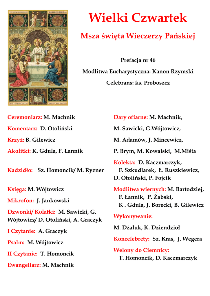 Wielki Czwartek Msza święta Wieczerzy Pańskiej Prefacja nr 46 Modlitwa Eucharystyczna: Kanon Rzymski Celebrans: ks. Proboszcz Ceremoniarz: M. Machnik Dary ofiarne: M. Machnik, Komentarz: D. Otoliński M. Sawicki, G.Wójtowicz, Krzyż: B. Gilewicz M. Adamów, J. Mincewicz, Akolitki: K. Gdula, F. Łannik P. Brym, M. Kowalski, M.Miśta Kadzidło: Sz. Homoncik/ M. Ryzner Kolekta: D. Kaczmarczyk, F. Szkudlarek, Ł. Ruszkiewicz, D. Otoliński, P. Fojcik Księga: M. Wójtowicz Mikrofon: J. Jankowski Dzwonki/ Kołatki: M. Sawicki, G. Wójtowicz/ D. Otoliński, A. Graczyk I Czytanie: A. Graczyk Psalm: M. Wójtowicz II Czytanie: T. Homoncik Ewangeliarz: M. Machnik Modlitwa wiernych: M. Bartodziej, F. Łannik, P. Żabski, K . Gdula, J. Borecki, B. Gilewicz Wykonywanie: M. Dżaluk, K. Dziendzioł Koncelebrety: Sz. Kras, J. Wegera Welony do Ciemnicy: T. Homoncik, D. Kaczmarczyk