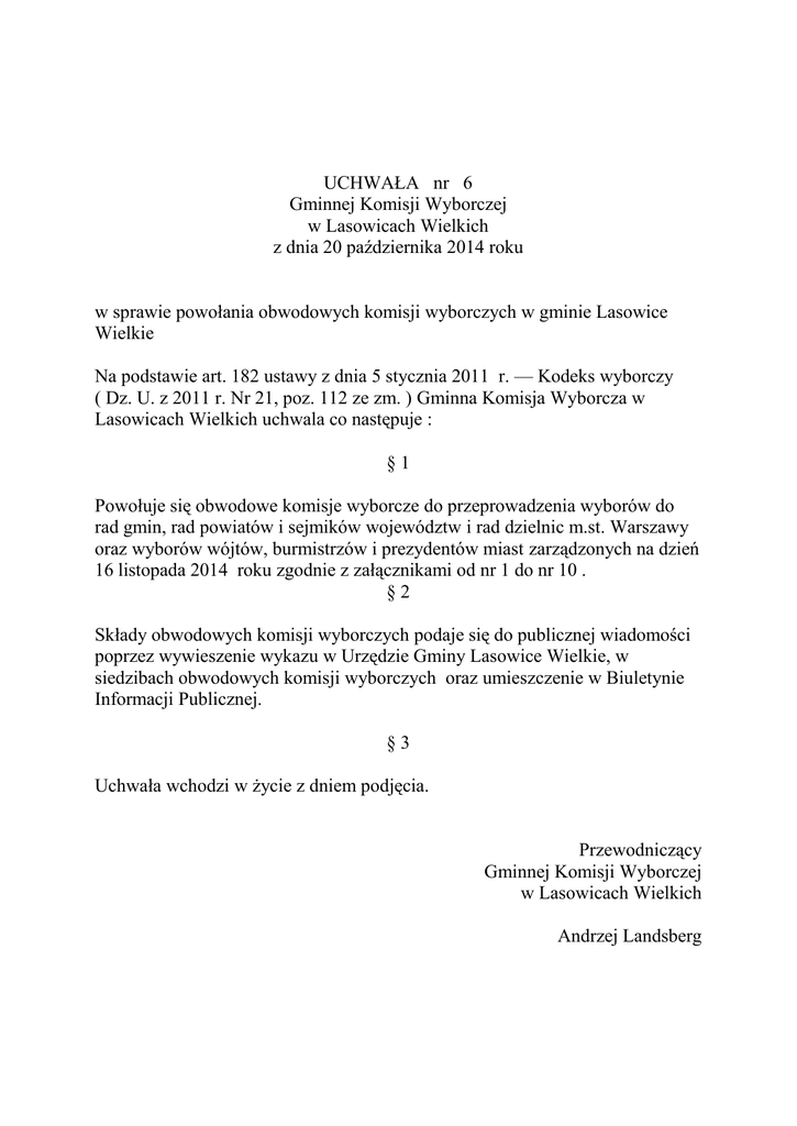 UCHWAŁA nr 6 Gminnej Komisji Wyborczej w Lasowicach Wielkich z dnia 20 października 2014 roku w sprawie powołania obwodowych komisji wyborczych w gminie Lasowice Wielkie Na podstawie art. 182 ustawy z dnia 5 stycznia 2011 r. — Kodeks wyborczy ( Dz. U. z 2011 r. Nr 21, poz. 112 ze zm. ) Gminna Komisja Wyborcza w Lasowicach Wielkich uchwala co następuje : §1 Powołuje się obwodowe komisje wyborcze do przeprowadzenia wyborów do rad gmin, rad powiatów i sejmików województw i rad dzielnic m.st. Warszawy oraz wyborów wójtów, burmistrzów i prezydentów miast zarządzonych na dzień 16 listopada 2014 roku zgodnie z załącznikami od nr 1 do nr 10 . §2 Składy obwodowych komisji wyborczych podaje się do publicznej wiadomości poprzez wywieszenie wykazu w Urzędzie Gminy Lasowice Wielkie, w siedzibach obwodowych komisji wyborczych oraz umieszczenie w Biuletynie Informacji Publicznej. §3 Uchwała wchodzi w życie z dniem podjęcia. Przewodniczący Gminnej Komisji Wyborczej w Lasowicach Wielkich Andrzej Landsberg Załącznik nr 1 do Uchwały nr 6 Gminnej Komisji Wyborczej w Lasowicach Wielkich z dnia 20.10. 20104 r. OBWÓD WYBORCZY NR 1 W ZESPOLE GIMNAZJALNO-SZKOLNOPRZEDSZKOLNYM CHOCIANOWICE 78 Lasowice Wielkie 4 Wójt Gminy § 2 uchwały PKW z dnia 22.09.2014 r. KKW SLD LEWICA RAZEM Lasowice Wielkie KW PSL Jasienie KW PO RP 5 Imię i nazwisko 2 Mariusz Jurczyk Przemysław Kasztelan Klaudiusz Minkus Magdalena Kowalska Katrin Drajok Chocianowice KWW Wsi Opolskiej 6 Dorota Koj Chocianowice KWW Mniejszość Niemiecka 7 Mateusz Meryk Dominika StanoszekPasieka Patrycja Obolewicz Chocianowice KW Nowa Prawica Janusza Korwin-Mikke KWW Porozumienie Samorządowe Po Sa Lp. 1 1 2 3 4 8 9 Miejsce zamieszkania 3 Gronowice Chcianowice Chocianowice Organ zgłaszający KWW Gospodarne Opole Załącznik nr 2 do Uchwały nr 6 Gminnej Komisji Wyborczej w Lasowicach Wielkich z dnia 20.10. 2014 r. OBWÓD WYBORCZY NR 2 W SALI OSP CIARKA 28 C Lp. 1 1 Imię i nazwisko 2 Diana Sumisławska Radosław Kasztelan Joanna Janas Miejsce zamieszkania 3 Lasowice Wielkie Organ zgłaszający Lasowice Wielkie 4 Wójt Gminy § 2 uchwały PKW z dnia 22.09.2014 r. KKW SLD LEWICA RAZEM Lasowice Małe KW PSL Chudoba KW P i S 5 Monika Ludwig Karina Cicha Ciarka KW PO RP 6 Judyta Lipa Chocianowice KWW Wsi Opolskiej 7 Andrzej Dziuba Maciej Sitek Gronowice KW Nowa Prawica Janusza Korwin-Mikke KWW Porozumienie Samorządowe Po Sa KWW Gospodarne Opole 2 3 4 8 9 Magdalena Pasieka Lasowice Małe Chocianowice Załącznik nr 3 do Uchwały nr 6 Gminnej Komisji Wyborczej w Lasowicach Wielkich z dnia 20.10. 2014 r. OBWÓD WYBORCZY NR 3 W ZESPOLE SZKOLNO-PRZEDSZKOLNYM GRONOWICE 58 1 1 Imię i nazwisko 2 Sabina Szirch 2 Paweł Pawlicki Lasowice Wielkie 4 Wójt Gminy § 2 uchwały PKW z dnia 22.09.2014 r. KKW SLD LEWICA RAZEM 3 Jasienie KW PSL Gronowice KW P i S Jasienie KW PO RP Lasowice Wielkie KWW Wsi Opolskiej 7 Gabriela Maruska Władysław Zagaja Sylwia Widziszowska Kamil Neumann Anna Jantos Gronowice KWW Mniejszość Niemiecka 8 Anna Zagaja Gronowice 9 Urszula Krawczyk Chocianowice KWW Porozumienie Samorządowe Po Sa KWW Gospodarne Opole Lp. 4 5 6 Miejsce zamieszkania 3 Jasienie Organ zgłaszający Załącznik nr 4 do Uchwały nr 6 Gminnej Komisji Wyborczej w Lasowicach Wielkich z dnia 20.10. 2014 r. OBWÓD WYBORCZY NR 4 W SALA OSP LASOWICE MAŁE ODRODZENIA 34 Lp. Imię i nazwisko 1 1 2 Małgorzata Lizoń 3 Lasowice Małe 2 Bożena Hrywna Lasowice Wielkie 4 Wójt Gminy § 2 uchwały PKW z dnia 22.09.2014 r. KKW SLD LEWICA RAZEM 3 Maria Chrobak Lasowice Małe KW PSL 4 Michał Palmer Chudoba KW P i S 5 Urszula Kowalska Lasowice Małe KWW Wsi Opolskiej 6 Nina Drong Jasienie KWW Mniejszość Niemiecka 7 Maciej Dziuba Lasowice Małe 8 Marianna Jach Lasowice Małe 9 Anna Zymiak Lasowice Małe KW Nowa Prawica – Janusza Korwin-Mikke KWW Porozumienie Samorządowe Po Sa KWW Gospodarne Opole Miejsce zamieszkania Organ zgłaszający Załącznik nr 5 do Uchwały nr 6 Gminnej Komisji Wyborczej w Lasowicach Wielkich z dnia 20.10. 2014 r. OBWÓD WYBORCZY NR 5 W ZESPOLE SZKOLNO-PRZEDSZKOLNYM JASIENIE UL. ZWYCIĘSTWA 15 Lp. 1 1 2 3 4 5 6 7 8 9 Imię i nazwisko 2 Andrzej Lis Miejsce zamieszkania 3 Jasienie Helena Jasicka Adam Kaczmar Małgorzata Wyrwa Bartłomiej Małyska Mariusz Prochota Irena Mrugalla Katarzyna Dziuba Dariusz Jach Lasowice Małe 4 Wójt Gminy § 2 uchwały PKW z dnia 22.09.2014 r. KKW SLD LEWICA RAZEM Jasienie KW PSL Chudoba KW P i S Lasowice Małe KW PO RP Wędrynia KWW Wsi Opolskiej Jasienie KWW Mniejszość Niemiecka Lasowice Małe KW Nowa Prawica Janusza KorwinMikke KWW Porozumienie Samorządowe Po Sa Lasowice Małe Organ zgłaszający Załącznik nr 6 do Uchwały nr 6 Gminnej Komisji Wyborczej w Lasowicach Wielkich z dnia 20.10. 2014 r. OBWÓD WYBORCZY NR 6 W SALA WIEJSKA TUŁY 39 a Lp. 1 1 Imię i nazwisko 2 Mateusz Jośko Miejsce zamieszkania Lasowice Wielkie 3 Katarzyna Mieszkalska Róża Boreńska 4 Wójt Gminy § 2 uchwały PKW z dnia 22.09.2014 r. KKW SLD LEWICA RAZEM Trzebiszyn KW PSL 4 Monika Jośko Lasowice Wielkie KW P i S 5 Lasowice Wielkie KW PO RP 6 Krzysztofa Hrywna Kamil Oboza Lasowice Wielkie KWW Wsi Opolskiej 7 Irena Bawej Tuły KWW Mniejszość Niemiecka 8 Dominika Jach Lasowice Małe 9 Kamila Rubin Lasowice Małe KWW Porozumienie Samorządowe Po Sa KWW Gospodarne Opole 2 3 Lasowice Wielkie Organ zgłaszający Załącznik nr 7 do Uchwały nr 6 Gminnej Komisji Wyborczej w Lasowicach Wielkich z dnia 20.10. 2014 r. OBWÓD WYBORCZY NR 7 W PRZEDSZKOLU SAMORZĄDOWYM LASKOWICE SZKOLNA 20 3 Imię i nazwisko 2 Lucyna Smolnik Andrzej Smolnik Rafał Boreński 4 Sandra Palmer Chudoba KW P i S 5 Alicja Mencweld Renata Plewnia Dżesika Skrzypek Bogumiła Dziuba Agata Zymiak Wędrynia KWW Wsi Opolskiej Laskowice KWW Mniejszość Niemiecka Laskowice KW Ruch Autonomii Śląska Lasowice Małe KW Nowa Prawica Janusza Korwin-Mikke KWW Gospodarne Opole Lp. 1 1 2 6 7 8 9 Miejsce zamieszkania 3 Lasowice Wielkie Organ zgłaszający L