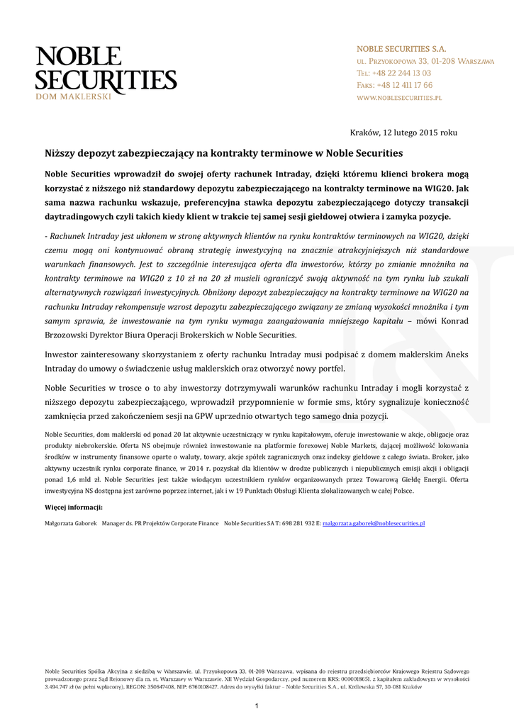 Kraków, 12 lutego 2015 roku Niższy depozyt zabezpieczający na kontrakty terminowe w Noble Securities Noble Securities wprowadził do swojej oferty rachunek Intraday, dzięki któremu klienci brokera mogą korzystać z niższego niż standardowy depozytu zabezpieczającego na kontrakty terminowe na WIG20. Jak sama nazwa rachunku wskazuje, preferencyjna stawka depozytu zabezpieczającego dotyczy transakcji daytradingowych czyli takich kiedy klient w trakcie tej samej sesji giełdowej otwiera i zamyka pozycje. - Rachunek Intraday jest ukłonem w stronę aktywnych klientów na rynku kontraktów terminowych na WIG20, dzięki czemu mogą oni kontynuować obraną strategię inwestycyjną na znacznie atrakcyjniejszych niż standardowe warunkach finansowych. Jest to szczególnie interesująca oferta dla inwestorów, którzy po zmianie mnożnika na kontrakty terminowe na WIG20 z 10 zł na 20 zł musieli ograniczyć swoją aktywność na tym rynku lub szukali alternatywnych rozwiązań inwestycyjnych. Obniżony depozyt zabezpieczający na kontrakty terminowe na WIG20 na rachunku Intraday rekompensuje wzrost depozytu zabezpieczającego związany ze zmianą wysokości mnożnika i tym samym sprawia, że inwestowanie na tym rynku wymaga zaangażowania mniejszego kapitału – mówi Konrad Brzozowski Dyrektor Biura Operacji Brokerskich w Noble Securities. Inwestor zainteresowany skorzystaniem z oferty rachunku Intraday musi podpisać z domem maklerskim Aneks Intraday do umowy o świadczenie usług maklerskich oraz otworzyć nowy portfel. Noble Securities w trosce o to aby inwestorzy dotrzymywali warunków rachunku Intraday i mogli korzystać z niższego depozytu zabezpieczającego, wprowadził przypomnienie w formie sms, który sygnalizuje konieczność zamknięcia przed zakończeniem sesji na GPW uprzednio otwartych tego samego dnia pozycji. Noble Securities, dom maklerski od ponad 20 lat aktywnie uczestniczący w rynku kapitałowym, oferuje inwestowanie w akcje, obligacje oraz produkty niebrokerskie. Oferta NS obejmuje również inwestowanie na platformie forexowej Noble Markets, dającej możliwość lokowania środków w instrumenty finansowe oparte o waluty, towary, akcje spółek zagranicznych oraz indeksy giełdowe z całego świata. Broker, jako aktywny uczestnik rynku corporate finance, w 2014 r. pozyskał dla klientów w drodze publicznych i niepublicznych emisji akcji i obligacji ponad 1,6 mld zł. Noble Securities jest także wiodącym uczestnikiem rynków organizowanych przez Towarową Giełdę Energii. Oferta inwestycyjna NS dostępna jest zarówno poprzez internet, jak i w 19 Punktach Obsługi Klienta zlokalizowanych w całej Polsce. Więcej informacji: Małgorzata Gaborek Manager ds. PR Projektów Corporate Finance Noble Securities SA T: 698 281 932 E: [email protected] 1