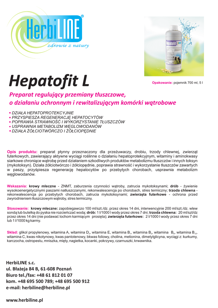 Hepatofit L Opakowanie: pojemnik 700 ml, 5 l Preparat reguluj¹cy przemiany t³uszczowe, o dzia³aniu ochronnym i rewitalizuj¹cym komórki w¹trobowe DZIA£A HEPATOPROTEKCYJNIE PRZYSPIESZA REGENERACJÊ HEPATOCYTÓW POPRAWIA STRAWNOŒÆ I WYKORZYSTANIE T£USZCZÓW USPRAWNIA METABOLIZM WÊGLOWODANÓW DZIA£A ¯Ó£CIOTWÓRCZO I ¯Ó£CIOPÊDNIE Opis produktu: preparat p³ynny przeznaczony dla prze¿uwaczy, drobiu, trzody chlewnej, zwierz¹t futerkowych, zawieraj¹cy aktywne wyci¹gi roœlinne o dzia³aniu hepatoprotekcyjnym, witaminy i aminokwasy siarkowe chroni¹ce w¹trobê przed dzia³aniem szkodliwych produktów metabolizmu t³uszczów i innych toksyn (mykotoksyn). Dzia³a ¿ó³ciotwórczo i ¿ó³ciopêdnie, poprawia strawnoœæ i wykorzystanie t³uszczów zawartych w paszy, przyœpiesza regeneracjê hepatocytów po przebytych chorobach, usprawnia metabolizm wêglowodanów. Wskazania: krowy mleczne - ZNMT, zaburzenia czynnoœci w¹troby, zatrucia mykotoksynami; drób - ¿ywienie wysokoenergetycznymi paszami nat³uszczanymi, rekonwalescencja po chorobach, stres termiczny; trzoda chlewna rekonwalescencja po przebytych chorobach, zatrucia mykotoksynami; zwierzêta futerkowe - ochrona przed zwyrodnieniem t³uszczowym w¹troby, stres termiczny. Stosowanie: krowy mleczne: zapobiegawczo 100 ml/szt./dz. przez okres 14 dni, interwencyjnie 200 ml/szt./dz. wlew sond¹ lub butelk¹ do pyska nie rozcieñczaæ wod¹; drób: 1 l/1000 l wody przez okres 7 dni; trzoda chlewna: 20 ml/szt/dz przez okres 14 dni (nie podawaæ lochom karmi¹cym prosiêta); zwierzêta futerkowe: 2 l/1000 l wody przez okres 7 dni lub 1 l/1000 kg karmy. Sk³ad: glikol propylenowy, witamina A, witamina D3, witamina E, witamina B1, witamina B2, witamina B6, witamina B12, witamina C, kwas nikotynowy, kwas pantotenowy, bkwas foliowy, cholina, metionina, dimetylglicyna, wyci¹gi z: kurkumy, karczocha, ostropestu, mniszka, miêty, nagietka, kocanki, pokrzywy, czarnuszki, krwawnika. HerbiLINE s.c. ul. B³a¿eja 84 B, 61-608 Poznañ Biuro tel./fax: +48 61 812 01 07 kom. +48 695 500 789; +48 695 500 912 e-mail: [email protected] www.herbiline.pl