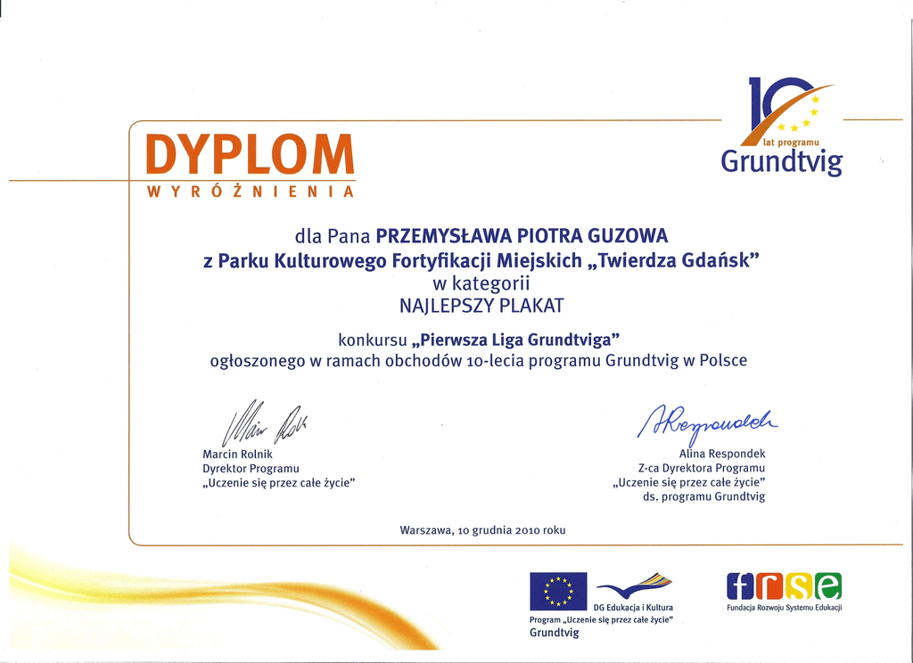 DYPLOM lat programu Grundtvig WYRÓŻNIENIA dla Pana PRZEMYSŁAWA PIOTRA GUZOWA z Parku Kulturowego Fortyfikacji Miejskich "Twierdza Gdańsk" w kategorii NAJLEPSZY PLAKAT konkursu "Pierwsza Liga Grundtviga" ogłoszonego w ramach obchodów lo-lecia programu Grundtvig w Polsce Itp Alina Respondek Z-ca Dyrektora Programu "Uczenie się przez całe życie" ds. programu Grundtvig Marcin Rolnik Dyrektor Programu "Uczenie się przez całe życie" Warszawa, 10 grudnia 2010 roku • ~ ~ DG Edukacja i Kultura Program "Uczenie się przez cale życie" Grundtvig (11I~[il Fundacja Rozwoju Systemu Edukacji .',