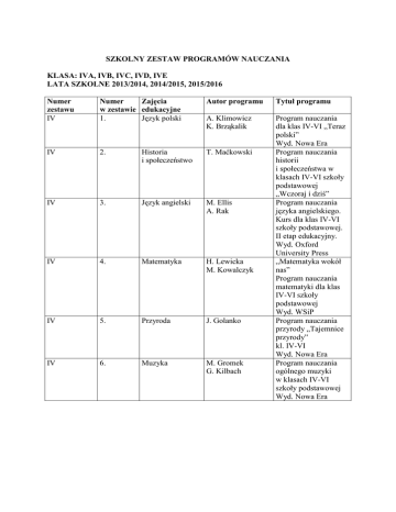 SZKOLNY ZESTAW PROGRAMÓW NAUCZANIA KLASA: IVA, IVB, IVC, IVD, IVE LATA SZKOLNE 2013/2014, 2014/2015, 2015/2016 Numer zestawu IV Numer Zajęcia w zestawie edukacyjne 1. Język polski Autor programu Tytuł programu A. Klimowicz K. Brząkalik Program nauczania dla klas IV-VI „Teraz polski” Wyd. Nowa Era Program nauczania historii i społeczeństwa w klasach IV-VI szkoły podstawowej „Wczoraj i dziś” Program nauczania języka angielskiego. Kurs dla klas IV-VI szkoły podstawowej. II etap edukacyjny. Wyd. Oxford University Press „Matematyka wokół nas” Program nauczania matematyki dla klas IV-VI szkoły podstawowej Wyd. WSiP Program nauczania przyrody „Tajemnice przyrody” kl. IV-VI Wyd. Nowa Era Program nauczania ogólnego muzyki w klasach IV-VI szkoły podstawowej Wyd. Nowa Era IV 2. Historia i społeczeństwo T. Maćkowski IV 3. Język angielski M. Ellis A. Rak IV 4. Matematyka H. Lewicka M. Kowalczyk IV 5. Przyroda J. Golanko IV 6. Muzyka M. Gromek G. Kilbach IV 7. Plastyka B. Mikulik Program nauczania plastyki w klasach IVVI szkoły podstawowej Wyd. WSiP „Bądź bezpieczny na drodze. Program nauczania zajęć technicznych w kl. IV-VI szkoły podstawowej” WSiP Informatyka Europejczyka. Program nauczania do zajęć komputerowych w szkole podstawowej klasy 4-6 Wyd. Helion Program nauczania wychowania fizycznego dla II etapu edukacyjnego „Ruch – zdrowie dla kaŜdego” IV 8. Zajęcia techniczne B. BogackaOsińska D. Łazuchiewicz IV 9. Zajęcia komputerowe D. Kiałka IV 10. Wychowanie fizyczne S. śołyński IV 11. Religia/etyka Praca zbiorowa „Poznaję Boga i w Niego wierzę” A. Rydzewska Program własny nauczania etyki w klasach IV-VI SZKOLNY ZESTAW PROGRAMÓW NAUCZANIA KLASA: VA, VB, VC, VD, VE LATA SZKOLNE 2013/2014, 2014/2015 Numer zestawu V Numer Zajęcia w zestawie edukacyjne 1. Język polski V 2. Historia i społeczeństwo V 3. Język angielski V 4. Matematyka V 5. Przyroda V 6. Muzyka Autor programu Tytuł programu Anna Klimowicz Program nauczania Krystyna Brząkalik dla klas IV-VI „Teraz polski” Wyd. Nowa Era Tomasz Maćkowski Program nauczania historii i społeczeństwa w klasach IV-VI szkoły podstawowej „Wczoraj i dziś” Melanie Ellis Program nauczania Anna Rak języka angielskiego. Kurs dla klas IV-VI szkoły podstawowej. II etap edukacyjny. Wyd. Oxford University Press Helena Lewicka „Matematyka wokół Marianna nas” Kowalczyk Program nauczania matematyki dla klas IV-VI szkoły podstawowej Wyd. WSiP Jolanta Golanko Program nauczania przyrody „Tajemnice przyrody” kl. IV-VI Wyd. Nowa Era Monika Gromek Program nauczania GraŜyna Kilbach ogólnego muzyki w klasach IV-VI szkoły podstawowej Wyd. Nowa Era V 7. Plastyka Beata Mikulik V 8. Zajęcia techniczne E. Bubak V 9. Zajęcia komputerowe D. Kiałka V 10. Wychowanie fizyczne Stanisław śołyński Anna Kuźmińska Jacek Narewski V 11. Religia/etyka R. Szewczyk A. Rydzewska Program nauczania plastyki w klasach IVVI szkoły podstawowej Wyd. WSiP „Technika na co dzień” Program nauczania zajęć technicznych w kl. 4-6 szkoły podstawowej” WSiP Informatyka Europejczyka. Program nauczania do zajęć komputerowych w szkole podstawowej klasy 4-6 Wyd. Helion Program nauczania wychowania fizycznego dla II etapu edukacyjnego „Ruch – zdrowie dla kaŜdego” Program własny dla klasy sportowej w SP nr 7 w Legionowie o profilu judo – dziewczęta, piłka noŜna - chłopcy „Wezwani przez Boga” Kuria Diecezji Warszawsko-Praskiej Program własny nauczania etyki w klasach IV-VI ŚcieŜka edukacyjna na lata szkolne 2013/2014 V 12. Wychowanie do Ŝycia w rodzinie „Wychowanie DKW-4014T. Król do Ŝycia 253A/99 K. Maśnik G. Węglarczyk w rodzinie, program dla klas V-VI szkoły podstawowej” Wyd. „Rubikon” SZKOLNY ZESTAW PROGRAMÓW NAUCZANIA KLASA: VIA, VIB, VIC, VID, VIE, VIF LATA SZKOLNE 2013/2014 Numer zestawu VI Zajęcia Numer w zestawie edukacyjne 1. Język polski Autor programu Praca zbiorowa VI 2. Historia i społeczeństwo Praca zbiorowa VI 3. Język angielski Melanie Ellis Marianna Niesborska Anna Rak Tytuł programu „Słowa jak klucze” WSiP „ A to historia!” CEO Program nauczania języka angielskiego dla klas IV-VI szkoły podstawowej Oxford University Numer dopuszczenia DKW- 401434/99 DKW-401458/99 DKW – 401459/99 VI 4. Matematyka VI 5. Przyroda VI 6. Muzyka VI 7. Plastyka VI 8. Technika VI 9. Informatyka VI 10. Wychowanie fizyczne Helena Lewicka „Matematyka Marianna wokół nas” Kowalczyk Program nauczania matematyki dla klas IV-VI szkoły podstawowej Wyd. WSiP E. Gromek Program E. Kłos nauczania W. Kofta przyrody E. Laskowska Wyd. WSiP A. Melsor pod redakcją W. Kofty P. Piątek „Malowane muzyką” Program nauczania sztuki (muzyki) Wyd. ARKA S. Stopczyk „Plastyka” B. Neubart WSiP W. Bober „Program E. Królicka nauczania D. Łazarkiewicz techniki w szkole podstawowej kl. IV-VI” WSiP D. Kiałka Informatyka z zespołem Europejczyka. Program nauczania informatyki w szkole podstawowej klasy 4-6 Wyd. Helion A. Romanowska „Autorski program wychowania fizycznego dla klas IV-VI” Wyd. „Korepetytor” DKOS-500202/08 DKOS-500265/04 DKW-401415/00 DKW-4014152/99 DKW-4014221/99 DKOS-500238/05 DKW-401468/99 VI 11. Religia/etyka R. Szewczyk „Wezwani przez Boga” Kuria Diecezji WarszawskoPraskiej A. Rydzewska Program własny nauczania etyki w klasach IV-VI AZ-2-01/1 ŚcieŜka edukacyjna na lata szkolne 2012/2013 VI 12. Wychowanie do Ŝycia w rodzinie Pozytywna opinia Rady Pedagogicznej z dnia 13 czerwca 2013r. T. Król „Wychowanie DKW-4014K. Maśnik do Ŝycia 253A/99 G. Węglarczyk w rodzinie, program dla klas V-VI szkoły podstawowej” Wyd. „Rubikon” Dopuszczam do uŜytku szkolnego Dyrektor szkoły Małgorzata Marszałek