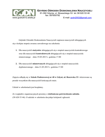 GDYŃSKI OŚRODEK DOSKONALENIA NAUCZYCIELI www.godn2012.strefa.pl 81-392 Gdynia, ul. Słowackiego 53 tel.:58 620 53 46 fax: 587650792 E-mail: [email protected] Gdyński Ośrodek Doskonalenia Nauczycieli zaprasza nauczycieli ubiegających się o kolejne stopnie awansu zawodowego na szkolenia: 1. Dla nauczycieli stażystów ubiegających się o stopień nauczyciela kontraktowego oraz dla nauczycieli kontraktowych ubiegających się o stopień nauczyciela mianowanego - dnia 19.05.2015 r. godzina 17.00 2. Dla nauczycieli mianowanych ubiegających się o stopień nauczyciela dyplomowanego – dnia 21.05.2015 r. godzina 17.00 Zajęcia odbędą się w Szkole Podstawowej nr 40 w Gdyni, ul. Rozewska 33 i skierowane są przede wszystkim dla nauczycieli kończących staże. Udział w szkoleniach jest bezpłatny. Ze względów organizacyjnych prosimy o telefoniczne potwierdzenie udziału. (58 620 53 46). O udziale w szkoleniu decyduje kolejność zgłoszeń.