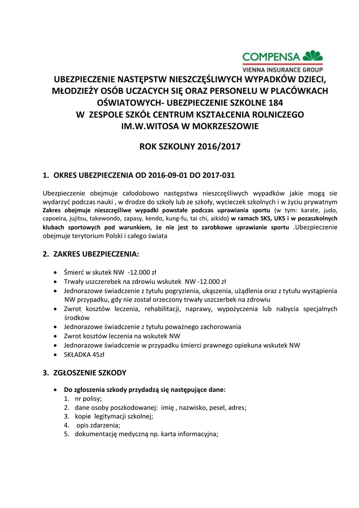 UBEZPIECZENIE NASTĘPSTW NIESZCZĘŚLIWYCH WYPADKÓW DZIECI, MŁODZIEŻY OSÓB UCZACYCH SIĘ ORAZ PERSONELU W PLACÓWKACH OŚWIATOWYCH- UBEZPIECZENIE SZKOLNE 184 W ZESPOLE SZKÓŁ CENTRUM KSZTAŁCENIA ROLNICZEGO IM.W.WITOSA W MOKRZESZOWIE ROK SZKOLNY 2016/2017 1. OKRES UBEZPIECZENIA OD 2016-09-01 DO 2017-031 Ubezpieczenie obejmuje całodobowo następstwa nieszczęśliwych wypadków jakie mogą sie wydarzyć podczas nauki , w drodze do szkoły lub ze szkoły, wycieczek szkolnych i w życiu prywatnym Zakres obejmuje nieszczęśliwe wypadki powstałe podczas uprawiania sportu (w tym: karate, judo, capoeira, jujitsu, takewondo, zapasy, kendo, kung-fu, tai chi, aikido) w ramach SKS, UKS i w pozaszkolnych klubach sportowych pod warunkiem, że nie jest to zarobkowe uprawianie sportu .Ubezpieczenie obejmuje terytorium Polski i całego świata 2. ZAKRES UBEZPIECZENIA: Śmierć w skutek NW -12.000 zł Trwały uszczerebek na zdrowiu wskutek NW -12.000 zł Jednorazowe świadczenie z tytułu pogryzienia, ukąszenia, użądlenia oraz z tytułu wystąpienia NW przypadku, gdy nie został orzeczony trwały uszczerbek na zdrowiu Zwrot kosztów leczenia, rehabilitacji, naprawy, wypożyczenia lub nabycia specjalnych środków Jednorazowe świadczenie z tytułu poważnego zachorowania Zwrot kosztów leczenia na wskutek NW Jednorazowe świadczenie w przypadku śmierci prawnego opiekuna wskutek NW SKŁADKA 45zł 3. ZGŁOSZENIE SZKODY Do zgłoszenia szkody przydadzą się następujące dane: 1. nr polisy; 2. dane osoby poszkodowanej: imię , nazwisko, pesel, adres; 3. kopie legitymacji szkolnej; 4. opis zdarzenia; 5. dokumentację medyczną np. karta informacyjna; 6. nr konta rodzica/prawnego opiekuna, telefon kontaktowy; 7. inne dane wymagane przy zgłoszeniu. 8. Druki zgłoszenia szkody dostępne są na stronie Compensa www.compensa.pl i bądż w szkole lub u agenta obsługującego ubezpieczenie szkoły 4. LIKWIDACJA SZKODY Pisemnie za pośrednictwem poczty Adres: COMPENSA TU S.A. VIG 02-342 WARSZAWA AL.JEROZLIMSKIE 162 OSOBISCIE W KAŻDEJ PLACÓWCE COMPENSY Agent Compensy Janina Szlosek 58-160 Świebodzice ul. H. Pobożnego 15 kom. 605600667 tel.74 8542965 od poniedziałku do piątku od godz.10. d0 17.00 Ważne informacje: Ogólne Warunki Ubezpieczenia – w załączeniu; dostępne również w placówce szkolnej i u Agenta. i