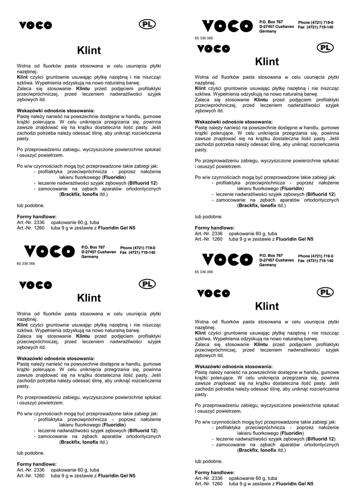 65 336 066 Klint Wolna od fluorków pasta stosowana w celu usunięcia płytki nazębnej. Klint czyści gruntownie usuwając płytkę nazębną i nie niszcząc szkliwa. Wypełnienia odzyskują na nowo naturalną barwę. Zaleca się stosowanie Klintu przed podjęciem profilaktyki przeciwpróchniczej, przed leczeniem nadwraŜliwości szyjek zębowych itd. Wskazówki odnośnie stosowania: Pastę naleŜy nanieść na powszechnie dostępne w handlu, gumowe krąŜki polerujące. W celu uniknięcia przegrzania się, powinna zawsze znajdować się na krąŜku dostateczna ilość pasty. Jeśli zachodzi potrzeba naleŜy odessać ślinę, aby uniknąć rozcieńczenia pasty. Po przeprowadzeniu zabiegu, wyczyszczone powierzchnie spłukać i osuszyć powietrzem. Po w/w czynnościach mogą być przeprowadzone takie zabiegi jak: - profilaktyka przeciwpróchnicza - poprzez nałoŜenie lakieru fluorkowego (Fluoridin) - leczenie nadwraŜliwości szyjek zębowych (Bifluorid 12) - zamocowanie na zębach aparatów ortodontycznych (Brackfix, Ionofix itd.) lub podobne. Formy handlowe: Art.-Nr. 2336 opakowanie 60 g, tuba Art.-Nr. 1260 tuba 9 g w zestawie z Fluoridin Gel N5 Klint Wolna od fluorków pasta stosowana w celu usunięcia płytki nazębnej. Klint czyści gruntownie usuwając płytkę nazębną i nie niszcząc szkliwa. Wypełnienia odzyskują na nowo naturalną barwę. Zaleca się stosowanie Klintu przed podjęciem profilaktyki przeciwpróchniczej, przed leczeniem nadwraŜliwości szyjek zębowych itd. Wskazówki odnośnie stosowania: Pastę naleŜy nanieść na powszechnie dostępne w handlu, gumowe krąŜki polerujące. W celu uniknięcia przegrzania się, powinna zawsze znajdować się na krąŜku dostateczna ilość pasty. Jeśli zachodzi potrzeba naleŜy odessać ślinę, aby uniknąć rozcieńczenia pasty. Po przeprowadzeniu zabiegu, wyczyszczone powierzchnie spłukać i osuszyć powietrzem. Po w/w czynnościach mogą być przeprowadzone takie zabiegi jak: - profilaktyka przeciwpróchnicza - poprzez nałoŜenie lakieru fluorkowego (Fluoridin) - leczenie nadwraŜliwości szyjek zębowych (Bifluorid 12) - zamocowanie na zębach aparatów ortodontycznych (Brackfix, Ionofix itd.) lub podobne. Formy handlowe: Art.-Nr. 2336 opakowanie 60 g, tuba Art.-Nr. 1260 tuba 9 g w zestawie z Fluoridin Gel N5 65 336 066 65 336 066 Klint Wolna od fluorków pasta stosowana w celu usunięcia płytki nazębnej. Klint czyści gruntownie usuwając płytkę nazębną i nie niszcząc szkliwa. Wypełnienia odzyskują na nowo naturalną barwę. Zaleca się stosowanie Klintu przed podjęciem profilaktyki przeciwpróchniczej, przed leczeniem nadwraŜliwości szyjek zębowych itd. Wskazówki odnośnie stosowania: Pastę naleŜy nanieść na powszechnie dostępne w handlu, gumowe krąŜki polerujące. W celu uniknięcia przegrzania się, powinna zawsze znajdować się na krąŜku dostateczna ilość pasty. Jeśli zachodzi potrzeba naleŜy odessać ślinę, aby uniknąć rozcieńczenia pasty. Po przeprowadzeniu zabiegu, wyczyszczone powierzchnie spłukać i osuszyć powietrzem. Po w/w czynnościach mogą być przeprowadzone takie zabiegi jak: - profilaktyka przeciwpróchnicza - poprzez nałoŜenie lakieru fluorkowego (Fluoridin) - leczenie nadwraŜliwości szyjek zębowych (Bifluorid 12) - zamocowanie na zębach aparatów ortodontycznych (Brackfix, Ionofix itd.) lub podobne. Formy handlowe: Art.-Nr. 2336 opakowanie 60 g, tuba Art.-Nr. 1260 tuba 9 g w zestawie z Fluoridin Gel N5 Klint Wolna od fluorków pasta stosowana w celu usunięcia płytki nazębnej. Klint czyści gruntownie usuwając płytkę nazębną i nie niszcząc szkliwa. Wypełnienia odzyskują na nowo naturalną barwę. Zaleca się stosowanie Klintu przed podjęciem profilaktyki przeciwpróchniczej, przed leczeniem nadwraŜliwości szyjek zębowych itd. Wskazówki odnośnie stosowania: Pastę naleŜy nanieść na powszechnie dostępne w handlu, gumowe krąŜki polerujące. W celu uniknięcia przegrzania się, powinna zawsze znajdować się na krąŜku dostateczna ilość pasty. Jeśli zachodzi potrzeba naleŜy odessać ślinę, aby uniknąć rozcieńczenia pasty. Po przeprowadzeniu zabiegu, wyczyszczone powierzchnie spłukać i osuszyć powietrzem. Po w/w czynnościach mogą być przeprowadzone takie zabiegi jak: - profilaktyka przeciwpróchnicza - poprzez nałoŜenie lakieru fluorkowego (Fluoridin) - leczenie nadwraŜliwości szyjek zębowych (Bifluorid 12) - zamocowanie na zębach aparatów ortodontycznych (Brackfix, Ionofix itd.) lub podobne. Formy handlowe: Art.-Nr. 2336 opakowanie 60 g, tuba Art.-Nr. 1260 tuba 9 g w zestawie z Fluoridin Gel N5 65 336 066