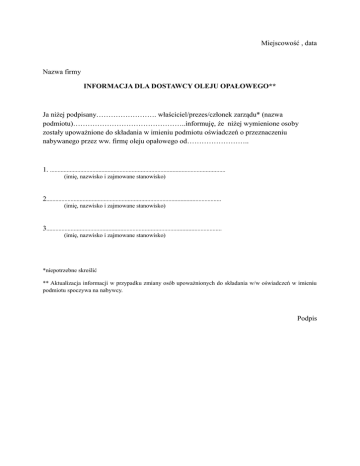 Miejscowość , data Nazwa firmy INFORMACJA DLA DOSTAWCY OLEJU OPAŁOWEGO** Ja niżej podpisany……………………. właściciel/prezes/członek zarządu* (nazwa podmiotu)………………………………………..informuję, że niżej wymienione osoby zostały upoważnione do składania w imieniu podmiotu oświadczeń o przeznaczeniu nabywanego przez ww. firmę oleju opałowego od…………………….. 1. .................................................................................................................... (imię, nazwisko i zajmowane stanowisko) 2.................................................................................................................... (imię, nazwisko i zajmowane stanowisko) 3.................................................................................................................... (imię, nazwisko i zajmowane stanowisko) *niepotrzebne skreślić ** Aktualizacja informacji w przypadku zmiany osób upoważnionych do składania w/w oświadczeń w imieniu podmiotu spoczywa na nabywcy. Podpis