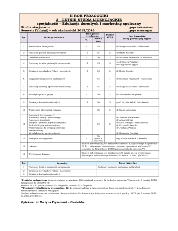 II ROK PEDAGOGIKI 3 - LETNIE STUDIA LICENCJACKIE specjalność – Edukacja dorosłych i marketing społeczny Studia stacjonarne Semestr IV (letni) – rok akademicki 2015/2016 Lp. Ilość godzin tygodniowo konw./ w. sem. Nazwa przedmiotu 1 Seminarium licencjackie 2 Podstawy prawne edukacji dorosłych 3 Dydaktyka dorosłych 4 1 grupa ćwiczeniowa 1 grupa seminaryjna Punkty ECTS Imię i nazwisko osoby prowadzącej zajęcia - 15 1 dr Małgorzata Malec – Rawiński 15 15 2 dr Beata Krawiec - 30 2 dr Martyna Pryszmont – Ciesielska Podstawy teorii organizacji i zarządzania 15 15 5 w: dr Marek Podgórny ćw: mgr Marta Cygan 5 Edukacja dorosłych w Polsce i na świecie 15 15 5 dr Beata Krawiec 6 Diagnozowanie potrzeb społecznych - 15 1 dr Martyna Pryszmont – Ciesielska 7 Podstawy animacji społeczno-kulturalnej 15 15 3 dr Małgorzata Malec – Rawiński 8 Metodyka pracy z grupą - 30 2 dr Aleksander Kobylarek 9 Edukacja kulturalna dorosłych 15 30 5 prof. dr hab. Witold Jakubowski 10 Wspieranie aktywności twórczej - 30 3 dr Maria Jabłońska 11 Przedmiot fakultatywny ** Warsztaty rozwoju zawodowego Negocjacje i mediacje Taktyka i technika kryminalistyczna Techniki fizjoterapii rozwojowej Wprowadzenie do terapii poznawczo – behawioralnej Metodyka pracy penitencjarnej - 15 2 dr dr dr dr dr Joanna Malinowska Anna Mitręga Ewa Jurczyk – Romanowska Fernando Penafiel Justyna Pilarska dr Sławomir Grzesiak 12 Praktyka pedagogiczna* 13 Lektorat Student zobowiązany jest zrealizować lektorat z języka obcego na poziomie B2 II z zaliczonym przedmiotem i zdanym egzaminem do końca VI semestru za 12 punktów ECTS (przypisanych do semestru VI) 14 Wychowanie fizyczne Student zobowiązany jest zrealizować 30 godzin zajęć z wychowania fizycznego z zaliczeniem przedmiotu do końca V sem. (ECTS–1) Lp. - 50 Egzaminy 1 Podstawy teorii organizacji i zarządzania 2 Edukacja dorosłych w Polsce i na świecie 3 Edukacja kulturalna dorosłych godzin w semestrze mgr Alicja Mironiuk - Netreba Prace kontrolne Podstawy animacji społeczno-kulturalnej *Praktykę pedagogiczną student realizuje w wymiarze 150 godzin od semestru IV do końca semestru VI za łącznie 3 punkty ECTS (przypisane do semestru VI): semestr IV – 50 godzin, semestr V – 50 godzin, semestr VI – 50 godzin. **Przedmioty fakultatywne w semestrze IV, V, student wybiera z opracowanej na dany rok akademicki oferty przedmiotów fakultatywnych Instytutu Pedagogiki. Student zobowiązany jest zrealizować dwa przedmioty fakultatywne (po jednym w semestrze) za 4 punkty ECTS (po 2 punkty ECTS za jeden przedmiot). Opiekun: dr Martyna Pryszmont – Ciesielska