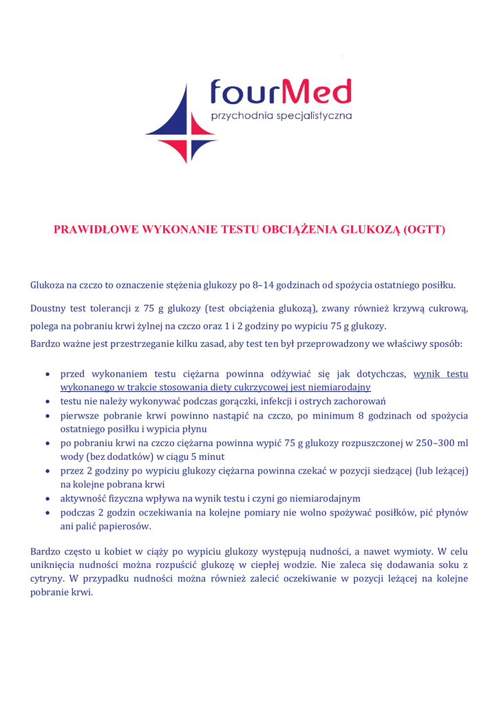 PRAWIDŁOWE WYKONANIE TESTU OBCIĄŻENIA GLUKOZĄ (OGTT) Glukoza na czczo to oznaczenie stężenia glukozy po 8–14 godzinach od spożycia ostatniego posiłku. Doustny test tolerancji z 75 g glukozy (test obciążenia glukozą), zwany również krzywą cukrową, polega na pobraniu krwi żylnej na czczo oraz 1 i 2 godziny po wypiciu 75 g glukozy. Bardzo ważne jest przestrzeganie kilku zasad, aby test ten był przeprowadzony we właściwy sposób: przed wykonaniem testu ciężarna powinna odżywiać się jak dotychczas, wynik testu wykonanego w trakcie stosowania diety cukrzycowej jest niemiarodajny testu nie należy wykonywać podczas gorączki, infekcji i ostrych zachorowań pierwsze pobranie krwi powinno nastąpić na czczo, po minimum 8 godzinach od spożycia ostatniego posiłku i wypicia płynu po pobraniu krwi na czczo ciężarna powinna wypić 75 g glukozy rozpuszczonej w 250–300 ml wody (bez dodatków) w ciągu 5 minut przez 2 godziny po wypiciu glukozy ciężarna powinna czekać w pozycji siedzącej (lub leżącej) na kolejne pobrana krwi aktywność fizyczna wpływa na wynik testu i czyni go niemiarodajnym podczas 2 godzin oczekiwania na kolejne pomiary nie wolno spożywać posiłków, pić płynów ani palić papierosów. Bardzo często u kobiet w ciąży po wypiciu glukozy występują nudności, a nawet wymioty. W celu uniknięcia nudności można rozpuścić glukozę w ciepłej wodzie. Nie zaleca się dodawania soku z cytryny. W przypadku nudności można również zalecić oczekiwanie w pozycji leżącej na kolejne pobranie krwi.