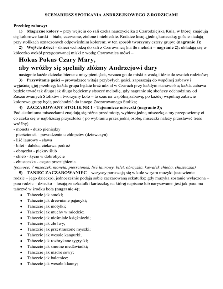 SCENARIUSZ SPOTKANIA ANDRZEJKOWEGO Z RODZICAMI Przebieg zabawy: 1) Magiczne kolory – przy wejściu do sali czeka nauczycielka z Czarodziejską Kulą, w której znajdują się kolorowe kartki – białe, czerwone, zielone i niebieskie. Rodzice losują jedną karteczkę; goście siadają przy stolikach oznaczonych odpowiednim kolorem; w ten sposób tworzymy cztery grupy; (nagranie 1); 2) Wejście dzieci – dzieci wchodzą do sali z Czarownicą (na tle melodii – nagranie 2); układają się w kółeczko wokół przygotowanej miski z wodą; Czarownica mówi – Hokus Pokus Czary Mary, aby wróżby się spełniły złóżmy Andrzejowi dary następnie każde dziecko bierze z misy pieniążek, wrzuca go do miski z wodą i idzie do swoich rodziców; 3) Przywitanie gości – prowadzące witają przybyłych gości, zapraszają do wspólnej zabawy i wyjaśniają jej przebieg; każda grupa będzie brać udział w Czarach przy każdym stanowisku; każda zabawa będzie trwać tak długo jak długo będziemy słyszeć melodię, gdy nagranie się skończy odchodzimy od Zaczarowanych Stolików i tworzymy koło – to czas na wspólną zabawę; po każdej wspólnej zabawie kolorowe grupy będą podchodzić do innego Zaczarowanego Stolika; 4) ZACZAROWANY STOLIK NR 1 - Tajemnicze miseczki (nagranie 3); Pod siedmioma miseczkami znajdują się różne przedmioty, wybierz jedną miseczkę a my przepowiemy ci co czeka cię w najbliższej przyszłości ( po wybraniu przez jedną osobę, miseczki należy przestawić treść wróżby) - moneta - dużo pieniędzy - pierścionek - powodzenie u chłopców (dziewczyn) - liść laurowy - sława - bilet - daleka, ciekawa podróż - obrączka - piękny ślub - chleb - życie w dobrobycie - chusteczka - częste przeziębienia. (pomoce: 7 miseczek, moneta, pierścionek, liść laurowy, bilet, obrączka, kawałek chleba, chusteczka) 5) TANIEC ZACZAROWANIEC – wszyscy poruszają się w kole w rytm muzyki (ustawienie – rodzic – jego dziecko), jednocześnie podają sobie zaczarowaną szkatułkę; gdy muzyka zostanie wyłączona – para rodzic – dziecko – losują ze szkatułki karteczkę, na której napisane lub narysowane jest jak para ma tańczyć w środku koła (nagranie 4); Tańczcie jak smoki; Tańczcie jak drewniane pajacyki; Tańczcie jak motylki; Tańczcie jak muchy w miodzie; Tańczcie jak nieśmiałe księżniczki; Tańczcie jak złe lwy; Tańczcie jak przestraszone myszki; Tańczcie jak wesołe kangurki; Tańczcie jak rozbrykane tygryski; Tańczcie jak smutne niedźwiadki; Tańczcie jak mądre sowy; Tańczcie jak baletnice; Tańczcie jak wesołe klauny; 6) ZACZAROWANY STOLIK NR 2 – Kości – (nagranie 5); Zamieszaj kostki w dłoni i wyrzuć na zaznaczone pole. Policz wszystkie wyrzucone oczka. A teraz odczytam twoje przeznaczenie: 3 - szczęście 4 - przykrości 5 - spełnienie marzeń 6 - coś zgubisz 7 - kłopoty w szkole 8 - coś wisi w powietrzu 9 - poznasz nowego przyjaciela 10 - będziesz mieć rodzeństwo 11 - złapiesz katar 12 - dobre wieści 13 - smutek 14 - możesz liczyć na pomoc 15 - potrzebujesz opieki 16 - podróż 17 - zmiana planów 18 - wielki sukces (pomoce: 3 kostki) 7) GAZETOWY WALC – każda para – rodzic – dziecko otrzymuje gazetę; ich zadaniem jest taniec w rytm muzyki, tak aby nie zejść z gazety; gdy muzyka zostanie przerwana, należy złożyć gazetę na pół; po włączeniu muzyki tańczymy dalej; gazetę składamy tak długo, aż zostanie kilka par, które zdołały utrzymać się na gazetach; (nagranie 6); 8) ZACZAROWANY STOLIK NR 3 – Koło przeznaczenia; (nagranie 7); na stoliku rozłożona jest plansza z narysowanymi symbolami; uczestnik kręci zaczarowaną butelką; pole, na którym się butelka zatrzyma oznacza przeznaczenie; interpretacja symboli: Sowa – będziesz mądrym człowiekiem, przed Tobą kariera naukowa; Walizka – wyjedziesz w podróż, czekają Cię wspaniałe przygody; Deser lodowy – czeka Cię słodka niespodzianka; Serce – czeka Cię miłe spotkanie; Koniczynka – będziesz szczęśliwy; Gwiazda – czeka Cię kariera aktorska lub piosenkarska; Skarbonka – będziesz bogatym biznesmenem; Czarodziejska różdżka – spełnią się Twoje marzenia; 8) TANIEC MIOTLARZ – (nagranie 8); wszyscy tańczą w parach po obwodzie koła; w środku tańczy Czarownica z miotłą; następnie podchodzi do wybranej osoby, przekazuje jej miotłę; druga osoba z pary jest teraz parą dla prowadzącej; osoba ze szczotką szuka dla siebie pary; 9) ZACZAROWANY STOLIK NR 4 – Kim będziesz w przyszłości? (nagranie 9); dzieci losują karteczkę z narysowaną postacią przedstawiającą jakiś zawód; rodzic ma za zadanie narysować swoje dziecko wykonujące ten zawód w przyszłości; 10) WĘDRUJĄCE NOGI – (nagranie 10); bardzo proszę, aby wszyscy zrobili w prawo zwrot; jedziemy w daleką podróż, na razie tylko w zabawie, ale ta wróżba pokaże nam, kto naprawdę pojedzie w daleką podróż; wszyscy uczestniczy ustawiają lewą nogę tak, aby dotykała buta sąsiada; kto stwierdzi, że nie ma już nikogo za plecami, idzie na początek, kierując swoją nogę w bucie do drzwi; ten, kogo but jako pierwszy przekroczy próg sali wyjedzie w daleką podróż; 11) ZAKOŃCZENIE – to była ostatnia wróżba, a teraz wszyscy zatańczymy Taniec Zaczarowaniec (nagranie 11);