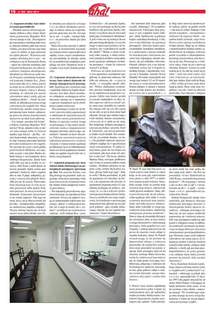 16 nr 208 - MAJ 2014 (A) Argument moralny: kara śmierci wyraża sprawiedliwość. Zbrodnia narusza równowagę pomiędzy dobrem a złem, śmierć zbrodniarza ją przywraca. Bogusław Wolniewicz ujmuje to tak: „Przestępstwo jest naruszeniem moralnego ładu świata. Jedynym dobrem, jakie kara ma na widoku, jest przywrócenie tego ładu – przez to właśnie, że jego naruszenie nie ujdzie płazem”. Wartością nadrzędną i absolutną jest w tym – odwołującym się do Immanuela Kanta – ujęciu nie człowiek rozumiany jako kategoria biologiczna, ale człowieczeństwo, kategoria aksjologiczna: zbrodniarz tę człowieczą cechę utracił. Powyższe rozróżnienie komentował ironicznie Umberto Eco: „Zastanawia mnie fakt, że ci, którzy gotowi są uznać go za człowieka jedynie w pewnym stopniu, walczą z aborcją, twierdząc, że człowiek jest zawsze człowiekiem, także i wtedy, gdy jest zalążkiem płodu”. – Godzi się nadmienić, że adresatką powyższej uwagi z pewnością nie mogłaby być Alicja Grześkowiak, autorka znanej pracy poświęconej karze śmierci: odmawiając prawa do aborcji, konsekwentnie sprzeciwia się także karze głównej. Czy istnieje „moralny ład świata”, o którym wspomina Bogusław Wolniewicz? Świat, zdaniem wielu, to ledwie ruina samego siebie, to świat po upadku; jego ład jest – jak Raj – stanem bezpowrotnie utraconym, a pyszna chęć restytucji pierwotnej harmonii prowadzi każdorazowo do tragedii. Nic pewniej nie czyni z ziemi piekła, pisał Friedrich Hölderlin, niż chęć, żeby uczynić z niej niebo. Bardzo dobitnie brzmią w tym kontekście słowa Andrzeja Grzegorczyka: „Kiedy Kain zabił Abla, tacy jak ty myśleli, że wystarczy zabić Kaina i nadal będzie na świecie porządek, będzie można spać spokojnie i budować statki z papieru albo ze stali. O głupi, zaślepieńcy, pyszałcy i nauczyciele głupich! Krew Abla jest nie do zmycia. Wprowadziliście instytucję kary za winy po to, żeby przywracać sobie spokój. Żeby mieć poczucie, że rzeczywistość jest doskonała. Tymczasem rzeczywistości nie można naprawić. Nikt tego nie może, ani ty, ani ja. Rzeczywistość już jest taka – nienaprawialna, niespełniona, niedorzeczna, niepełna, cierpiąca”. Nie jest, mówiąc inaczej, tak, że świat stanowi zrazu jakieś idealne zero (0); że zbrodnia jest odejściem od niego (-1); i że zabicie zbrodniarza spowoduje, że minusy zniosą się wzajemnie, powróci pierwotne zero (0). Ani tego życia, ani – w ogóle – tamtego ładu, n i c nie przywróci: będzie już tylko gorzej (-2). Maria Ossowska zauważa w jakimś miejscu, że konsekwentne trzymanie się symetryczności (sprawiedliwości) odpłaty (suum cuique) niejednokrotnie prowadziłoby do absurdu, trzeba by na przykład karać podpalacza podpalając mu dom. Niepokoić może w związku z tym myśl o karaniu gwałciciela. (B) Argument ekonomiczno-estetyczny: kara śmierci skutecznie eliminuje niepoprawnych przestępców. Egzekucja jest czynnością tanią i radykalnie efektywną (aspekt ekonomiczny). Jest także aktem stosunkowo schludnym, uwalniającym od konieczności nurzania się w nieprostym i zapewne niepięknym życiu zbrodniarza (aspekt estetyczny). Zbyt porażająca wydaje mi się łatwość i prostota takiej argumentacji w odniesieniu do niszczenia życia, by warto było szerzej ją komentować. Można co najwyżej zwrócić uwagę na powracajacy w niej motyw pychy: człowiek orzeka o niepoprawności drugiego człowieka, zatem o jego „naturalnym” skazaniu na bycie złoczyńcą. Takiemu orzecznictwu przeczą najbardziej podstawowe wrażenia związane z wykonywaniem egzekucji po kilkunastu, bywa że kilkudziesięciu latach od chwili popełnienia zbrodni: zabija się zupełnie innych ludzi niż ci, którzy się jej dopuścili. (C) Argument pragmatyczny: kara śmierci działa odstraszająco na potencjalnych przestępców (prewencja ogó lna). Jak zauważa Seneka, sam Bóg domaga się grzmotów, które zagrażając nielicznym przerażają wielu (paucorum periculo et multorum metu); tak właśnie winien postępować rozumny prawodawca. – Ten najczęściej przywoływany argument doczekuje się największej ilości zastrzeżeń. Zwraca się najpierw uwagę na instrumentalne traktowanie skazanego, „aktora” w edukacyjnym teatrze: nie o niego tu chodzi, ale o „widzów”, na których ma wychowawczo wpłynąć. „Jeśli zabijam Iksa – pisze Umberto Eco – aby przestrzec Igreka, to czyż nie posługuję się Iksem jako środkiem, aby przestrzec Igreka i aby bronić wszystkich innych obywateli przed jego ewentualnymi zbrodniami? A jeśli wolno mi się posłużyć Iksem jako przestrogą dla Igreka, to czyż nie mogę w takim razie posłużyć się Samuelem, aby wyprodukować mydło dla Adolfa?”. Można w istocie wyobrazić sobie sytuację, w której umowność teatralnych środków oznaczałaby pozór egzekucji i późniejsze uwolnienie przestępcy – ważne, by widzowie wierzyli w tę fikcję. Podważa się także podstawowe w tym argumencie uzasadnienie kary głównej: że skutecznie odstrasza. Nie tylko nie odstrasza, ale – o czym za chwilę – w szczególny sposób „skłania”. Wbrew złudzeniom zwolenników prawnej omnipotencji, życia nie da się zadekretować przepisami i rygorami. Gdyby kara śmierci groziła za rzucanie niedopałków na ulicy, ludzie zapewne i tak by je rzucali i tylko samo życie straciłoby na wartości. Nie dlatego robi się coś, lub czegoś się nie robi, że jest to dozwolone bądź zakazane; decyzje tego rodzaju mają o wiele bardziej złożone uzasadnienie, a bywa też, że w ogóle go nie mają. Kto podejmuje działania przestępcze, zauważa psycholog i prawnik, Józef K. Gierowski, „nie zawsze przewiduje skutki swych działań. Nie zastanawia się, czy zostanie ukarany, czy nie. (...) Na przykład większość sprawców zabójstw znajduje się w specyficznym stanie emocjonalnym. To jakby rod