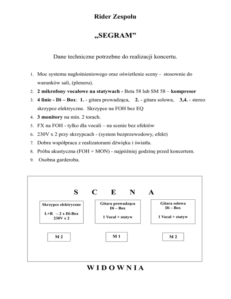 Rider Zespołu „SEGRAM” Dane techniczne potrzebne do realizacji koncertu. 1. Moc systemu nagłośnieniowego oraz oświetlenie sceny - stosownie do warunków sali, (pleneru). 2. 2 mikrofony vocalowe na statywach - Beta 58 lub SM 58 – kompresor 3. 4 linie - Di – Box: 1. - gitara prowadząca, 2. - gitara solowa, 3,4. - stereo skrzypce elektryczne. Skrzypce na FOH bez EQ 4. 3 monitory na min. 2 torach. 5. FX na FOH - tylko dla vocali – na scenie bez efektów 6. 230V x 2 przy skrzypcach - (system bezprzewodowy, efekt) 7. Dobra współpraca z realizatorami dźwięku i światła. 8. Próba akustyczna (FOH + MON) - najpóźniej godzinę przed koncertem. 9. Osobna garderoba. S C E N A Skrzypce elektryczne Gitara prowadząca Di – Box Gitara solowa Di – Box L+R – 2 x Di-Box 230V x 2 1 Vocal + statyw 1 Vocal + statyw M1 M2 M2 WIDOWNIA