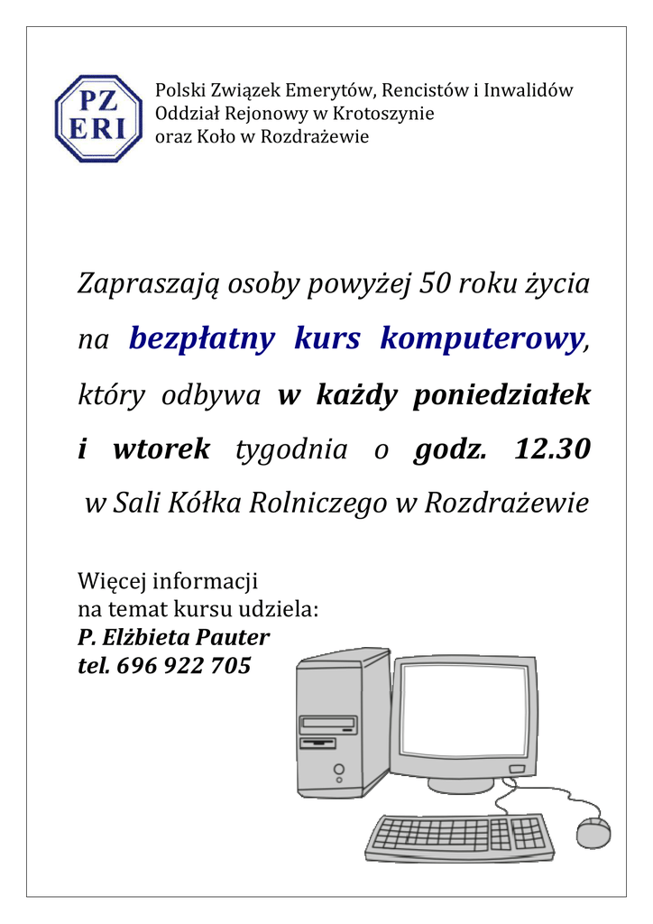 Polski Związek Emerytów, Rencistów i Inwalidów Oddział Rejonowy w Krotoszynie oraz Koło w Rozdrażewie Zapraszają osoby powyżej 50 roku życia na bezpłatny kurs komputerowy, który odbywa w każdy poniedziałek i wtorek tygodnia o godz. 12.30 w Sali Kółka Rolniczego w Rozdrażewie Więcej informacji na temat kursu udziela: P. Elżbieta Pauter tel. 696 922 705