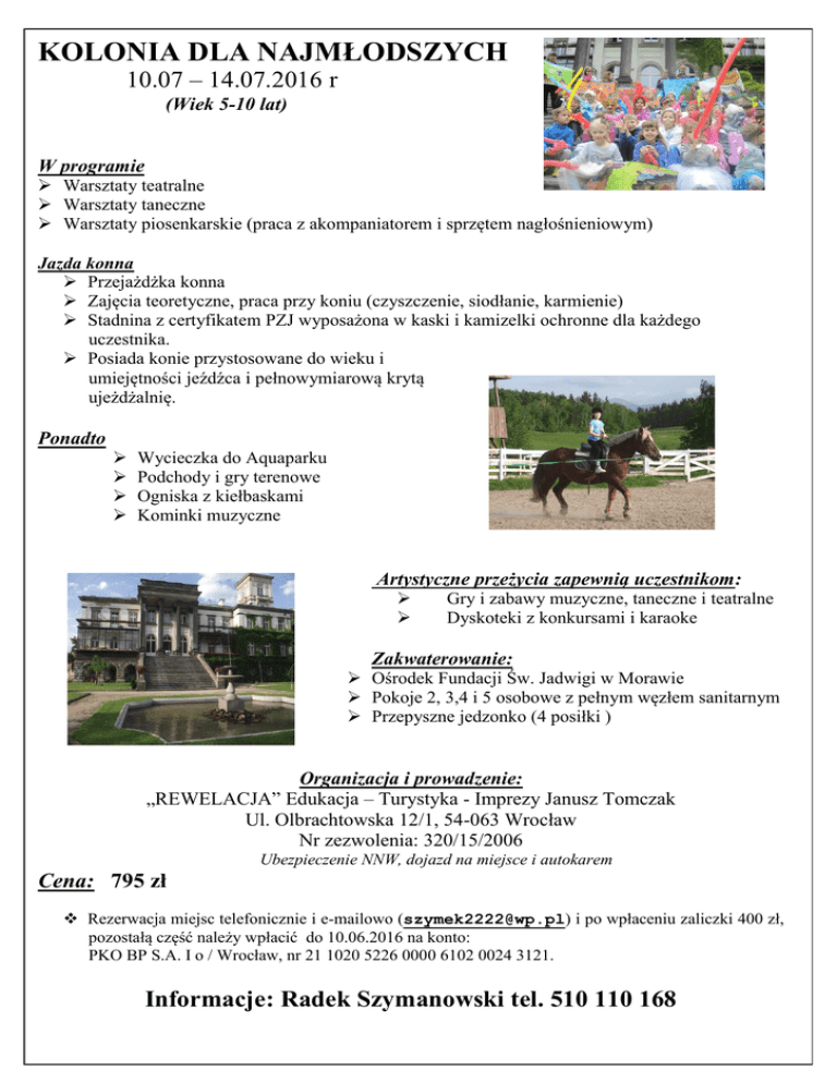 KOLONIA DLA NAJMŁODSZYCH 10.07 – 14.07.2016 r (Wiek 5-10 lat) W programie Warsztaty teatralne Warsztaty taneczne Warsztaty piosenkarskie (praca z akompaniatorem i sprzętem nagłośnieniowym) Jazda konna Przejażdżka konna Zajęcia teoretyczne, praca przy koniu (czyszczenie, siodłanie, karmienie) Stadnina z certyfikatem PZJ wyposażona w kaski i kamizelki ochronne dla każdego uczestnika. Posiada konie przystosowane do wieku i umiejętności jeźdźca i pełnowymiarową krytą ujeżdżalnię. Ponadto Wycieczka do Aquaparku Podchody i gry terenowe Ogniska z kiełbaskami Kominki muzyczne dokumencie. Użyj karty Artystyczne przeżycia zapewnią uczestnikom: Narzędzia do rysowania, Gry i zabawy muzyczne, taneczne i teatralne aby zzmienić formatowanie Dyskoteki konkursami i karaoke pola tekstowego cytatu.] Zakwaterowanie: Ośrodek Fundacji Św. Jadwigi w Morawie Pokoje 2, 3,4 i 5 osobowe z pełnym węzłem sanitarnym Przepyszne jedzonko (4 posiłki ) Organizacja i prowadzenie: „REWELACJA” Edukacja – Turystyka - Imprezy Janusz Tomczak Ul. Olbrachtowska 12/1, 54-063 Wrocław Nr zezwolenia: 320/15/2006 Ubezpieczenie NNW, dojazd na miejsce i autokarem Cena: 795 zł Rezerwacja miejsc telefonicznie i e-mailowo ([email protected]) i po wpłaceniu zaliczki 400 zł, pozostałą część należy wpłacić do 10.06.2016 na konto: PKO BP S.A. I o / Wrocław, nr 21 1020 5226 0000 6102 0024 3121. Informacje: Radek Szymanowski tel. 510 110 168
