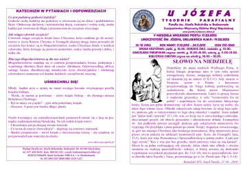 KATECHIZM W PYTANIACH I ODPOWIEDZIACH Co jest podstawą godności ludzkiej? Godność osoby ludzkiej ma podstawę w stworzeniu jej na obraz i podobieństwo Boże. Obdarzona duchową i nieśmiertelną duszą, rozumem i wolną wolą, osoba ludzka jest zwrócona do Boga i przeznaczona do szczęścia wiecznego. U JÓZEFA TYGODNIK PARAFIALNY Parafia św. Józefa Robotnika w Bodzanowie Duszpasterstwo Misjonarzy Oblatów Maryi Niepokalanej www.parafia.bodzanow.oblaci.pl Jak osiąga człowiek szczęście? Człowiek osiąga szczęście dzięki łasce Chrystusa, która uzdalnia go do uczestnictwa w życiu Bożym. Chrystus w Ewangelii ukazuje drogę, która prowadzi do szczęścia bez końca: są to błogosławieństwa. Łaska Chrystusa działa w każdym człowieku, który kierując się prawym sumieniem, szuka i kocha prawdę i dobro, i unika zła. Dlaczego błogosławieństwa są dla nas ważne? Błogosławieństwa znajdują się w centrum przepowiadania Jezusa, podejmują i wypełniają obietnice Boże dane od czasów Abrahama. Odzwierciedlają oblicze samego Jezusa, charakteryzują autentyczne życie chrześcijańskie i odsłaniają człowiekowi ostateczny cel działań ludzkich: szczęśliwość wieczną. UŚMIECHNIJ SIĘ! Młody kapłan pyta o opinię na temat swojego kazania wizytującego parafię księdza biskupa. – Myślę, że można je porównać – mówi ksiądz biskup – do słynnego miecza Bolesława Chrobrego. – Był to miecz zwycięski? – pyta mile połechtany ksiądz. – Owszem. A poza tym bardzo długi i płaski. Nieźle trzymający się osiemdziesięciolatek postanowił ożenić się z łasą na pieniądze siedemnastoletnią blondynką. Na ich widok ksiądz mówi: – Chrzcielnica jest po drugiej stronie kościoła. – Co tu ma do rzeczy chrzcielnica? – dopytuje się czerstwy staruszek. – Bardzo przepraszam – mówi ksiądz z niewzruszoną twarzą – ale uznałem, że przyprowadził pan wnuczkę do chrztu. www.diecezja.opole.pl Wydaje Parafia św. Józefa Robotnika, Bodzanów 66, 48-340 Głuchołazy, tel. 077 439-56-65, kom. 600 911 651, e-mail: [email protected]. KONTO PARAFII: Bank Zachodni WBK S.A. 1 w Głuchołazach. Nr 58 1090 2167 0000 0001 0124 3127. V NIEDZIELA WIELKIEGO POSTU: 17.03.2013 UROCZYSTOŚĆ ŚW. JÓZEFA, OBLUBIEŃCA N.M.P.: 19.03.2013 Nr 10 (496) ROK WIARY: 11.10.2012 – 24.11.2013 ISSN 1731-5565 DROGA KRZYŻOWA: piątki, g. 16.30. GORZKIE ŻALE: niedziele, g. 10.30. KANCELARIA PARAFIALNA czynna: wtorki, g. 15.00–16.00; soboty, g. 11.00–13.00. BIBLIOTEKA CARITAS czynna we wtorki g. 16.00 – 18.00. SŁOWO NA NIEDZIELĘ Dotarliśmy do piątej niedzieli Wielkiego Postu, w której liturgia proponuje nam w tym roku epizod ewangeliczny Jezusa, ratującego kobietę cudzołożną od skazania jej na śmierć (J 8,1-11). Gdy naucza w Świątyni, uczeni w Piśmie i faryzeusze przyprowadzają do Niego kobietę pochwyconą na cudzołóstwie, dla której prawo Mojżeszowe przewidywało ukamienowanie. Ludzi ci proszą Jezusa o osądzenie grzesznicy w celu "wystawienia Go na próbę" i popchnięcia Go do uczynienia fałszywego kroku. Scena jest pełna dramatyzmu: od słów Jezusa zależy życie tej osoby, ale także Jego własne życie. Obłudni oskarżyciele udają bowiem, że ufają Jego sądowi, podczas gdy w rzeczywistości to Jego chcą oskarżyć i osądzić. Jezus jednak jest "pełen łaski i prawdy" (J 1,14): wie, co kryje się w sercu każdego człowieka, chce potępić grzech, ale zbawić grzesznika i zdemaskować obłudę. Ewangelista św. Jan podkreśla pewien szczegół: podczas gdy oskarżyciele natarczywie Go wypytują, On przyklęka i pisze palcem po ziemi. Święty Augustyn zwraca uwagę, że gest ten ukazuje Chrystusa jako boskiego prawodawcę: Bóg mianowicie pisze prawo swym palcem na tablicach kamiennych (por. Kom. do Ewangelii Jana, 33,5). Jezus jest więc Prawodawcą i Sprawiedliwością w jednej osobie. A jaki jest Jego wyrok? "Kto z was jest bez grzechu, niech pierwszy rzuci na nią kamień". Słowa te są pełne rozbrajającej siły prawdy, która obala mur obłudy i otwiera sumienia na większą sprawiedliwość: miłości, w której zawiera się doskonałe wypełnienie wszystkich przykazań (por. Rz 13,8-10). Jest to sprawiedliwość, która zbawiła także Szawła z Tarsu, przemieniając go w św. Pawła (por. Flp 3, 8-14). Benedykt XVI, Anioł Pański, 21.10…2010. Modlitwa do św. Józefa bł. Jana XXIII O Święty Józefie, stróżu Jezusa, małżonku Przeczystej Maryi, który przeszedłeś przez życie doskonale spełniając swój obowiązek, utrzymując pracą rąk Świętą Rodzinę z Nazaretu, wspieraj przychylnie tych, którzy - ufni - do Ciebie się zwracają! Ty znasz ich dążenia, ich braki, ich nadzieje, oni do Ciebie się uciekają, ponieważ wiedzą, że w Tobie znajdą Tego, kto ich zrozumie i obroni. Również i Ty zaznawałeś przeciwności, trudu, zmęczenia; ale właśnie przez te starania o zapewnienie bytu materialnego, Twój duch osiągnął najgłębszy pokój, cieszył się niewypowiedzianą radością z obcowania ze Synem Bożym i z Maryją, Jego Najmilszą Matką, Tobie powierzonymi. Niech zrozumieją ci, których otaczasz swoją opieką, że nie są samotni w swej pracy, niech umieją odkrywać obok siebie Jezusa, przyjmować Go z wdzięcznością i strzec Go wiernie, tak jak Ty to czyniłeś. I wyjednaj, by w każdej rodzinie, w każdej fabryce, w każdym warsztacie, gdzie pracuje chrześcijanin wszystko było uświęcone miłością, cierpliwością, sprawiedliwością, troską o dobro - ażeby łaski niebios spływały obficie. Amen. OGŁOSZENIA DUSZPASTERSKIE V NIEDZIELA WIELKIEGO POSTU: 17.03.2013 1. 2. 3. 4. 5. 6. 7. 8. Bóg zapłać! Rodzinom, które przygotowały kościół do niedzieli. W przyszłą sobotę o godz. 9.00 bardzo proszę następujące rodziny: Grabowiecki, Szewczyk Jan, Szewczyk Marian, Kuśmirek, Nowak, Kościelniak, Pachołek Maria, Sadlak Dorota. O przygotowanie Ciemnicy,