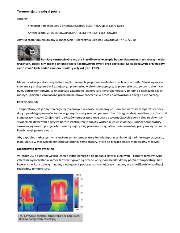 Termowizja prawdę ci powie Autorzy: Krzysztof Patschek, ZPBE ENERGOPOMIAR-ELEKTRYKA Sp. z o.o. Gliwice Antoni Szopa, ZPBE ENERGOPOMIAR-ELEKTRYKA Sp. z o.o. Gliwice Artykuł został opublikowany w magazynie "Energetyka Cieplna i Zawodowa" nr 11/2010 Pomiary termowizyjne można klasyfikowad w grupie badao diagnostycznych maszyn elektrycznych. Dzięki nim można uniknąd wielu kosztownych awarii oraz postojów. Kilka ciekawych przykładów zastosowao tych badao zawiera poniższy artykuł (red. ECiZ). Maszyny wirujące stanowią jedną z najliczniejszych grup maszyn elektrycznych w przemyśle. Silniki wykorzystywane są praktycznie w każdej gałęzi przemysłu, w elektroenergetyce, w przemyśle spożywczym, chemicznym, petrochemicznym. W energetyce zawodowej generatory i hydrogeneratory to jedne z najważniejszych maszyn, których niezakłócona praca ma kluczowe znaczenie w procesie wytwarzania energii elektrycznej. Istotny czynnik Temperatura jest jedną z najczęściej mierzonych wielkości w przemyśle. Pomiary wartości temperatury decydują o przebiegu procesów technologicznych, służą kontroli parametrów różnego rodzaju mediów oraz kontroli stanu pracy maszyn. Znajomośd rozkładów temperatury oraz analiza występujących zjawisk cieplnych w maszynach elektrycznych odgrywa bardzo istotną rolę z punktu widzenia ich eksploatacji. Zmiany temperatury, zarówno jej wzrost, jak i jej obniżenie są najczęściej pierwszym sygnałem o nienormalnej pracy maszyny i możliwości wystąpienia awarii. Aby zapobiec niekorzystnym skutkom zmian temperatury lub niedopuszczeniu do jej nadmiernego przyrostu, instaluje się w maszynach kontaktowe czujniki temperatury, które na bieżąco śledzą stan cieplny maszyny. Diagnostyka termowizyjna W latach 70. do użytku weszło jeszcze jedno narzędzie do badania zjawisk cieplnych – kamera termowizyjna. Zaletami wykorzystania kamer termowizyjnych są przede wszystkim bezdotykowy pomiar temperatury, bez ingerencji w konstrukcję maszyny z odległości, podczas normalnej pracy maszyny oraz możliwośd wizualizacji rozkładów temperatury. Diagnostyka termowizyjna maszyn, podczas ich normalnej eksploatacji, obejmuje obserwację rozkładów temperatury oraz pomiar wartości temperatury na widocznych częściach maszyny. Korpus silnika Monitorowanie temperatury korpusu silnika ma na celu zapobieganie wystąpieniu wysokiej temperatury i przegrzaniu się uzwojenia stojana podczas jego pracy. Przekroczenie temperatur dopuszczalnych, wynikających z klasy izolacji uzwojenia, może skrócid czas eksploatacji maszyny. Generatory, hydrogeneratory czy silniki dużej mocy, o strategicznym znaczeniu z punktu widzenia ich pracy, zwykle wyposażone są w czujniki temperatury, które na bieżąco monitorują stan cieplny maszyny. Dla tych maszyn technika termowizyjna jest badaniem uzupełniającym mogącym pełnid również funkcję kontrolną zainstalowanych czujników. Dla pozostałej grupy maszyn badanie termowizyjne może stanowid jedyne źródło informacji o stanie ich pracy. Ocena stanu technicznego tych maszyn w dużej mierze zależy od regularności przeprowadzania pomiarów, zbierania danych przez dłuższy czas i ciągłego porównywania otrzymanych wyników z warunkami pracy badanych urządzeo (czas pracy maszyny i wielkośd obciążenia). Łatwiej jest, gdy przedmiotem badania są co najmniej dwa identyczne urządzenia pracujące w tych samych warunkach otoczenia i obciążenia. Możliwośd porównania rozkładów temperatury oraz występujących na nich temperatur pozwala natychmiast zlokalizowad prawdopodobne miejsce przyszłej awarii *Fot. 4 i 5+. Łożyska Łożyska to drugi ważny element maszyny wirującej. Zadaniem łożyska jest podpieranie i ustalanie położenia wirnika w celu utrzymania równomiernej szczeliny powietrznej pomiędzy wirnikiem a stojanem maszyny. Narastające uszkodzenie łożyska powoduje zwiększenie poziomu drgao, poziomu hałasu oraz wzrost temperatury *Fot. 6+. Jeżeli na silniku nie są prowadzone inne działania diagnostyczne a jedynie regularny pomiar termowizyjny, który jest metodą szybką, nieinwazyjną, wykonywaną w trakcie normalnej pracy silnika, pozwoli to odpowiednio wcześnie wykryd narastającą temperaturę łożyska. Sprawnośd łożyska, szczególnie generatorów dużej mocy, zależy również od prawidłowego działania układów chłodzących i olejowych. Badaniem termowizyjnym można sprawdzid drożnośd tych układów oraz temperaturę czynnika [Fot. 7]. Zastosowanie w fazie produkcji Największe zastosowanie badao termowizyjnych w diagnostyce technicznej generatorów, hydrogeneratorów i silników znalazło w fazie ich produkcji, przed włożeniem uzwojeo do rowków, po uzwojeniu stojana oraz po kilkunastu latach pracy w czasie remontu maszyny przy wyjętym wirniku. Badanie termowizyjne polega na pomiarze rozkładu temperatury na powierzchni żelaza czynnego stojana podczas próby nagrzewania przy wymuszonym strumieniu magnetycznym w rdzeniu, wywołanym przepływem prądu w nawiniętej pętli. Celem próby nagrzewania rdzenia jest ocena pakietu żelaza stojana przez wykrycie miejsc uszkodzeo, (zward poszczególnych pakietów rdzenia) które mogą powodowad niedopuszczalne wysokie, lokalne, przegrzanie blach. Lokalnie grzejący się pakiet w strefie żłobkowej powoduje obniżenie czasu życia układu izolacyjnego uzwojenia generatora czy silnika. Era „przedtermowizyjna”... Poniżej fragmenty „Ramowej Instrukcji Eksploatacji Prądnic Synchronicznych” Instytut Energetyki Ośrodek Normalizacji, Warszawa 1991, opisujące sposób wykonania próby i pomiaru temperatur blach rdzenia przed wprowadzeniem technik termowizyjnych. Przed rozpoczęciem próby trzeba zmierzyd początkową temperaturę rdzenia. W miejscach tych umieszcza się termopary lub termometry alkoholowe /co najmniej 5 w miejscach najzimniejszych i co najmniej 10 w miejscach najcieplejszych/…. Następnie /to/, a następnie wł