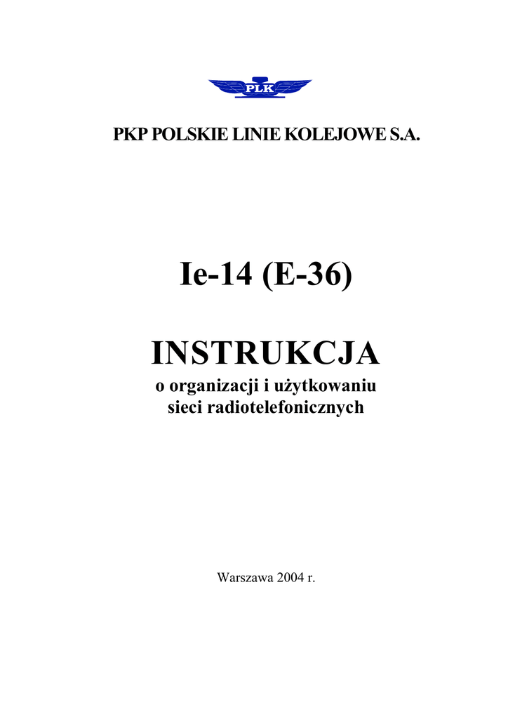 PKP POLSKIE LINIE KOLEJOWE S.A. Ie-14 (E-36) INSTRUKCJA o organizacji i użytkowaniu sieci radiotelefonicznych Warszawa 2004 r. Miejsce opracowania: PKP Polskie Linie Kolejowe S.A. Biuro Automatyki i Telekomunikacji, ul. Targowa 74, 03-734 Warszawa tel. (+48 22) 51 32 053, fax (+48 22) 51 33 369 www.plk-sa.pl, e-mail: [email protected] Copyright © by 2004 PKP Polskie Linie Kolejowe S.A. WSZYSTKIE PRAWA ZASTRZEŻONE Jakikolwiek przedruk, także częściowy, jest niedozwolony 2 SPIS TREŚCI ROZDZIAŁ 1 POSTANOWIENIA OGÓLNE ......................................................................................................................4 §1 Cel instrukcji .............................................................................................................................................................4 § 2 Podstawowe pojęcia i określenia ...........................................................................................................................4 § 3 Zakres instrukcji ......................................................................................................................................................6 § 4 Podstawowe wymagania organizacyjno – eksploatacyjne dla sieci radiotelefonicznych.................................6 § 5 Podział sieci radiotelefonicznych...........................................................................................................................7 § 6 Zasady pracy w sieciach radiotelefonicznych ......................................................................................................7 § 7 Obowiązki i odpowiedzialność pracowników obsługi ..........................................................................................9 § 8 Obowiązki pracowników nadzoru i kontroli ........................................................................................................10 ROZDZIAŁ 2 RADIOTELEFONICZNE SIECI STACYJNE ..............................................................................................11 § 9 Sieć manewrowa....................................................................................................................................................11 § 10 Sieć zakładowa ....................................................................................................................................................12 ROZDZIAŁ 3 RADIOTELEFONICZNE SIECI LINIOWE..................................................................................................13 § 11 Sieć pociągowa....................................................................................................................................................13 § 12 Sieć ratunkowa ....................................................................................................................................................14 § 13 Sieć drogowa i utrzymania..................................................................................................................................15 § 14 Sieć dyspozytora zasilania elektroenergetycznego .........................................................................................18 § 15 Sieć Straży Ochrony Kolei ..................................................................................................................................19 ROZDZIAŁ 4 ZARZĄDZANIE SPRZĘTEM RADIOTELEFONICZNYM...........................................................................20 § 16 Ewidencja urządzeń radiotelefonicznych ..........................................................................................................20 § 17 Rezerwa eksploatacyjna urządzeń radiotelefonicznych...................................................................................20 ROZDZIAŁ 5 POSTANOWIENIA KOŃCOWE.................................................................................................................21 § 18 Sprawdzanie stanu urządzeń radiotelefonicznych ...........................................................................................21 § 19 Wykonywanie instalacji dla urządzeń radiotelefonicznych w budynkach ......................................................21 § 20 Wykonywanie instalacji radiotelefonicznych w pojazdach ..............................................................................22 § 21 Postępowanie w przypadku stwierdzenia usterek w pracy urządzeń radiotelefonicznych...........................22 § 22 Dokumenty niezbędne do eksploatacji urządzeń radiotelefonicznych ...........................................................22 ZAŁĄCZNIKI .....................................................................................................................................................................24 WYKAZ ZMIAN .................................................................................................................................................................34 3 ROZDZIAŁ 1 POSTANOWIENIA OGÓLNE §1 Cel instrukcji 1. Instrukcja określa zasady organizacji i eksploatacji sieci radiotelefonicznych służących do zapewnienia sprawności i bezpieczeństwa ruchu kolejowego, utrzymania infrastruktury kolejowej oraz ochrony mienia kolejowego, przewożonych osób i towarów w PKP Polskie Linie Kolejowe S.A., dalej zwaną zarządcą infrastruktury. 2. Do sieci, o których mowa w ust.1, należą: radiotelefoniczna sieć pociągowa, ratunkowa, drogowa i utrzymania, dyspozytora zasilania elektroenergetycznego, manewrowa, zakładowa oraz Straży Ochrony Kolei. 3. Znajomość niniejszej instrukcji obowiązuje: 1) pracowników zatrudnionych na stanowiskach pracy, na których zostały zainstalowane urządzenia stacjonarne i przewoźne pracujące w sieciach radiotelefonicznych - w zakresie dotyczącym stanowiska pracy, 2) pracowników, którym przydzielono, na czas wykonywania obowiązków zawodowych, radiotelefony przenośne pracujące w sieciach radiotelefonicznych 