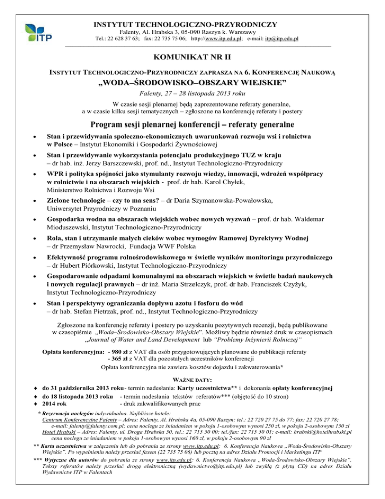 INSTYTUT TECHNOLOGICZNO-PRZYRODNICZY Falenty, Al. Hrabska 3, 05-090 Raszyn k. Warszawy Tel.: 22 628 37 63; fax: 22 735 75 06; http://www.itp.edu.pl; e-mail: [email protected] _______________________________________________________________________________________________________ KOMUNIKAT NR II INSTYTUT TECHNOLOGICZNO-PRZYRODNICZY ZAPRASZA NA 6. KONFERENCJĘ NAUKOWĄ „WODAŚRODOWISKOOBSZARY WIEJSKIE” Falenty, 27 – 28 listopada 2013 roku W czasie sesji plenarnej będą zaprezentowane referaty generalne, a w czasie kilku sesji tematycznych – zgłoszone na konferencję referaty i postery Program sesji plenarnej konferencji – referaty generalne Stan i przewidywania społeczno-ekonomicznych uwarunkowań rozwoju wsi i rolnictwa w Polsce – Instytut Ekonomiki i Gospodarki Żywnościowej Stan i przewidywanie wykorzystania potencjału produkcyjnego TUZ w kraju – dr hab. inż. Jerzy Barszczewski, prof. nd., Instytut Technologiczno-Przyrodniczy WPR i polityka spójności jako stymulanty rozwoju wiedzy, innowacji, wdrożeń współpracy w rolnictwie i na obszarach wiejskich - prof. dr hab. Karol Chyłek, Ministerstwo Rolnictwa i Rozwoju Wsi Zielone technologie – czy to ma sens? – dr Daria Szymanowska-Powałowska, Uniwersytet Przyrodniczy w Poznaniu Gospodarka wodna na obszarach wiejskich wobec nowych wyzwań – prof. dr hab. Waldemar Mioduszewski, Instytut Technologiczno-Przyrodniczy Rola, stan i utrzymanie małych cieków wobec wymogów Ramowej Dyrektywy Wodnej – dr Przemysław Nawrocki, Fundacja WWF Polska Efektywność programu rolnośrodowiskowego w świetle wyników monitoringu przyrodniczego – dr Hubert Piórkowski, Instytut Technologiczno-Przyrodniczy Gospodarowanie odpadami komunalnymi na obszarach wiejskich w świetle badań naukowych i nowych regulacji prawnych – dr inż. Maria Strzelczyk, prof. dr hab. Franciszek Czyżyk, Instytut Technologiczno-Przyrodniczy Stan i perspektywy ograniczania dopływu azotu i fosforu do wód – dr hab. Stefan Pietrzak, prof. nd., Instytut Technologiczno-Przyrodniczy Zgłoszone na konferencję referaty i postery po uzyskaniu pozytywnych recenzji, będą publikowane w czasopiśmie „Woda–Środowisko-Obszary Wiejskie”. Możliwy będzie również druk w czasopismach „Journal of Water and Land Development lub “Problemy Inżynierii Rolniczej” Opłata konferencyjna: - 980 zł z VAT dla osób przygotowujących planowane do publikacji referaty - 365 zł z VAT dla pozostałych uczestników konferencji Opłata konferencyjna nie zawiera kosztów dojazdu i zakwaterowania* WAŻNE DATY: do 31 października 2013 roku - termin nadesłania: Karty uczestnictwa** i dokonania opłaty konferencyjnej do 18 listopada 2013 roku - termin nadesłania tekstów referatów*** (objętość do 10 stron) 2014 rok - druk zakwalifikowanych prac * Rezerwacja noclegów indywidualna. Najbliższe hotele: Centrum Konferencyjne Falenty – Adres: Falenty, Al. Hrabska 4a, 05-090 Raszyn; tel.: 22 720 27 75 do 77; fax: 22 720 27 78; e-mail: [email protected]; cena noclegu ze śniadaniem w pokoju 1-osobowym wynosi 250 zł, w pokoju 2-osobowym 150 zł Hotel Hrabski – Adres: Falenty, ul. Droga Hrabska 50, tel.: 22 715 50 00; tel./fax: 22 715 50 01; e-mail: [email protected] cena noclegu ze śniadaniem w pokoju 1-osobowym wynosi 160 zł, w pokoju 2-osobowym 90 zł ** Karta uczestnictwa w załączeniu lub do pobrania ze strony www.itp.edu.pl: 6. Konferencja Naukowa „Woda-Środowisko-Obszary Wiejskie”. Po wypełnieniu należy przesłać faxem (22 735 75 06) lub pocztą na adres Działu Promocji i Marketingu ITP *** Wytyczne dla autorów do pobrania ze strony www.itp.edu.pl: 6. Konferencja Naukowa „Woda-Środowisko-Obszary Wiejskie”. Teksty referatów należy przesłać drogą elektroniczną ([email protected]) lub zwykłą (z płytą CD) na adres Działu Wydawnictw ITP w Falentach Konferencja pod patronatem czasopisma „Woda–Środowisko–Obszary Wiejskie” KOMITET HONOROWY KONFERENCJI (Rada Naukowa czasopisma) Prof. dr hab. Leszek Łabędzki (przewodniczący) ITP, K-POB w Bydgoszczy (Polska) Dr hab. Eugeniusz Karol Chyłek MRiRW, Warszawa (Polska) Prof. dr hab. Andrzej Kędziora ZBŚRiL PAN i UP, Poznań (Polska) Prof. dr hab. Stanisława Okularczyk MRiRW, Warszawa (Polska) Prof dr hab. Stanisław Twardy ITP, MOB w Krakowie (Polska) Prof. dr hab. Maciej Zalewski UŁ w Łodzi (Polska) Prof. Dr. Okke Batelaan Vrije Universiteit Brussel (Belgia) Prof. Kireyheva Liudmila Vladimirovna All-Russian Research Institute for Hydraulic Engineering and Land Reclamation, Moskwa (Rosja) Dr. hab. Jurík Lubos PhD. Slovak Agricultural University in Nitra (Slovakia) Prof. Viktor Moshynsky Ukrainian State University of Water Management & Natural Resources Use (NUWM), Rivne (Ukraina) Prof. Dr. Oene Oenema Wageningen University and Research Center, Alterra (Holandia) Prof. Dr. Giuseppe Parente University of Udine (Włochy) Prof. Dr. Alain Peeters RHEA - Natural Resources, Human Environment and Agronomy (Gentinnes, Belgia) KOMITET NAUKOWY KONFERENCJI (Komitet Redakcyjny czasopisma) Prof. dr hab. Edmund Kaca redaktor naczelny Prof. dr hab. Szczepan L. Dąbkowski zastępca redaktora naczelnego kształtowanie środowiska, inżynieria wodna, budownictwo wodno-melioracyjne, hydrologia Prof. dr hab. Magdalena Borys inżynieria wodna, budownictwo wodno-melioracyjne, geotechnika Prof. dr hab. Wiesław Dembek ochrona środowiska, ochrona przyrody Dr inż. Halina Jankowska-Huflejt sekretarz łąkarstwo, agronomia Prof. dr hab. Stanisław Łojewski ekonomia zasobów Prof. dr hab. Waldemar Mioduszewski kształtowanie środowiska, inżynieria wodno-melioracyjna, gospodarka wodna Prof. dr hab. Janusz Ostrowski gleboznawstwo melioracyjne, kartografia Prof. dr hab. Stefan Russel biologia środowiska, sanitacja i higienizacja terenów wiejskich, bioremediacja gleby Prof. dr hab. Andrzej Sapek chemia środowiska i chemia rolna Dr hab. Zbigniew Wasilewski łąkarstwo i łąkoznawstwo Sekretariat Ko