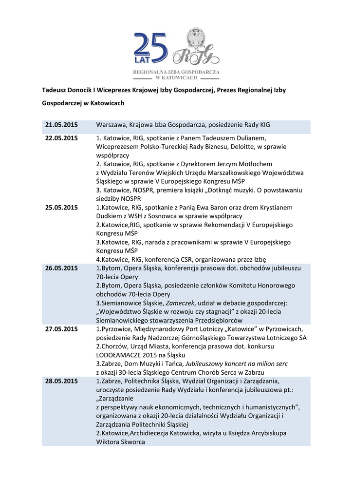 Tadeusz Donocik I Wiceprezes Krajowej Izby Gospodarczej, Prezes Regionalnej Izby Gospodarczej w Katowicach 21.05.2015 Warszawa, Krajowa Izba Gospodarcza, posiedzenie Rady KIG 22.05.2015 1. Katowice, RIG, spotkanie z Panem Tadeuszem Dulianem, Wiceprezesem Polsko-Tureckiej Rady Biznesu, Deloitte, w sprawie współpracy 2. Katowice, RIG, spotkanie z Dyrektorem Jerzym Motłochem z Wydziału Terenów Wiejskich Urzędu Marszałkowskiego Województwa Śląskiego w sprawie V Europejskiego Kongresu MŚP 3. Katowice, NOSPR, premiera książki „Dotknąć muzyki. O powstawaniu siedziby NOSPR 1.Katowice, RIG, spotkanie z Panią Ewa Baron oraz drem Krystianem Dudkiem z WSH z Sosnowca w sprawie współpracy 2.Katowice,RIG, spotkanie w sprawie Rekomendacji V Europejskiego Kongresu MŚP 3.Katowice, RIG, narada z pracownikami w sprawie V Europejskiego Kongresu MŚP 4.Katowice, RIG, konferencja CSR, organizowana przez Izbę 1.Bytom, Opera Śląska, konferencja prasowa dot. obchodów jubileuszu 70-lecia Opery 2.Bytom, Opera Śląska, posiedzenie członków Komitetu Honorowego obchodów 70-lecia Opery 3.Siemianowice Śląskie, Zameczek, udział w debacie gospodarczej: „Województwo Śląskie w rozwoju czy stagnacji” z okazji 20-lecia Siemianowickiego stowarzyszenia Przedsiębiorców 1.Pyrzowice, Międzynarodowy Port Lotniczy „Katowice” w Pyrzowicach, posiedzenie Rady Nadzorczej Górnośląskiego Towarzystwa Lotniczego SA 2.Chorzów, Urząd Miasta, konferencja prasowa dot. konkursu LODOŁAMACZE 2015 na Śląsku 3.Zabrze, Dom Muzyki i Tańca, Jubileuszowy koncert na milion serc z okazji 30-lecia Śląskiego Centrum Chorób Serca w Zabrzu 1.Zabrze, Politechnika Śląska, Wydział Organizacji i Zarządzania, uroczyste posiedzenie Rady Wydziału i konferencja jubileuszowa pt.: „Zarządzanie z perspektywy nauk ekonomicznych, technicznych i humanistycznych”, organizowana z okazji 20-lecia działalności Wydziału Organizacji i Zarządzania Politechniki Śląskiej 2.Katowice,Archidiecezja Katowicka, wizyta u Księdza Arcybiskupa Wiktora Skworca 25.05.2015 26.05.2015 27.05.2015 28.05.2015 29.05.2015 1.Katowice, RIG, spotkanie z Markiem Gwoździem z Filharmonii Śląskiej 2.Katowice, RIG, spotkanie z Piotrem Nawrotem w sprawie Platformy Internetowej Piekary i współpracy 3.Katowice, RIG, spotkanie z Panią Mediator Katarzyną Podymą z Europejskiej Izby Mediacji i Negocjacji 4.Katowice, Ligota, Osiedle Akademickie, Europejska Majówka UŚ oraz Piknik Absolwentów UŚ 5. Opole, Gala Opolskiej Nagrody Jakości 1.06.2015 Gmina Jasienica, Ośrodek „Drzewierz”, Otwarcie Jasienickiej Niskoemisyjnej Strefy Ekonomicznej 1.Katowice, Okręgowy Inspektorat Pracy, konferencja prasowa dot. kampanii „Na fali I pracy”, której Prezes Tadeusz Donocik jest Ambasadorem 2.Katowice, RIG, spotkanie z Panem drem Jerzym Tuszyńskim w sprawie współpracy 3.Katowice, RIG, spotkanie z Powiatowymi Urzędami Pracy w ramach Umowy Partnerstwa 4.Katowice, RIG, spotkanie z dr Anną Dewalską-Opitek dziekanem wydziału nauk Społeczno-Technicznych Śląskiej Wyższej Szkoły Zarządzania im. Jerzego Ziętka w Katowicach w sprawie współpracy 5. Katowice, RIG, spotkanie z rektorem WSB w Dąbrowie Górniczej JM Prof. Z. Dacko-Pikiewicz w sprawie współpracy Dąbrowa Górnicza, Wyższa Szkoła Biznesu, posiedzenie Rady Biznesu 2.06.2015 8.06.2015 9.06.2015 10.06.2015 11.06.2015 12.06.2015 13.06.2015 Katowice, Międzynarodowe Centrum Kongresowe, uroczysta Sesja Rady Miasta Katowice z okazji 25. rocznicy reaktywacji samorządu terytorialnego w Polsce Katowice, Wyższa Szkoła Techniczna, VII Śląskie Forum Inwestycji, Budownictwa i Nieruchomości 1.Zabrze, Powiatowy Urząd Pracy, spotkania z PUP w ramach Umowy Partnerstwa 2.Katowice, RIG, spotkanie z Prezesem firmy Edison SA Tomaszem Kucielem w sprawie współpracy 3.Katowice, RIG, spotkanie z Rzecznikiem Praw Przedsiębiorców Mec. Izabelą Żyglicką Katowice, Euro-Centrum SA, VIII Forum Nowej Gospodarki, udział w dyskusji panelowej: „Technologie w służbie transformacji energetycznej w Polsce Południowej” 1.Rada Przyjaciół Harcerstwa, spotkanie w Hufcu w Częstochowie 2.XIX uroczysty Koncert akademicki z okazji Święta Uniwersytetu Śląskiego: „Brzegi Dunaju” 3. Charytatywny Bal Wojewody Śląskiego 2 14.06.2015 15.06.2015 16.06.2015 17.06.2015 18.06.2015 19.06.2015 22.06.2015 1. Uroczystość 25-lecia Katolickiej Fundacji Dzieciom 2.Bytom, Opera Śląska, jubileuszowy Festiwal Opery Śląskiej w Bytomiu, Galowy spektakl Opery Stanisława Moniuszki „Halka” 1.Katowice, RIG, spotkanie z Panem Jerzym Podsiadło Prezesem Zarządu Weglokoks SA w sprawie współpracy 2.Katowice, Filharmonia Śląska, jubileusz 90-lecia Głównego Instytutu Górnictwa w Katowicach- uroczysta Akademia 3. Katowice, RIG, spotkanie z Panią Agnieszką Sikorą Dyrektorem Śląskiej Organizacji Turystycznej w sprawie V Europejskiego Kongresu MŚP 4.Katowice, RIG, spotkanie z Panem Romanem Włodarzem Prezesem Zarządu Śląskiej Izby Rolniczej w sprawie V Europejskiego Kongresu MŚP 5. Katowice, RIG, spotkanie z Panem Tadeuszem Freislerem Prezesem Zarządu Tramwaje Śląskie SA w sprawie stanowiska Komisji ds. Komunalnych, Transportu i Infrastruktury Rady RIG w Katowicach 1.Katowice, Pałac Goldsteinów, przyjęcie misji gospodarczej Indii organizowanej przez Ministerstwo Gospodarki we współpracy z Urzędem Marszałkowskim Województwa Śląskiego oraz RIG w Katowicach 2.Dąbrowa Górnicza, Pałac Kultury Zagłębia, Gala 20-lecia Wyższej Szkoły Biznesu w Dąbrowie Górniczej Ostrawa, Gmach Namiestnika Miasta Ostrawy, konferencja gospodarcza: „Perspektywy współpracy gospodarczej i handlowej Czech , Polski oraz Słowacji” 2. Ostrawa, Ogrody Konsulatu Generalnego RP, XXI Spotkanie Biznesu 1.Pyrzowice, Międzynarodowy Port Lotniczy Katowice w Pyrzowicach, otwarcie nowej infrastruktury lotniskowej w tym Terminalu Przylotowego 2.Katowice, RIG, spotkanie z Przewodniczącym Komitetu G
