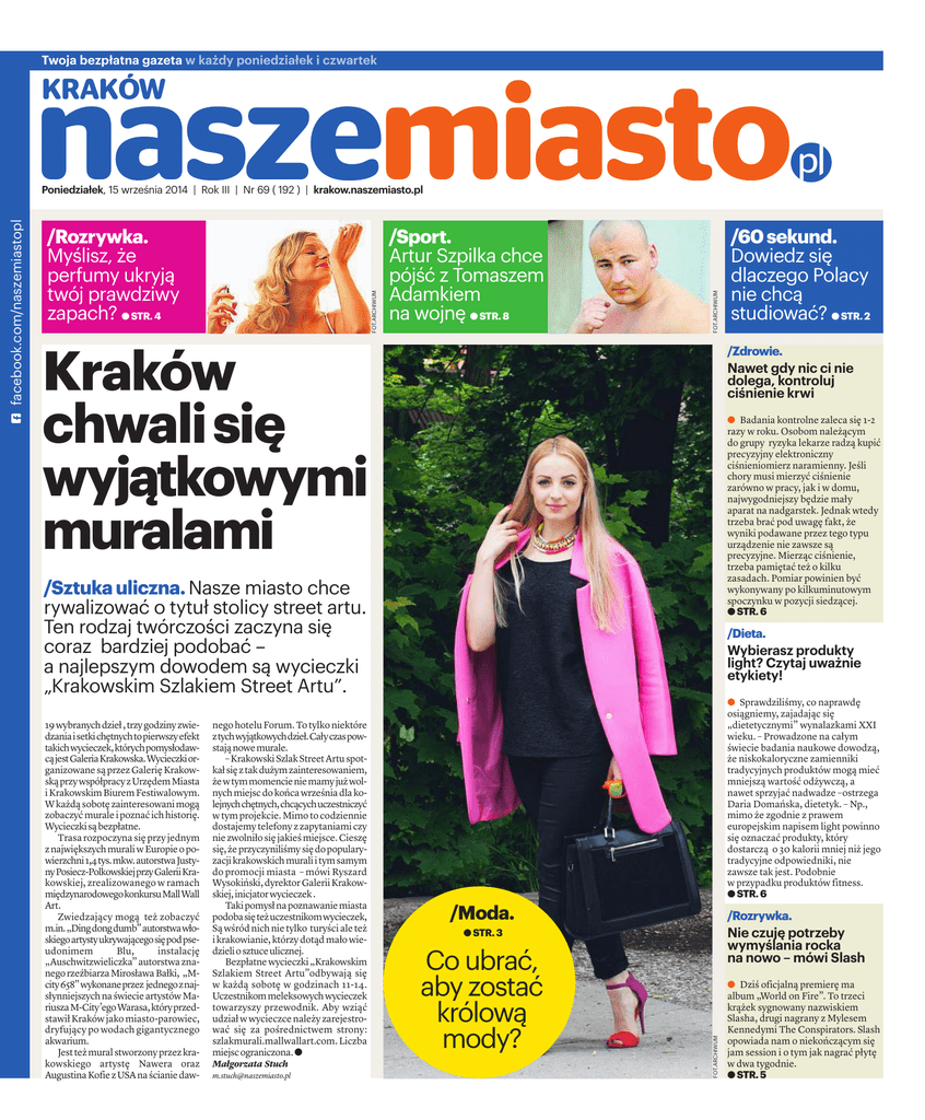 Twoja bezpłatna gazeta w każdy poniedziałek i czwartek KRAKÓW /Sport. Artur Szpilka chce pójść z Tomaszem Adamkiem na wojnę A STR. 8 FOT.ARCHIWUM /Rozrywka. Myślisz, że perfumy ukryją twój prawdziwy zapach? A STR. 4 FOT.ARCHIWUM Kraków chwalisię wyjątkowymi muralami Nawet gdy nic ci nie dolega, kontroluj ciśnienie krwi a Badania kontrolne zaleca się 1-2 razy w roku. Osobom należącym do grupy ryzyka lekarze radzą kupić precyzyjny elektroniczny ciśnieniomierz naramienny. Jeśli chory musi mierzyć ciśnienie zarówno w pracy, jak i w domu, najwygodniejszy będzie mały aparat na nadgarstek. Jednak wtedy trzeba brać pod uwagę fakt, że wyniki podawane przez tego typu urządzenie nie zawsze są precyzyjne. Mierząc ciśnienie, trzeba pamiętać też o kilku zasadach. Pomiar powinien być wykonywany po kilkuminutowym spoczynku w pozycji siedzącej. A STR. 6 /Sztuka uliczna. Nasze miasto chce rywalizować o tytuł stolicy street artu. Ten rodzaj twórczości zaczyna się coraz bardziej podobać – a najlepszym dowodem są wycieczki „Krakowskim Szlakiem Street Artu”. 19 wybranych dzieł , trzy godziny zwiedzaniaisetkichętnychtopierwszyefekt takichwycieczek,którychpomysłodawcąjestGaleriaKrakowska.Wycieczkiorganizowane są przez Galerię Krakowską przy współpracy z Urzędem Miasta i Krakowskim Biurem Festiwalowym. W każdą sobotę zainteresowani mogą zobaczyć murale i poznać ich historię. Wycieczki są bezpłatne. Trasa rozpoczyna się przy jednym z największych murali w Europie o powierzchni1,4tys.mkw.autorstwaJustynyPosiecz-PolkowskiejprzyGaleriiKrakowskiej, zrealizowanego w ramach międzynarodowegokonkursuMallWall Art. Zwiedzający mogą też zobaczyć m.in.„Dingdongdumb”autorstwawłoskiegoartystyukrywającegosiępodpseudonimem Blu, instalację „Auschwitzwieliczka” autorstwa znanego rzeźbiarza Mirosława Bałki, „Mcity658”wykonaneprzez jednegoznajsłynniejszych na świecie artystów MariuszaM-City’egoWarasa,któryprzedstawił Kraków jako miasto-parowiec, dryfujący po wodach gigantycznego akwarium. Jest też mural stworzony przez krakowskiego artystę Nawera oraz Augustina Kofie z USA na ścianie daw- nego hotelu Forum. To tylko niektóre ztychwyjątkowychdzieł.Całyczaspowstają nowe murale. – Krakowski Szlak Street Artu spotkał się z tak dużym zainteresowaniem, że w tym momencie nie mamy już wolnych miejsc do końca września dla kolejnychchętnych,chcącychuczestniczyć w tym projekcie. Mimo to codziennie dostajemy telefony z zapytaniami czy nie zwolniło się jakieś miejsce. Cieszę się, że przyczyniliśmy się do popularyzacji krakowskich murali i tym samym do promocji miasta – mówi Ryszard Wysokiński, dyrektor Galerii Krakowskiej, inicjator wycieczek . Taki pomysł na poznawanie miasta podoba się też uczestnikom wycieczek, Są wśród nich nie tylko turyści ale też i krakowianie, którzy dotąd mało wiedzieli o sztuce ulicznej. Bezpłatne wycieczki „Krakowskim Szlakiem Street Artu”odbywają się w każdą sobotę w godzinach 11-14. Uczestnikom meleksowych wycieczek towarzyszy przewodnik. Aby wziąć udział w wycieczce należy zarejestrować się za pośrednictwem strony: szlakmurali.mallwallart.com. Liczba miejsc ograniczona. A Małgorzata Stuch [email protected] /60 sekund. Dowiedz się dlaczego Polacy nie chcą studiować? A STR. 2 /Zdrowie. /Dieta. Wybierasz produkty light? Czytaj uważnie etykiety! a Sprawdziliśmy, co naprawdę osiągniemy, zajadając się „dietetycznymi” wynalazkami XXI wieku. – Prowadzone na całym świecie badania naukowe dowodzą, że niskokaloryczne zamienniki tradycyjnych produktów mogą mieć mniejszą wartość odżywczą, a nawet sprzyjać nadwadze –ostrzega Daria Domańska, dietetyk. – Np., mimo że zgodnie z prawem europejskim napisem light powinno się oznaczać produkty, który dostarczą o 30 kalorii mniej niż jego tradycyjne odpowiedniki, nie zawsze tak jest. Podobnie w przypadku produktów fitness. A STR. 6 /Moda. /Rozrywka. Nie czuję potrzeby wymyślania rocka na nowo – mówi Slash A STR. 3 Co ubrać, aby zostać królową mody? FOT.ARCHIWUM facebook.com/naszemiastopl Poniedziałek, 15 września 2014 | Rok III | Nr 69 ( 192 ) | krakow.naszemiasto.pl a Dziś oficjalną premierę ma album „World on Fire”. To trzeci krążek sygnowany nazwiskiem Slasha, drugi nagrany z Mylesem Kennedymi The Conspirators. Slash opowiada nam o niekończącym się jam session i o tym jak nagrać płytę w dwa tygodnie. A STR. 5 facebook.com/naszemiastopl | krakow.naszemiasto.pl 60 SEKUND Naturalnie – nagrody nie dadzą, bo wtedy musieliby się nią udławić, ale zdecydowali pokazać, jak według nich mało liczy się protest jednostki, jak niewiele znaczy fakt, że ktoś mówi „nie”. Marcin Świetlicki, poeta, o nominowaniu jego tomiku„Jeden” do nagrody Nike Kraj i świat z „Gazetą Krakowską“ Współpracy Gospodarczej i Rozwoju wynika, że jeszcze w 2011 roku zdobyć stopień magistra chciało 58 proc. uczniów, teraz takie aspiracje ma 53 proc. /Polska. BLD Pies-pająk pobił wszelkie rekordy w Internecie Mówwwi się gazetakrakowska.pl a 20 września na placu Wolnica odbędzie się Powitanie Jesieni z Bacówką. Jednodniowa impreza będzie promować wyroby tradycyjne z województwa małopolskiego a organizatorzy będą informować uczestników o wpływie wędzenia tradycyjnego na ich zdrowie. Głównym punktem imprezy będzie pokaz tradycyjnego wędzenia przeprowadzony przez mistrza kuchni Zbigniewa Kurletto. Krakowianie będą mogli zarówno spróbować uwędzonych produktów jak i dokonać zakupów. Oprócz wędzenia przewidziany jest także szereg degustacji z wykorzystaniem tradycyjnych produktów z Małopolski . naszemiasto.pl.pl a 17 września (środa) w Grodzkim Urzędzie Pracy przy ul. Wąwozowej 34, w godz. 11–14 odbędzie się Giełda Pracy. Wydarzenie kierowane jest do wszystkich osób bezrobotnych z regionu małopolskkiego oraz osób niepe