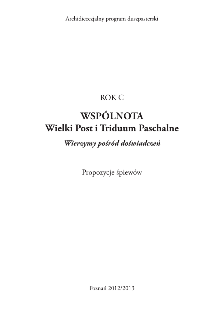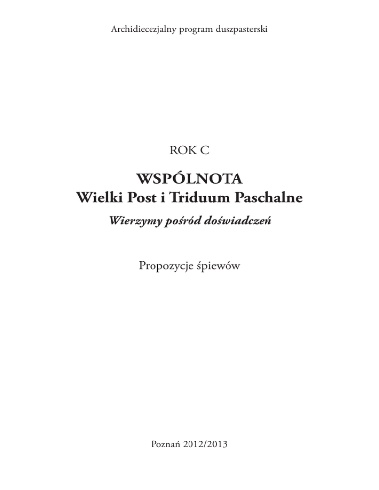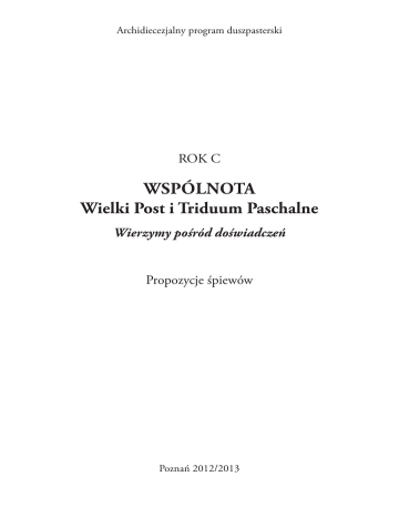 Archidiecezjalny program duszpasterski ROK C Wspólnota Wielki Post i Triduum Paschalne Wierzymy pośród doświadczeń Propozycje śpiewów Poznań 2012/2013 29 30 ROK C Środa Popielcowa W. Bądź mi litościw Podczas posypania głów popiołem: Bliskie jest Królestwo Boże Posypmy głowy popiołem Przed oczy Twoje, Panie Święty Boże D. Dałeś nam przykład, o Jezu Wstanę i pójdę do mojego Ojca K. Zbliżam się w pokorze U drzwi Twoich U. Upadnij na kolana (lub milczenie) Z. Boże, w dobroci I niedziela Wielkiego Postu Jezus przebywał w Duchu Świętym na pustyni i był kuszony. W. Dałeś nam przykład, o Jezu Kto się w opiekę D. Wierzymy w Ciebie, Chryste Panie, umocnij wiarę naszą K. Jak Cię zrozumieć, Tajemnico U drzwi Twoich stoję, Panie U. Dzięki, o Panie Będę Cię wielbił, mój Panie Z. O Boże mój, o Zbawicielu mój Kochajmy Pana II niedziela Wielkiego Postu Przemienienie Pańskie W. Najsłodszy Jezu, Chryste nasz i Panie D. Boże, zmiłuj się nad nami Wstań, który śpisz i powstań K. O Panie, Ty nam dajesz Pokarmie naszej drogi U. Panie nasz, Boże, uwielbiamy Twoje imię Z. Pójdź do Jezusa III niedziela Wielkiego Postu Jeśli się nie nawrócicie, wszyscy podobnie zginiecie. W. Z głębi mojego serca Niech błogosławiony będzie Bóg D. Boże, Ojcze wszechmogący Przychodzisz, Panie, zmiłuj się K. Oto święte Ciało Pana Cóż Ci, Jezu, damy U. Dziękujemy Ci, Ojcze nasz Pieśń wdzięczności Z. Boże, coś przyrzekł IV niedziela Wielkiego Postu Przypowieść o synu marnotrawnym. W. Wstanę i pójdę do mojego Ojca Przed oczy Twoje, zagniewany Panie D. Jezu miłosierny K. Skosztujcie i zobaczcie O Panie, otwierasz rękę swoją U. Bądź uwielbiony, miłosierny Boże Upadnij na kolana Z. Boże, w dobroci V niedziela Wielkiego Postu Od tej chwili już nie grzesz. W. Panie, ufam miłosierdziu Twemu Daj nam, o Panie, nowe serce D. Nawróć się, ludu, w pokorze Boże, coś przyrzekł K. Zbliżam się w pokorze Słowo Chlebem się stało U. Święty jest Bóg sam Z. W krzyżu cierpienie Któż nam zagrozi 31 VI niedziela Wielkiego Postu – Niedziela Męki Pańskiej Poświęcenie palm: Hosanna Synowi Dawidowemu Procesja z palmami: Wjeżdża Król nasz + Chrystus Wodzem Idziesz przez wieki D. Krzyżu Święty, nade wszystko Najdroższy Jezu, w czymże Twoja wina K. O Krwi Najdroższa Witam Cię, witam U. Śpiewaj, śpiewaj sercem całym Króla wznoszą się znamiona Z. Wisi na krzyżu Jezu Chryste, Panie miły Wielki Czwartek – Msza Wieczerzy Pańskiej W. W Krzyżu cierpienie A myśmy się chlubić powinni (antyfona śpiewana na przemian z pieśnią: W krzyżu cierpienie) Pan wieczernik przygotował Podczas obrzędu umycia nóg: Przykazanie nowe D. Jak Cię zrozumieć, Tajemnico Gdzie miłość wzajemna K. Kiedy razem się schodzimy Pan wieczernik przygotował Umiłowałeś nas do końca U. Dziękujemy Ci, Ojcze nasz Podczas przeniesienia Najświętszego Sakramentu do ołtarza wystawienia: Sław, języku, Tajemnicę Wielki Piątek Adoracja krzyża: Ludu, mój ludu + Święty, Boże Krzyżu Święty, nade wszystko Krzyżu, mój krzyżu Krzyżu Chrystusa Zmiłuj się, Panie K. O Krwi Najdroższa Witam Cię, witam U. Śpiewaj sercem całym Witaj, krzyżu zwycięski Podczas procesji do grobu: Odszedł Pasterz Wigilia Paschalna Po odnowieniu przyrzeczeń chrzcielnych: O Chryste, nasz Panie Com przyrzekł Bogu D. Otrzyjcie już łzy K. Zwycięzca śmierci Oto dzień, w którym Pan nasz zmartwychwstał Podczas procesji rezurekcyjnej: Wesoły nam dzień dziś nastał Po powrocie: Ciebie Boga wysławiamy Po błogosławieństwie Najświętszego Sakramentu: Pan zmartwychwstał i jest z nami Wesel się, Królowo miła Propozycje pieśni zaczerpnięto ze śpiewnika „Exultate Deo” (2004) i „Śpiewnika kościelnego” ks. Siedleckiego (2001). Zaproponowano także kilka pieśni – do wyboru. 32