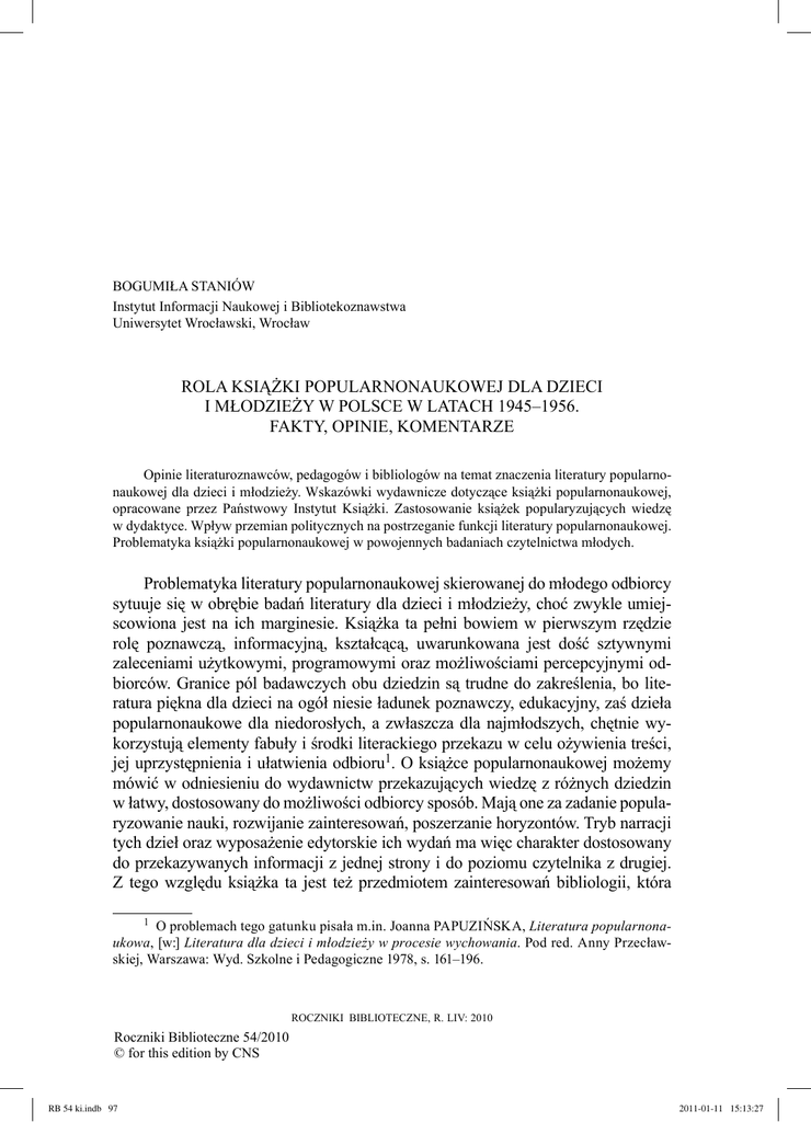 BOGUMIŁA STANIÓW Instytut Informacji Naukowej i Bibliotekoznawstwa Uniwersytet Wrocławski, Wrocław ROLA KSIĄŻKI POPULARNONAUKOWEJ DLA DZIECI I MŁODZIEŻY W POLSCE W LATACH 1945–1956. FAKTY, OPINIE, KOMENTARZE Opinie literaturoznawców, pedagogów i bibliologów na temat znaczenia literatury popularnonaukowej dla dzieci i młodzieży. Wskazówki wydawnicze dotyczące książki popularnonaukowej, opracowane przez Państwowy Instytut Książki. Zastosowanie książek popularyzujących wiedzę w dydaktyce. Wpływ przemian politycznych na postrzeganie funkcji literatury popularnonaukowej. Problematyka książki popularnonaukowej w powojennych badaniach czytelnictwa młodych. Problematyka literatury popularnonaukowej skierowanej do młodego odbiorcy sytuuje się w obrębie badań literatury dla dzieci i młodzieży, choć zwykle umiejscowiona jest na ich marginesie. Książka ta pełni bowiem w pierwszym rzędzie rolę poznawczą, informacyjną, kształcącą, uwarunkowana jest dość sztywnymi zaleceniami użytkowymi, programowymi oraz możliwościami percepcyjnymi odbiorców. Granice pól badawczych obu dziedzin są trudne do zakreślenia, bo literatura piękna dla dzieci na ogół niesie ładunek poznawczy, edukacyjny, zaś dzieła popularnonaukowe dla niedorosłych, a zwłaszcza dla najmłodszych, chętnie wykorzystują elementy fabuły i środki literackiego przekazu w celu ożywienia treści, jej uprzystępnienia i ułatwienia odbioru1. O książce popularnonaukowej możemy mówić w odniesieniu do wydawnictw przekazujących wiedzę z różnych dziedzin w łatwy, dostosowany do możliwości odbiorcy sposób. Mają one za zadanie popularyzowanie nauki, rozwijanie zainteresowań, poszerzanie horyzontów. Tryb narracji tych dzieł oraz wyposażenie edytorskie ich wydań ma więc charakter dostosowany do przekazywanych informacji z jednej strony i do poziomu czytelnika z drugiej. Z tego względu książka ta jest też przedmiotem zainteresowań bibliologii, która 1 O problemach tego gatunku pisała m.in. Joanna PAPUZIŃSKA, Literatura popularnonaukowa, [w:] Literatura dla dzieci i młodzieży w procesie wychowania. Pod red. Anny Przecławskiej, Warszawa: Wyd. Szkolne i Pedagogiczne 1978, s. 161–196. ROCZNIKI BIBLIOTECZNE, R. LIV: 2010 Roczniki Biblioteczne 54/2010 © for this edition by CNS RB 54 ki.indb 97 2011-01-11 15:13:27 98 BOGUMIŁA STANIÓW bada zarówno elementy jej morfologii (w ujęciu historycznym i współcześnie, często z ukierunkowaniem edytorskim), jak i procesy jej powstawania, rozpowszechniania oraz użytkowania. Na tym ostatnim zagadnieniu skupiają się też refleksje pedagogów, którzy są zainteresowani treściami przenoszonymi przez tekst popularnonaukowy, ich percepcją oraz sposobami wykorzystania w praktyce dydaktycznej. Funkcję książki popularnonaukowej pełniły w historii literatury dla dzieci różnego rodzaju edycje. Jeszcze przed ukształtowaniem się specjalnych publikacji skierowanych do młodego czytelnika pokazywano dzieciom ilustracje z wydań przeznaczonych dla dorosłych, zwłaszcza te kolorowe. Na pewno wiązało się to ze swobodnym komentarzem dorosłych na temat treści owych obrazów, uproszczonym opisem czy opowiadaniem, dostosowanym do wieku i wiedzy dziecka. Właściwie większość polskich utworów XIX-wiecznych skierowanych do młodych odbiorców miała charakter poznawczy lub mieszany: literacko-poznawczy. W magazynach, kalendarzach, „pierwszych książkach”, wypisach i czytankach zgrabnie przeplatano utwory literackie z popularnonaukowymi. Pod koniec wieku zaczęto dla celów popularyzacyjnych stosować celowo gawędę, pogadankę, opis wycieczki, życiorys, dialog (np. nauczyciela i ucznia). Edycje przyjmowały postać encyklopedii, książki-atlasu, zbioru szarad i zagadek, ale ich forma wydawnicza — do końca II wojny światowej — była na ogół dość uboga, co przy niskich nakładach i wysokiej cenie wpływało na ich ograniczony zasięg społeczny2. Choć teksty popularnonaukowe nie oparły się wpływom przemian życia politycznego powojennej Polski, co przejawiało się przede wszystkim w doborze tematyki (i celowym unikaniu niektórych zagadnień) oraz ideologizacji przedstawianych treści, towarzyszyło im jednak zawsze powszechne przekonanie o wartości intelektualnej i pożyteczności, jakkolwiek nie zawsze były one wykorzystywane tak, jak na to zasługiwały. Opinie o literaturze i książce popularnonaukowej dla dzieci i młodzieży, ich kształcie, wartości, użyteczności i stopniu wykorzystania formułowali literaturoznawcy, pedagodzy, księgoznawcy w trakcie naukowych konferencji, w publikacjach prasowych i dokumentach organizacji zajmujących się książką. Podstawowym źródłem informacji na ten temat jest prasa kulturalna i pedagogiczna tamtych lat3. Pominięte zostaną recenzje poszczególnych tytułów, serii wydawni2 W okresie międzywojennym wydawano też tanie serie książek popularnonaukowych, piszę o tym w artykule pt. Serie książek popularnonaukowych dla dzieci i młodzieży w Polsce międzywojennej jako źródło informacji o świecie, nauce i człowieku (na wybranych przykładach), [w:] Przestrzeń informacyjna książki. Pod red. Jadwigi Koniecznej, Stanisławy Kurek-Kokocińskiej i Hanny Tadeusiewicz, Łódź: Uniwersytet Łódzki 2009, s. 339–353. 3 Autorka zgromadziła odpowiedni materiał w drodze poszukiwań bibliograficznych. Podstawowym źródłem była „Bibliografia Zawartości Czasopism” oraz kartoteka publikacji za lata 1949, 1950 i część 1951 (nie wydawano wtedy drukiem „Bibliografii Zawartości Czasopism”), przechowywana w Instytucie Bibliograficznym Biblioteki Narodowej. Aktualnie znaczna część tej kartoteki jest już sprawdzona z autopsji i przeniesiona do bazy komputerowej, tworzonej przez Roczniki Biblioteczne 54/2010 © for this edition by CNS RB 54 ki.indb 98 2011-01-11 15:13:27 ROLA KSIĄŻKI POPULARNONAUKOWEJ DLA DZIECI I MŁODZIEŻY 99 c