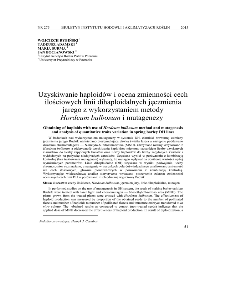 NR 275 BIULETYN INSTYTUTU HODOWLI I AKLIMATYZACJI ROŚLIN 2015 WOJCIECH RYBIŃSKI 1 TADEUSZ ADAMSKI 1 MARIA SURMA 1 JAN BOCIANOWSKI 2 1 2 Instytut Genetyki Roślin PAN w Poznaniu Uniwersytet Przyrodniczy w Poznaniu Uzyskiwanie haploidów i ocena zmienności cech ilościowych linii dihaploidalnych jęczmienia jarego z wykorzystaniem metody Hordeum bulbosum i mutagenezy∗ Obtaining of haploids with use of Hordeum bulbosum method and mutagenesis and analysis of quantitative traits variation in spring barley DH lines W badaniach nad wykorzystaniem mutagenezy w systemie DH, ziarniaki browarnej odmiany jęczmienia jarego Rudzik naświetlano biostymulującą dawką światła lasera a następnie poddawano działaniu chemomutagenu — N-metylo-N-nitrosmocznika (MNU). Otrzymane rośliny krzyżowano z Hordeum bulbosum a efektywność uzyskiwania haploidów mierzono stosunkiem liczby uzyskanych ziarniaków do liczby zapylonych kwiatów oraz liczby haploidów do liczby zapylonych kwiatów i wykładanych na pożywkę niedojrzałych zarodków. Uzyskane wyniki w porównaniu z kombinacją kontrolną (bez traktowania mutagenem) wykazały, że mutagen wpływał na obniżenie wartości wyżej wymienionych parametrów. Linie dihaploidalne (DH) uzyskane w wyniku podwajania liczby chromosomów rozmnażano, a następnie w warunkach pola doświadczalnego analizowano zmienność ich cech ilościowych, głównie plonotwórczych w porównaniu z kombinacją kontrolną. Wykorzystując wielocechową analizę statystyczna wykazano poszerzenie zakresu zmienności ocenianych cech linii DH w porównaniu z ich odmianą wyjściową Rudzik. Słowa kluczowe: cechy ilościowe, Hordeum bulbosum, jęczmień jary, linie dihaploidalne, mutagen In performed studies on the use of mutagenesis in DH system, the seeds of malting barley cultivar Rudzik were treated with laser light and chemomutagen — N-methyl-N-nitroso urea (MNU). The plants grown from the treated plants were crossed with Hordeum bulbosum. The effectiveness of haploid production was measured by proportion of the obtained seeds to the number of pollinated florets and number of haploids to number of pollinated florets and immature embryos transferred to in vitro culture. The obtained results as compared to control (non-treated seeds) indicates that the applied dose of MNU decreased the effectiveness of haploid production. In result of diploidization, a ∗ Redaktor prowadzący: Henryk J. Czembor 51 Wojciech Rybiński ... numerous DH plants were obtained which were propagated and used for estimation of quantitative traits variability in a field trial. The use of multivariate statistical method indicates that DH lines were characterized by a broader range of traits variability in comparison with their initial cultivar Rudzik. Key words: dihaploid lines, Hordeum bulbosum, mutagen, spring barley, quantitative traits WSTĘP Uzyskiwanie podwojonych haploidów (DH) w oparciu o dobrze poznane techniki ich generowania znalazło swe odzwierciedlenie u licznych gatunków roślin uprawnych, a zwłaszcza tytoniu, rzepaku, ziemniaków, ryżu, pszenicy i jęczmienia (Szarejko i in., 1991). Jedną z podstawowych zalet wykorzystywania podwojonych haploidów jest istotne skrócenie cyklu hodowlanego, co w przypadku jęczmienia pozwala go skrócić o 2–3 lata poprzez uzyskanie roślin całkowicie homozygotycznych z dowolnej formy heterozygotycznej. Nie oferuje tego hodowla tradycyjna, gdyż nawet po wielopokoleniowym chowie wsobnym utrzymuje się tzw. resztkowa heterozygotyczność (Surma, 1997). Haploidy mogą być uzyskiwane zarówno z męskich, jak i żeńskich komórek gametycznych poprzez kultury pylników, izolowane mikrospory, zalążnie oraz zalążki. Można je również uzyskiwać poprzez krzyżowanie oddalone na drodze eliminacji chromosomów jednego z rodziców. W wyniku krzyżowania niektórych gatunków w rozwijającym się zarodku następuje eliminacja chromosomów jednej z form rodzicielskich. Znaczenie mają zwłaszcza te kombinacje krzyżowań, w których eliminacja chromosomów jednej z form jest całkowita, ponieważ daje to możliwość uzyskania form tego gatunku, którego chromosomy nie są eliminowane (Surma, 1997). Haploidalne lub dihaploidalne formy jęczmienia (H. vulgare) można uzyskiwać w wyniku krzyżowań międzyrodzajowych lub międzygatunkowych w obrębie rodzaju Hordeum. W odniesieniu do jęczmienia uprawnego (H. vulgare) istotne są te kombinacje krzyżowań z innymi gatunkami, w których eliminowane są chromosomy gatunku dzikiego. Kasha i Kao (1970) opisali procedurę uzyskiwania wysokiej częstości haploidów jęczmienia powstających w wyniku skrzyżowania H. vulgare z H. bulbosum, którą wykorzystano w realizacji badań w prezentowanej pracy. W badaniach, których celem jest otrzymanie haploidalnych roślin jęczmienia uprawnego metodą H. bulbosum z reguły obiektem są mieszańce lub odmiany. W praktyce hodowlanej linie DH najczęściej otrzymuje się z mieszańców. W celu uzyskania innej zmienności aniżeli zmienność rekombinacyjna, coraz częściej wykorzystuje się odmiany, których ziarniaki poddaje się działaniu związków mutagennych dla uzyskania i utrwalenia zmienności mutacyjnej (Umba Di-Umba i in., 1991; Laib i in., 1996). Szybki skrining zarówno dominujących, jak i recesywnych mutacji w pierwszym pokoleniu po traktowaniu mutagennym, przy braku chimeryzmu, jest podstawową korzyścią wynikającą ze stosowania mutagenezy w systemie DH (Laib i in., 1996). Niewątpliwym problemem stosowania wyżej wspomnianej procedury może być występowanie uszkodzeń somatycznych (wywoływanych działaniem mutagenu u roślin pokolenia M1) objawiających się między innymi obniżeniem płodności roślin, 52 Wojciech Rybiński ... zwłaszcza przy silniejszych dawkach mutagenu. Może to mieć negatywny wpływ na efektywność uzyskiwania haploidów metodą H. bulbosum. Według Rybińskiego (2003) chemomutagen — N-metylo-N-nitrozomoczn