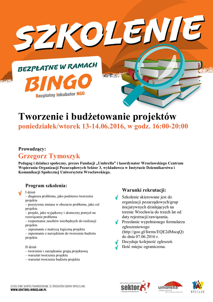 Tworzenie i budżetowanie projektów poniedziałek/wtorek 13-14.06.2016, w godz. 16:00-20:00 Prowadzący: Grzegorz Tymoszyk Pedagog i działacz społeczny, prezes Fundacji „Umbrella” i koordynator Wrocławskiego Centrum Wspierania Organizacji Pozarządowych Sektor 3, wykładowca w Instytucie Dziennikarstwa i Komunikacji Społecznej Uniwersytetu Wrocławskiego. Program szkolenia: I dzień – diagnoza problemu, jako podstawa tworzenia projektu – pozytywna zmiana w obszarze problemu, jako cel projektu – projekt, jako wyjątkowy i skuteczny pomysł na rozwiązanie problemu – rozpoznanie zasobów niezbędnych do realizacji projektu – zapoznanie z matrycą logiczną projektu – zapoznanie z narzędziem do tworzenia budżetu projektu II dzień – tworzenie i zarządzanie grupą projektową – warsztat tworzenia projektu – warsztat tworzenia budżetu projektu Warunki rekrutacji: Szkolenie skierowane jest do organizacji pozarządowych/grup inicjatywnych działających na terenie Wrocławia do trzech lat od daty rejestracji/zawiązania. Przesłanie wypełnionego formularza zgłoszeniowego (http://goo.gl/forms/EQE2dMscqQ) do dnia 07.06.2016 r. Decyduje kolejność zgłoszeń. Ilość miejsc ograniczona.