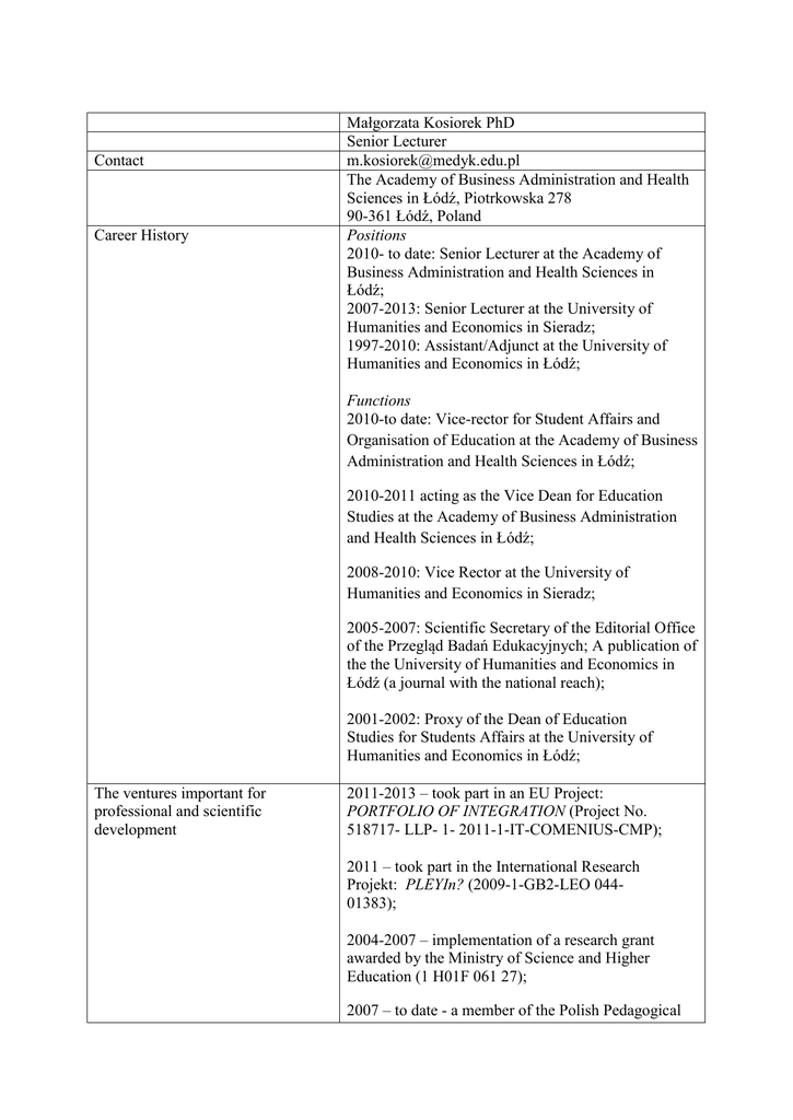 Contact Career History Małgorzata Kosiorek PhD Senior Lecturer [email protected] The Academy of Business Administration and Health Sciences in Łódź, Piotrkowska 278 90-361 Łódź, Poland Positions 2010- to date: Senior Lecturer at the Academy of Business Administration and Health Sciences in Łódź; 2007-2013: Senior Lecturer at the University of Humanities and Economics in Sieradz; 1997-2010: Assistant/Adjunct at the University of Humanities and Economics in Łódź; Functions 2010-to date: Vice-rector for Student Affairs and Organisation of Education at the Academy of Business Administration and Health Sciences in Łódź; 2010-2011 acting as the Vice Dean for Education Studies at the Academy of Business Administration and Health Sciences in Łódź; 2008-2010: Vice Rector at the University of Humanities and Economics in Sieradz; 2005-2007: Scientific Secretary of the Editorial Office of the Przegląd Badań Edukacyjnych; A publication of the the University of Humanities and Economics in Łódź (a journal with the national reach); 2001-2002: Proxy of the Dean of Education Studies for Students Affairs at the University of Humanities and Economics in Łódź; The ventures important for professional and scientific development 2011-2013 – took part in an EU Project: PORTFOLIO OF INTEGRATION (Project No. 518717- LLP- 1- 2011-1-IT-COMENIUS-CMP); 2011 – took part in the International Research Projekt: PLEYIn? (2009-1-GB2-LEO 04401383); 2004-2007 – implementation of a research grant awarded by the Ministry of Science and Higher Education (1 H01F 061 27); 2007 – to date - a member of the Polish Pedagogical Associations; 2003 – 2005 - a member of the Janusz Korczak Association; 1997-1998 – Pedagogics of Creativity Postgraduate Studies; Selected Publication Baranowska W., Kosiorek M. Immigrant Studentshope for Polish demography and a challenge for national education from the perspective of ‘Portfolio of Integration’ (POI) project experience [w:] Luatti, L. (ed.) Observing in Order to Understand and Operate in Multicultural Classes, Oxfam Italia, Arezzo 2013. Baranowska W., Kosiorek, M., Luatti L., Ntelli N., McAdam J., McKinney S., and Sahin M. Portfolio of Integration: Final Need Analysis Project Report. European Commission, 2012. Kosiorek M., Dom pomocy społecznej jako instytucja totalna, [w:] Opieka i wychowanie w instytucjach wsparcia społecznego. Diagnoza i kierunki rozwoju, red. R. Szczepanik, J. Wawrzyniak, Wyd. AHE, Łódź 2012. Kosiorek M., Tutoring w szkole, [w:] Motywacja w edukacji, red. E. Przygońska, Wyd. A. Marszałek, Toruń 2011. Kosiorek M., Defaworyzacja społeczna osób z niepełnosprawnością intelektualną, [w:] Psychospołeczne uwarunkowania defaworyzacji dzieci i młodzieży, red. K. Hirszel, D. Modrzejewska, R. Szczepanik, A. Zbonikowski, Difin, Warszawa 2010. Kosiorek M., Przemoc symboliczna w edukacji, [w:] Różne spojrzenia na przemoc, red. R. Szczepanik, J. Wawrzyniak, WSHE, Łódź 2008. Kosiorek M., Pedagogika autorytarna. Geneza, modele, przemiany, Oficyna Wydawnicza Impuls, Kraków 2007. Kosiorek M., „Miejmy odwagę kierować dzieckiem” czyli wychowanie w ujęciu Jamesa Dobsona. Analiza metateoretyczna, [w:] Pedagogika rodziny. Wybrane zagadnienia, red. S. Cudak, Akademia Świętokrzyska, Kielce 2007. Research Interests Kosiorek M., Aktywne metody nauczania podstawą analizy biografii i twórczości pedagogicznej Janusza Korczaka, [w:] Pedagogika Janusza Korczaka – realizm czy utopia? red. I. J. Pyrzyk, Wyższa Szkoła Humanistyczno - Ekonomiczna, Włocławek 2006. Reception and adaptation of modern trends, theories and ideologies of education; Hidden dimensions of educational institutions; Development of professional competence of teachers; Diagnosis of the learner’s social situation and management of diversity in the classroom.