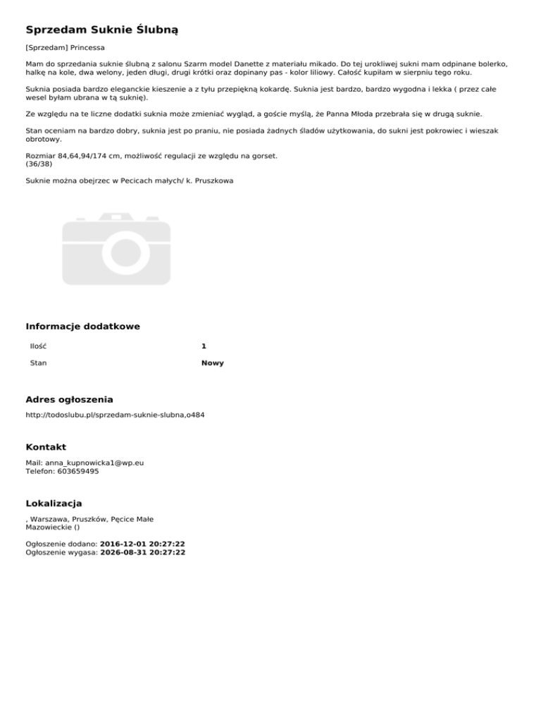 Sprzedam Suknie Ślubną [Sprzedam] Princessa Mam do sprzedania suknie ślubną z salonu Szarm model Danette z materiału mikado. Do tej urokliwej sukni mam odpinane bolerko, halkę na kole, dwa welony, jeden długi, drugi krótki oraz dopinany pas - kolor liliowy. Całość kupiłam w sierpniu tego roku. Suknia posiada bardzo eleganckie kieszenie a z tyłu przepiękną kokardę. Suknia jest bardzo, bardzo wygodna i lekka ( przez całe wesel byłam ubrana w tą suknię). Ze względu na te liczne dodatki suknia może zmieniać wygląd, a goście myślą, że Panna Młoda przebrała się w drugą suknie. Stan oceniam na bardzo dobry, suknia jest po praniu, nie posiada żadnych śladów użytkowania, do sukni jest pokrowiec i wieszak obrotowy. Rozmiar 84,64,94/174 cm, możliwość regulacji ze względu na gorset. (36/38) Suknie można obejrzec w Pecicach małych/ k. Pruszkowa Informacje dodatkowe Ilość 1 Stan Nowy Adres ogłoszenia http://todoslubu.pl/sprzedam-suknie-slubna,o484 Kontakt Mail: [email protected] Telefon: 603659495 Lokalizacja , Warszawa, Pruszków, Pęcice Małe Mazowieckie () Ogłoszenie dodano: 2016-12-01 20:27:22 Ogłoszenie wygasa: 2026-08-31 20:27:22 Powered by TCPDF (www.tcpdf.org)