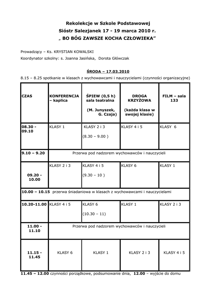 Rekolekcje w Szkole Podstawowej Sióstr Salezjanek 17 - 19 marca 2010 r. „ BO BÓG ZAWSZE KOCHA CZŁOWIEKA” Prowadzący – Ks. KRYSTIAN KOWALSKI Koordynator szkolny: s. Joanna Jasińska, Dorota Główczak ŚRODA – 17.03.2010 8.15 – 8.25 spotkanie w klasach z wychowawcami i nauczycielami (czynności organizacyjne) CZAS 08.30 09.10 KONFERENCJA – kaplica KLASY 1 ŚPIEW (0,5 h) sala teatralna DROGA KRZYŻOWA (M. Junyszek, G. Czaja) (każda klasa w swojej klasie) KLASY 2 i 3 KLASY 4 i 5 FILM – sala 133 KLASY 6 (8.30 – 9.00 ) 9.10 – 9.20 Przerwa pod nadzorem wychowawców i nauczycieli KLASY 2 i 3 KLASY 4 i 5 09.20 10.00 KLASY 6 KLASY 1 (9.30 – 10 ) 10.00 – 10.15 przerwa śniadaniowa w klasach z wychowawcami i nauczycielami 10.20-11.00 KLASY 4 i 5 KLASY 6 KLASY 1 KLASY 2 i 3 (10.30 – 11) 11.00 11.10 11.15 11.45 Przerwa pod nadzorem wychowawców i nauczycieli KLASY 6 KLASY 1 KLASY 2 i 3 KLASY 4 i 5 11.45 – 12.00 czynności porządkowe, podsumowanie dnia, 12.00 – wyjście do domu ZBIÓRKA ŻYWNOŚCI (środa, czwartek, piątek) w swoich salach. Klasy zebraną żywność zabierają ze sobą na mszę św. w piątek i przed rozpoczęciem mszy św. układają w koszach. CZWARTEK – 18.03.2010 8.15 – 8.25 spotkanie w klasach z wychowawcami i nauczycielami (czynności organizacyjne) KONFERENCJA – kaplica ŚPIEW (0,5 h)sala teatralna FILM – sala 133 CZAS z wychowawc ą M. Junyszek 08.30-09.10 KLASY 1 KLASY 2 i 3 GODZINA KLASY 4 i 5 KLASY 6 Okazja do spowiedzi 09.20-10.00 KLASY 2 i 3 KLASY 4 i 5 KLASY 6 KLASY 1 Okazja do spowiedzi 10.00 – 10.15 przerwa śniadaniowa w klasach z wychowawcami i nauczycielami 10.20-11.05 KLASY 4 i 5 KLASY 6 KLASY 1 KLASY 2 i 3 Okazja do spowiedzi 11.15 -11.45 KLASY 6 KLASY 1 KLASY 2 i 3 KLASY 4 i 5 11.45 – 12.00 czynności porządkowe, podsumowanie dnia, 12.00 – wyjście do domu 8.30 – 11.00 spowiedź 17.30 – KONFERENCJA DLA RODZICÓW- STOŁÓWKA wszystkich poziomów PIĄTEK – 19.03.2010 8.15 – 8.25 spotkanie w klasach z wychowawcami i nauczycielami (czynności organizacyjne) CZAS KONFERENCJA ŚPIEW 08.30 - 09.10 KLASY 4 – 6 (sala teatralna) KLASY 1 – 3 (sala 133) 9.10 – 9.20 Przerwa pod nadzorem wychowawców i nauczycieli 09.20 - 10.00 KLASY 1 – 3 (sala 133) KLASY 4 – 6 (sala teatralna) 10.00 – 10.30 przerwa śniadaniowa w klasach z wychowawcami i nauczycielami, przygotowanie do wyjścia na Mszę św. 11.00 12.00 Msza święta w kościele św. Antoniego ZAKOŃCZENIE REKOLEKCJI – podziękowania Uczniowie z nauczania indywidualnego w miarę swoich możliwości (po konsultacji z rodzicami) biorą udział w rekolekcjach z klasą.