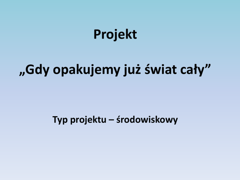 Projekt „Gdy opakujemy już świat cały” Typ projektu – środowiskowy Cele projektu A - ogólne 1. Kształtowanie zachowań przyjaznych dla środowiska 2. Zdobycie i poszerzenie wiedzy nt odpadów i sposobów ich wykorzystywania B – operacyjne Uczeń zna: - rodzaje opakowań występujące na rynku krajowym, - historię opakowań - pojęcia związane z opakowaniami - sposoby zmniejszenia ilości opakowań Uczeń potrafi: - rozpoznać symbole stosowane na opakowaniach - prześledzić cykl życia opakowania - segregować opakowania Ramy organizacyjne: Podmioty współpracujące i współdziałające: 1) 2) 3) 4) Szkoła (nauczyciele i uczniowie) KZG Dolina Redy i Chylonki Wydział Ochrony Środowiska UM w Gdyni Rodzice Nauczyciele Koordynator: - stworzenie planu pracy i harmonogramu działań - przydział obowiązków - kontrola terminowości wykonania zadań - udzielanie wskazówek Inni nauczyciele realizujący projekt: - świetlicy - klas I-III SP - przyrody i biologii - zajęć artystycznych - poloniści - informatycy Uczniowie: Adresatami projektu są uczniowie klas 3 -6 szkoły podstawowej i 1 gimnazjum. Grupa informacyjna – wyszukiwanie informacji, przekazywanie innym Grupa artystyczna – przygotowanie plakatów, ułożenie piosenki, prace plastyczne w formie przestrzennej Grupa komputerowa – stworzenie prezentacji efektów pracy poszczególnych grup Grupa polonistyczna – konkurs na rymowankę, opracowanie dyktanda Grupa badawcza – przeprowadzenie badań empirycznych nt. Cykl życia opakowania Grupa matematyczna – tworzenie zadań na temat zmniejszenia ilości opakowań w gospodarstwie domowym KZG Wsparcie profesjonalną wiedzą, materiałami edukacyjnymi, warsztatami, patronat w konkursach Wydział Ochrony Środowiska UM Wsparcie profesjonalną wiedzą, w konkursach, Ekopatrol patronat Działania szkolne 1) Warsztaty z up-cyklingu. 2) Konkursy: plastyczny, na rymowankę, piosenkę. 3) Dyktando - przygotowanie i przeprowadzenie. 4) Zadania matematyczne. 5) Apel tematyczny. 6) Spotkanie tematyczne dla danej grupy wiekowej. 7) Pogadanki - spotkanie z ekspertem. 8) Gry tradycyjne i interaktywne. 9) Quizy w programie kahoot. Źródła wiedzy Podręczniki szkolne, Internet, czasopisma przyrodnicze, spotkania ze specjalistą, nauczyciele, materiały w wersji papierowej i elektronicznej KZG. Prezentacja publiczna 1) 2) 3) 4) 5) 6) Apel - przedstawienie cyklu życia odpadów Prezentacja na szkolną stronę internetową Wystawa plakatów, prac przestrzennych Publikacje z wierszami, zadaniami matematycznymi Prowadzenie tablicy informacyjnej Ogłoszenie wyników konkursu szkolnego turnieju wiedzy Ewaluacja Kryteria ewaluacji Ankieta dla uczniów biorących udział w projekcje, wyniki turnieju wiedzy, rozmowy z uczniami, nauczycielami i rodzicami. Czego się spodziewamy? - wzrostu poczucia odpowiedzialności uczniów za stan środowiska przyrodniczego, - ścisłej współpracy między szkołą oraz podmiotami zewnętrznymi. Projekt realizowany przez Borek Agnieszka Brochocka Małgorzata ZS Nr 7 Gdynia