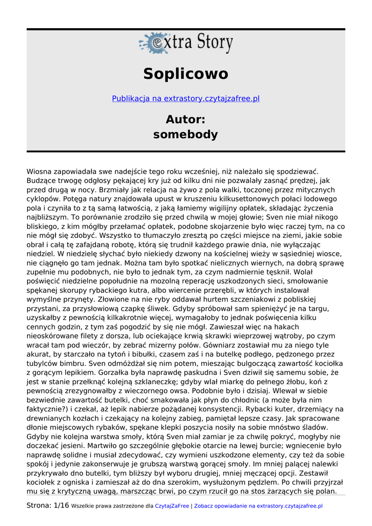 Soplicowo Publikacja na extrastory.czytajzafree.pl Autor: somebody Wiosna zapowiadała swe nadejście tego roku wcześniej, niż należało się spodziewać. Budzące trwogę odgłosy pękającej kry już od kilku dni nie pozwalały zasnąć prędzej, jak przed drugą w nocy. Brzmiały jak relacja na żywo z pola walki, toczonej przez mitycznych cyklopów. Potęga natury znajdowała upust w kruszeniu kilkusettonowych połaci lodowego pola i czyniła to z tą samą łatwością, z jaką łamiemy wigilijny opłatek, składając życzenia najbliższym. To porównanie zrodziło się przed chwilą w mojej głowie; Sven nie miał nikogo bliskiego, z kim mógłby przełamać opłatek, podobne skojarzenie było więc raczej tym, na co nie mógł się zdobyć. Wszystko to tłumaczyło zresztą po części miejsce na ziemi, jakie sobie obrał i całą tę zafajdaną robotę, którą się trudnił każdego prawie dnia, nie wyłączając niedziel. W niedzielę słychać było niekiedy dzwony na kościelnej wieży w sąsiedniej wiosce, nie ciągnęło go tam jednak. Można tam było spotkać nielicznych wiernych, na dobrą sprawę zupełnie mu podobnych, nie było to jednak tym, za czym nadmiernie tęsknił. Wolał poświęcić niedzielne popołudnie na mozolną reperację uszkodzonych sieci, smołowanie spękanej skorupy rybackiego kutra, albo wiercenie przerębli, w których instalował wymyślne przynęty. Złowione na nie ryby oddawał hurtem szczeniakowi z pobliskiej przystani, za przysłowiową czapkę śliwek. Gdyby spróbował sam spieniężyć je na targu, uzyskałby z pewnością kilkakrotnie więcej, wymagałoby to jednak poświęcenia kilku cennych godzin, z tym zaś pogodzić by się nie mógł. Zawieszał więc na hakach nieoskórowane filety z dorsza, lub ociekające krwią skrawki wieprzowej wątroby, po czym wracał tam pod wieczór, by zebrać mizerny połów. Gówniarz zostawiał mu za niego tyle akurat, by starczało na tytoń i bibułki, czasem zaś i na butelkę podłego, pędzonego przez tubylców bimbru. Sven odmóżdżał się nim potem, mieszając bulgoczącą zawartość kociołka z gorącym lepikiem. Gorzałka była naprawdę paskudna i Sven dziwił się samemu sobie, że jest w stanie przełknąć kolejną szklaneczkę; gdyby wlał miarkę do pełnego żłobu, koń z pewnością zrezygnowałby z wieczornego owsa. Podobnie było i dzisiaj. Wlewał w siebie bezwiednie zawartość butelki, choć smakowała jak płyn do chłodnic (a może była nim faktycznie?) i czekał, aż lepik nabierze pożądanej konsystencji. Rybacki kuter, drzemiący na drewnianych kozłach i czekający na kolejny zabieg, pamiętał lepsze czasy. Jak spracowane dłonie miejscowych rybaków, spękane klepki poszycia nosiły na sobie mnóstwo śladów. Gdyby nie kolejna warstwa smoły, którą Sven miał zamiar je za chwilę pokryć, mogłyby nie doczekać jesieni. Martwiło go szczególnie głębokie otarcie na lewej burcie; wgniecenie było naprawdę solidne i musiał zdecydować, czy wymieni uszkodzone elementy, czy też da sobie spokój i jedynie zakonserwuje je grubszą warstwą gorącej smoły. Im mniej palącej nalewki przykrywało dno butelki, tym bliższy był wyboru drugiej, mniej męczącej opcji. Zestawił kociołek z ogniska i zamieszał aż do dna szerokim, wysłużonym pędzlem. Po chwili przyjrzał mu się z krytyczną uwagą, marszcząc brwi, po czym rzucił go na stos żarzących się polan. Strona: 1/16 Wszelkie prawa zastrzeżone dla CzytajZaFree | Zobacz opowiadanie na extrastory.czytajzafree.pl Buchnął ogień tak żywy, jakby podsyciła go zawartość niedopitej szklanki paskudnej, miejscowej mikstury. -Sven Hedlund? - głos mężczyzny brzmiał jak dobiegający z zaświatów. Nie powinno go to dziwić, skoro w zaświatach leżała dla niego nie tylko Mgławica Andromedy, ale i najbliższa wieś, z widoczną stąd drewnianą wieżycą kościoła, do którego nie uczęszczał. Wszystko, co nie mieściło się w zataczanym wzrokiem kręgu, było mu zupełnie przecież obce, a przez to obojętne, jeśli nawet nie wrogie. Kimkolwiek okaże się za chwilę przybysz, już teraz był niepożądanym gościem. -Tak. A o co chodzi? - odpowiedział w sposób, który nie pozostawiał złudzeń co do jego niechęci. Ktoś powitany tak wylewnie, powinien załatwić sprawę, z którą przyszedł i jak najprędzej wracać, skąd przychodził. Smoła zaczynała stygnąć... -Przesyłka. Polecona - przybysz okazał się doręczycielem poczty, co nie czyniło go wcale mniej egzotycznym. Gospodarz nie spodziewał się korespondencji, gdyż, jak sądził, nie miałby jej kto wysłać. Rachunki za energię i olej opałowy opłacał za niego właściciel sklepu po drugiej stronie kanału; zainteresowane tym instytucje wysyłały je na jego adres, sklepikarz zaś doliczał mu ich wartość przy okazji kolejnych zakupów. Nie powinno to nikogo dziwić, skoro był również właścicielem tej chylącej się ku upadkowi, rybackiej chaty i skrawka nabrzeża. List? Sven nie umiał sobie przypomnieć, kiedy otrzymał ostatni. W każdym razie ziemię porastały wtedy jeszcze wielkie paprocie i gigantyczne skrzypy, a z termalnych źródeł buchały kłęby pary wodnej i siarkowodoru. Ściskał teraz w dłoniach szarą kopertę i wyglądał jak ktoś, kto ujrzał ducha. Duchy, z tego, co słyszał, były jednak na ogół niewyraźne i rozmyte; podbródek listonosza zaś rysował się wyjątkowo ostro. Na dodatek pokrywał go trzydniowy zarost. -Musi pan pokwitować. Tutaj - dłoń w futrzanej, jednopalczastej rękawicy, wskazywała miejsce na samokopiującym formularzu. W drugiej listonosz dzierżył długopis. Tusz zgęstniał na tężejącym mrozie i podpis zajął dłuższą chwilę. -Dziękuję. I do zobaczenia! - doręczyciel słusznie nie spodziewał się herbaty z rumem. Odwrócił się na pięcie i podreptał w gęstniejący już półmrok. Koperta była, jak wspomniałem już, z szarego papieru. Nosiła