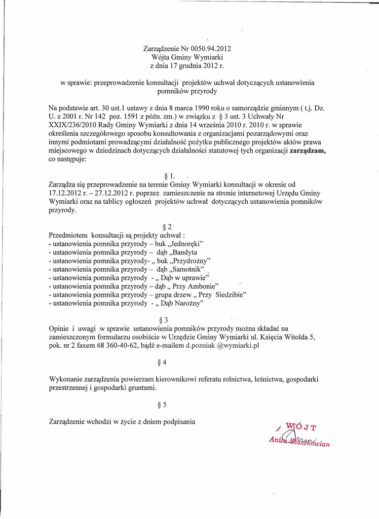 Zarządzenie Nr 0050.94.2012 Wójta Gminy Wymiarki z dnia 17 grudnia 2012 r. w sprawie: przeprowadzenie konsultacji projektów uchwał dotyczących ustanowienia pomników przyrody Na podstawie art. 30 ust. l ustawy z dnia 8 marca 1990 roku o samorządzie gminnym (t.j. Dz. U. z 2001 r. Nr 142 poz. 1591 z późno zm.) w związku z § 3 ust. 3 Uchwały Nr XXIX/236/2010 Rady Gminy Wymiarki z dnia 14 września 2010 r. 2010 r. w sprawie określenia szczegółowego sposobu konsultowania z organizacjami pozarządowymi oraz innymi podmiotami prowadzącymi działalność pożytku publicznego projektów aktów prawa miejscowego w dziedzinach dotyczących działalności statutowej tych organizacji zarządzam, co następuje: §l. Zarządza się przeprowadzenie na terenie GminyWymiarki konsultacji w okresie od 17.12.2012 r. - 27.12.2012 r. poprzez zamieszczenie na stronie internetowej Urzędu Gminy Wymiarki oraz na tablicy ogłoszeń projektów uchwał dotyczących ustanowienia pomników przyrody. §2 Przedmiotem konsultacji są projekty uchwał: - ustanowienia pomnika przyrody - buk "Jednoręki" - ustanowienia-pomnika przyrody - dąb "Bandyta - ustanowienia pomnika przyrody- " buk "Przydrożny" - ustanowienia pomnika przyrody - dąb "Samotnik" ~ - ustanowienia pomnika przyrody -" Dąb w uprawie" - ustanowienia pomnika przyrody - dąb" Przy Ambonie" - ustanowienia pomnika przyrody - grupa drzew" Przy Siedzibie" - ustanowienia pomnika przyrody -" Dąb Narożny" §3 Opinie i uwagi w sprawie ustanowienia pomników przyrody można składać na zamieszczonym formularzu osobiście w Urzędzie Gminy Wymiarki ul. Księcia Witolda 5, pok. nr 2 faxem 68 360-40-62, bądź e-mailem d.pozniak @wymiarki.pl §4 Wykonanie zarządzenia powierzam kierownikowi referatu rolnictwa, leśnictwa, gospodarki przestrzennej i gospodarki gruntami. §5 Zarządzenie wchodzi w życie z dniem podpisania /Jt:~JT An' . unan