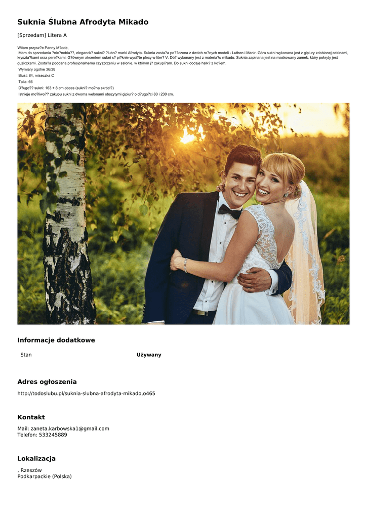 Suknia Ślubna Afrodyta Mikado [Sprzedam] Litera A Witam przysz?e Panny M?ode, Mam do sprzedania ?nie?nobia??, eleganck? sukni? ?lubn? marki Afrodyta. Suknia zosta?a po??czona z dwóch ro?nych modeli - Luthen i Manir. Góra sukni wykonana jest z gipiury zdobionej cekinami, kryszta?kami oraz pere?kami. G?ównym akcentem sukni s? pi?knie wyci?te plecy w liter? V. Dó? wykonany jest z materia?u mikado. Suknia zapinana jest na maskowany zamek, który pokryty jest guziczkami. Zosta?a poddana profesjonalnemu czyszczeniu w salonie, w którym j? zakupi?am. Do sukni dodaje halk? z ko?em. Wymiary ogólne 36/38 Biust: 84, miseczka C Talia: 66 D?ugo?? sukni: 163 + 8 cm obcas (sukni? mo?na skróci?) Istnieje mo?liwo?? zakupu sukni z dwoma welonami obszytymi gipiur? o d?ugo?ci 80 i 230 cm. Informacje dodatkowe Stan Używany Adres ogłoszenia http://todoslubu.pl/suknia-slubna-afrodyta-mikado,o465 Kontakt Mail: [email protected] Telefon: 533245889 Lokalizacja , Rzeszów Podkarpackie (Polska) Ogłoszenie dodano: 2016-11-30 10:18:05 Ogłoszenie wygasa: 2026-08-30 10:18:05 Powered by TCPDF (www.tcpdf.org)