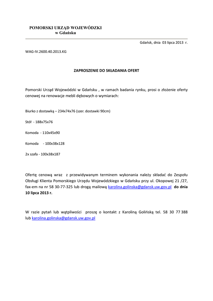 POMORSKI URZĄD WOJEWÓDZKI w Gdańsku Gdańsk, dnia 03 lipca 2013 r. WAG-IV.2600.40.2013.KG ZAPROSZENIE DO SKŁADANIA OFERT Pomorski Urząd Wojewódzki w Gdańsku , w ramach badania rynku, prosi o złożenie oferty cenowej na renowacje mebli dębowych o wymiarach: Biurko z dostawką – 234x74x76 (szer. dostawki 90cm) Stół - 188x75x76 Komoda - 110x45x90 Komoda - 100x38x128 2x szafa - 100x38x187 Ofertę cenową wraz z przewidywanym terminem wykonania należy składać do Zespołu Obsługi Klienta Pomorskiego Urzędu Wojewódzkiego w Gdańsku przy ul. Okopowej 21 /27, fax-em na nr 58 30-77-325 lub drogą mailową [email protected] do dnia 10 lipca 2013 r. W razie pytań lub wątpliwości proszę o kontakt z Karoliną Golińską tel. 58 30 77 388 lub [email protected]