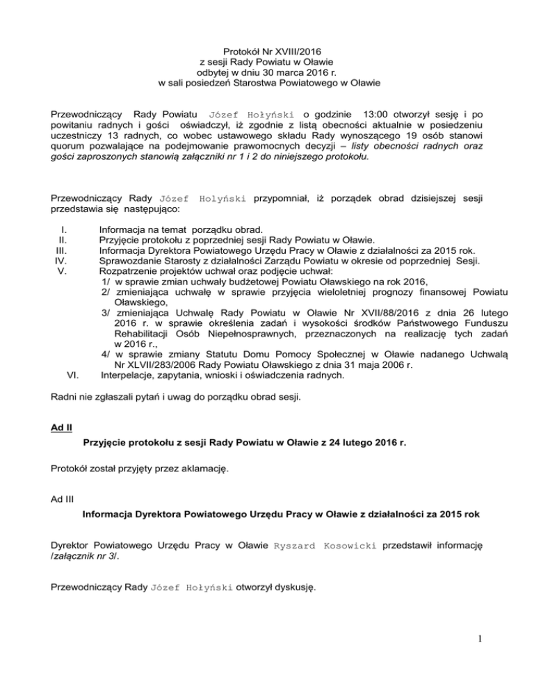 Protokół Nr XVIII/2016 z sesji Rady Powiatu w Oławie odbytej w dniu 30 marca 2016 r. w sali posiedzeń Starostwa Powiatowego w Oławie Przewodniczący Rady Powiatu Józef Hołyński o godzinie 13:00 otworzył sesję i po powitaniu radnych i gości oświadczył, iż zgodnie z listą obecności aktualnie w posiedzeniu uczestniczy 13 radnych, co wobec ustawowego składu Rady wynoszącego 19 osób stanowi quorum pozwalające na podejmowanie prawomocnych decyzji – listy obecności radnych oraz gości zaproszonych stanowią załączniki nr 1 i 2 do niniejszego protokołu. Przewodniczący Rady Józef przedstawia się następująco: I. II. III. IV. V. VI. Holyński przypomniał, iż porządek obrad dzisiejszej sesji Informacja na temat porządku obrad. Przyjęcie protokołu z poprzedniej sesji Rady Powiatu w Oławie. Informacja Dyrektora Powiatowego Urzędu Pracy w Oławie z działalności za 2015 rok. Sprawozdanie Starosty z działalności Zarządu Powiatu w okresie od poprzedniej Sesji. Rozpatrzenie projektów uchwał oraz podjęcie uchwał: 1/ w sprawie zmian uchwały budżetowej Powiatu Oławskiego na rok 2016, 2/ zmieniająca uchwałę w sprawie przyjęcia wieloletniej prognozy finansowej Powiatu Oławskiego, 3/ zmieniająca Uchwalę Rady Powiatu w Oławie Nr XVII/88/2016 z dnia 26 lutego 2016 r. w sprawie określenia zadań i wysokości środków Państwowego Funduszu Rehabilitacji Osób Niepełnosprawnych, przeznaczonych na realizację tych zadań w 2016 r., 4/ w sprawie zmiany Statutu Domu Pomocy Społecznej w Oławie nadanego Uchwalą Nr XLVII/283/2006 Rady Powiatu Oławskiego z dnia 31 maja 2006 r. Interpelacje, zapytania, wnioski i oświadczenia radnych. Radni nie zgłaszali pytań i uwag do porządku obrad sesji. Ad II Przyjęcie protokołu z sesji Rady Powiatu w Oławie z 24 lutego 2016 r. Protokół został przyjęty przez aklamację. Ad III Informacja Dyrektora Powiatowego Urzędu Pracy w Oławie z działalności za 2015 rok Dyrektor Powiatowego Urzędu Pracy w Oławie Ryszard Kosowicki przedstawił informację /załącznik nr 3/. Przewodniczący Rady Józef Hołyński otworzył dyskusję. 1 Radni nie zgłaszali pytań w powyższym punkcie. Ad IV Sprawozdanie Starosty z działalności Zarządu Powiatu w okresie od poprzedniej Sesji. Starosta Oławski Zdzisław Brezdeń przedstawił sprawozdanie /załącznik nr 4/. Przewodniczący Rady Józef Hołyński otworzył dyskusję. O udzielenie głosu poprosił radny Wawrzyniec Wlazło, który poprosił o wyjaśnienia w kwestii zatwierdzenia przez Zarząd wysokości dotacji na 1 ucznia/słuchacza szkół niepublicznych o uprawnieniach szkól publicznych na rok 2016 w Szkole Policealnej dla Dorosłych, Liceum Ogólnokształcącego dla Dorosłych oraz Ośrodka Rewalidacyjnego Krok po Kroku. Radny zapytał na jaki okres przyznawane są ustalone kwoty dotacji? Wicestarosta Bożena Worek odpowiedziała, iż są to miesięczne dotacje. Następnie głos został udzielony radnej Annie Leszczyńskiej, która zapytała o główne założenia i cele programu „Aktywny Samorząd”. Starosta Zdzisław Brezdeń wyjaśnił, iż pilotażowy program Aktywny Samorząd wymagał określenia przez Zarząd Powiatu zasad rozpatrywania wniosków. Następnie starosta poprosił dyrektora Powiatowego Centrum Pomocy Rodzinie w Oławie o omówienie głównych założeń programu. Dyrektor PCPR w Oławie Małgorzata Trybułowska na wstępie poinformowała, iż program Aktywny Samorząd jest realizowany od 2012 r. i składa się z dwóch modułów. Pierwszy moduł umożliwia np. uzyskanie dofinansowania na dziecko, które przebywa w przedszkolu, ponieważ rodzic jest aktywny zawodowo. Ponadto umożliwia m.in. dofinansowania do sprzętu elektronicznego dla osób niedowidzących i niewidomych. Moduł drugi obejmuje pomoc finansową dla osób niepełnosprawnych, które studiują. Radna Anna Leszczyńska zapytała, czy środki finansowe są wystarczające oraz czy istnieje możliwość przesuwania środków w ramach dwóch modułów. Dyrektor PCPR odpowiedziała, iż środki są wystarczające lecz istnieje również możliwość dokonywania przesunięć. W kolejności głos został udzielony radnemu Franciszkowi Październikowi, który mając na uwadze wizytę Minister Edukacji w Oławie, zapytał, czy na spotkanie z Panią Minister zostali również zaproszeni przedstawiciele pozostałych samorządów? 2 Starosta Zdzisław Brezdeń w odpowiedzi poinformował, iż Pani Minister Edukacji nie uczestniczyła w posiedzeniu Zarządu Powiatu, dlatego też nie uwzględniono w sprawozdaniu informacji na temat tej wizyty. Dalej wyjaśnił, iż wizyta Minister Edukacji w Oławie odbyła się w trybie nadzwyczajnym przy okazji obecności Pani Minister na konferencji we Wrocławiu i do końca nie było wiadomo, czy wizyta w Oławie dojdzie do skutku, z tego tez względu nie zaproszono na spotkanie przedstawicieli pozostałych samorządów. Na zakończenie starosta powiedział, że jeżeli w przyszłości zostanie zorganizowane spotkanie z Panią Minister w sposób formalny, nie widzi przeszkód, aby w takim spotkaniu uczestniczyli również przedstawiciele pozostałych samorządów. W dalszej części obrad o udzielenie głosu poprosiła radna Krystyna Cecko, która zapytała, czy tworzona klasa Liceum Ogólnokształcącego podnosząca sprawność fizyczną w Zespole Szkół w Jelczu-Laskowicach, to klasa m.in. dla absolwentów klasy gimnazjum o profilu piłka ręczna chcących kontynuować naukę? Radna zapytała, czy w tym roku zostanie również ogłoszony nabór do klasy o profilu piłka ręczna oraz czy uczniowie tych klas korzystają z internatu? W odpowiedzi radnej wicestarosta Bożena Worek poinformowała, iż klasa podnosząca sprawność fizyczną nie jest przewidziana dla gimnazjalistów z klasy sportowej o profilu piłka ręczna lecz dla młodzieży, która w przyszłości zamierza podjąć naukę w szkole policyjnej lub Akademii Wychowania Fizycznego. Kontynuując 