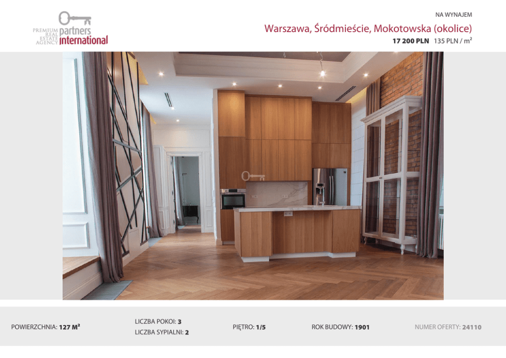 NA WYNAJEM Warszawa, Śródmieście, Mokotowska (okolice) 17 200 PLN 135 PLN / m² POWIERZCHNIA: 127 M² LICZBA POKOI: 3 LICZBA SYPIALNI: 2 PIĘTRO: 1/5 ROK BUDOWY: 1901 NUMER OFERTY: 24110 Opis ELEGANCKI APARTAMENT W REWITALIZOWANEJ KAMIENNICY PRZY UL. MOKOTOWSKIEJ, NIEOPODAL PL. ZBAWICIELA! UKŁAD POMIESZCZEŃ: – 2 sypialnie z garderobą – salon z kuchnią – 2 łazienki (jedna z wanną, druga z prysznicem) – pomieszczenie gospodarcze LOKALIZACJA: Nieruchomość zlokalizowana jest w jednej z najbardziej prestiżowych i malowniczych uliczek Śródmieścia nazywanej "Paryżem Warszawy". Przed wojną Mokotowska była ulubioną ulicą arystokracji i burżuazji, obecnie mieści niezliczoną ilość unikalnych kawiarenek i restauracji, a także ekskluzywnych butików. Ulicę Mokotowską uznaje się za najbardziej prestiżowy adres nie tylko w dzielnicy Śródmieścia. W bardzo bliskiej okolicy znajduje się Plac Trzech Krzyży, Park i Zamek Ujazdowski, Łazienki Królewskie oraz Nowy Świat. Miejsce to jest doskonale skomunikowane z resztą miasta. Pieszy dystans do autobusu, tramwaju oraz metra. DODATKOWE INFORMACJE: – 1 miejsce postojowe w garażu podziemnym – klimatyzacja – prywatna winda wjeżdżająca bezpośrednio do apartamentu – wysokość pomieszczeń: 3,80 m Kontakt: Edyta Balcerak 796 004 715 Pośrednik odpowiedzialny zawodowo Joanna Czapska : nr licencji 4585. Przedstawiona wyżej propozycja nie jest ofertą handlową w rozumieniu przepisów prawa lecz ma charakter informacyjny. Wszelkie dane dotyczące nieruchomości uzyskano na podstawie oświadczeń Sprzedających. Lokalizacja Image not found https://maps.googleapis.com/maps/api/staticmap?center=<br /> <b>Warning</b>: Illegal string offset 'lat' in <b>/wp-content/themes/partnersinternational/partials/pdf/templates/default/single-listing.php</b> on line <b>426</b><br /> ,<br /> <b>Warning</b>: Illegal string offset 'lng' in <b>/wp-content/themes/partnersinternational/partials/pdf/templates/default/single-listing.php</b> on line <b>426</b><br /> &zoom=12&size=800x425&scale=2&style=feature:all|element:all|visibility:simplified|saturation:-100&markers=color:red%7C<br /> <b>Warning</b>: Illegal string offset 'lat' in <b>/wp-content/themes/partnersinternational/partials/pdf/templates/default/single-listing.php</b> on line <b>426</b><br /> ,<br /> <b>Warning</b>: Illegal string offset 'lng' in <b>/wp-content/themes/partnersinternational/partials/pdf/templates/default/single-listing.php</b> on line <b>426</b><br /> Katarzyna Joanna Czapska Katarzyna Joanna Czapska Ul. Koszykowa 10/19 00-564 Warszawa tel. (+48 22) 646 52 02 fax: (+48 22) 646 26 99 partnersinternational.pl Pośrednik odpowiedzialny: EDYTA BALCERAK telefon: email: [email protected]