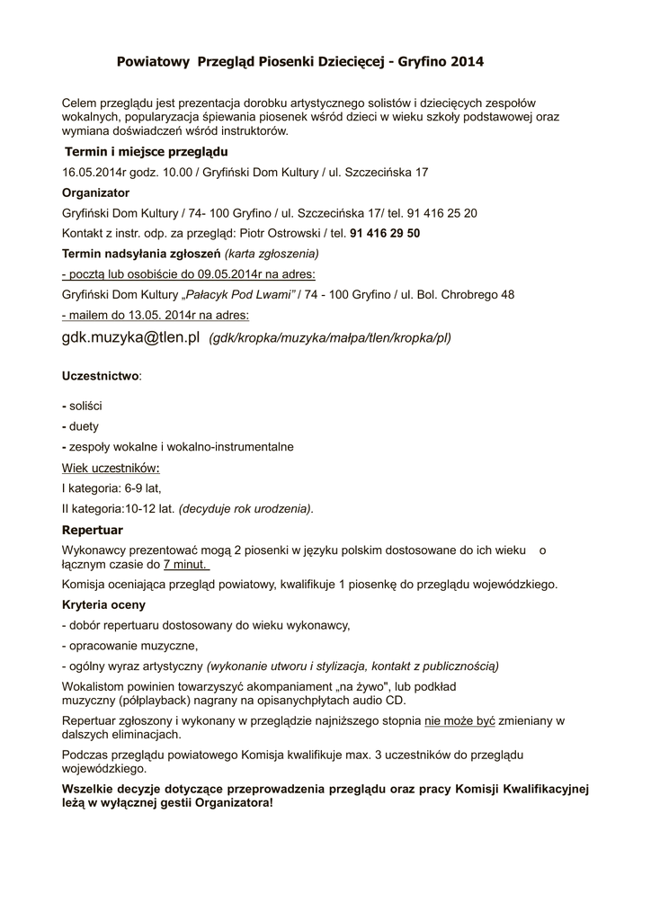 Powiatowy Przegląd Piosenki Dziecięcej - Gryfino 2014 Celem przeglądu jest prezentacja dorobku artystycznego solistów i dziecięcych zespołów wokalnych, popularyzacja śpiewania piosenek wśród dzieci w wieku szkoły podstawowej oraz wymiana doświadczeń wśród instruktorów. Termin i miejsce przeglądu 16.05.2014r godz. 10.00 / Gryfiński Dom Kultury / ul. Szczecińska 17 Organizator Gryfiński Dom Kultury / 74- 100 Gryfino / ul. Szczecińska 17/ tel. 91 416 25 20 Kontakt z instr. odp. za przegląd: Piotr Ostrowski / tel. 91 416 29 50 Termin nadsyłania zgłoszeń (karta zgłoszenia) - pocztą lub osobiście do 09.05.2014r na adres: Gryfiński Dom Kultury „Pałacyk Pod Lwami” / 74 - 100 Gryfino / ul. Bol. Chrobrego 48 - mailem do 13.05. 2014r na adres: [email protected] (gdk/kropka/muzyka/małpa/tlen/kropka/pl) Uczestnictwo: - soliści - duety - zespoły wokalne i wokalno-instrumentalne Wiek uczestników: I kategoria: 6-9 lat, II kategoria:10-12 lat. (decyduje rok urodzenia). Repertuar Wykonawcy prezentować mogą 2 piosenki w języku polskim dostosowane do ich wieku łącznym czasie do 7 minut. o Komisja oceniająca przegląd powiatowy, kwalifikuje 1 piosenkę do przeglądu wojewódzkiego. Kryteria oceny - dobór repertuaru dostosowany do wieku wykonawcy, - opracowanie muzyczne, - ogólny wyraz artystyczny (wykonanie utworu i stylizacja, kontakt z publicznością) Wokalistom powinien towarzyszyć akompaniament „na Ŝywo", lub podkład muzyczny (półplayback) nagrany na opisanychpłytach audio CD. Repertuar zgłoszony i wykonany w przeglądzie najniŜszego stopnia nie moŜe być zmieniany w dalszych eliminacjach. Podczas przeglądu powiatowego Komisja kwalifikuje max. 3 uczestników do przeglądu wojewódzkiego. Wszelkie decyzje dotyczące przeprowadzenia przeglądu oraz pracy Komisji Kwalifikacyjnej leŜą w wyłącznej gestii Organizatora!